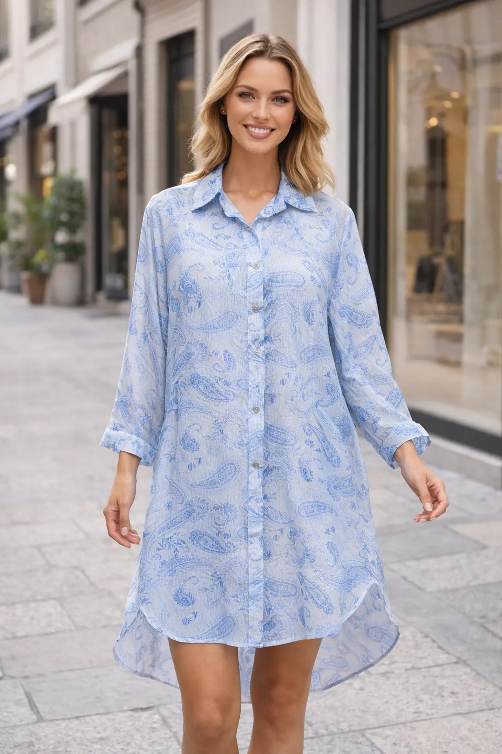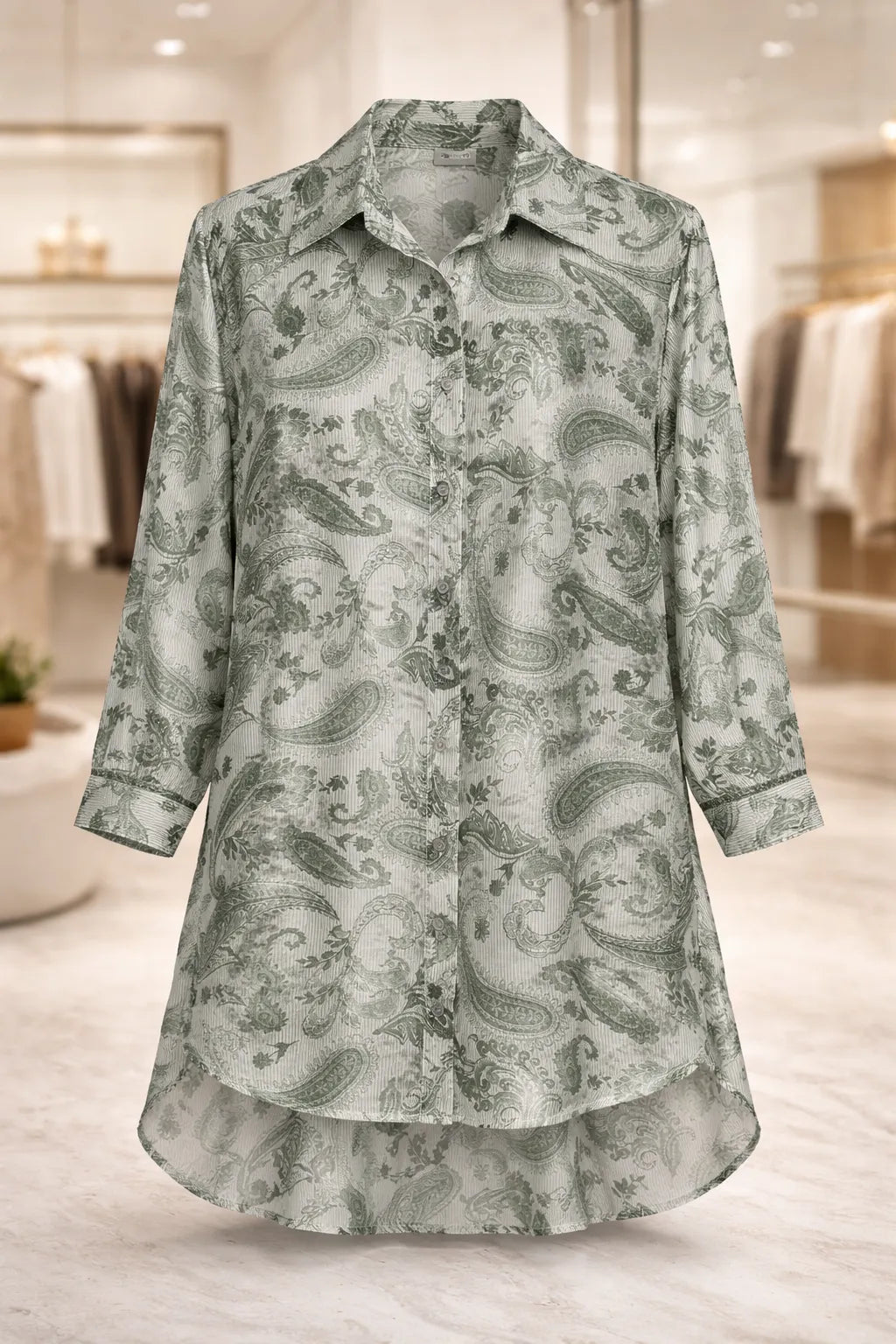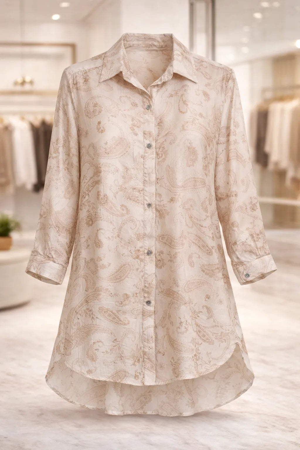 Add effortless elegance to your boutique collection with this Italian women’s paisley dip hem shirt, crafted from a premium Tencel blend fabric for a soft, lightweight, and breathable feel.