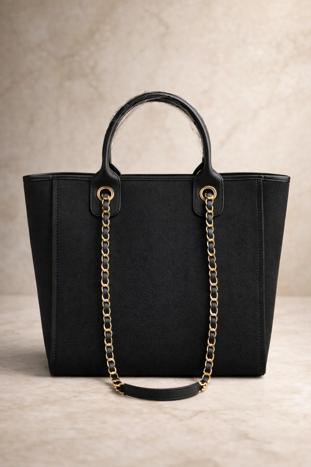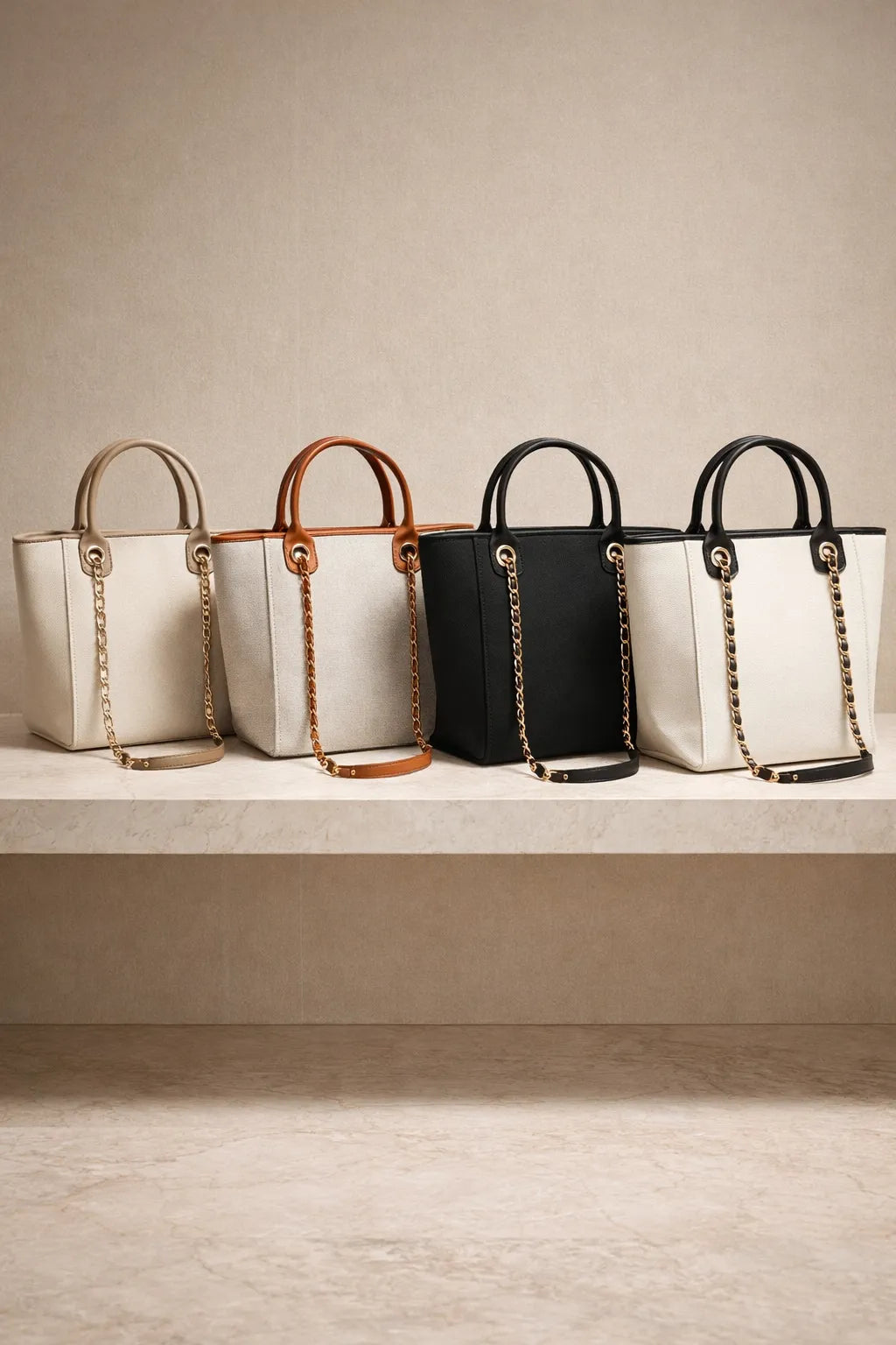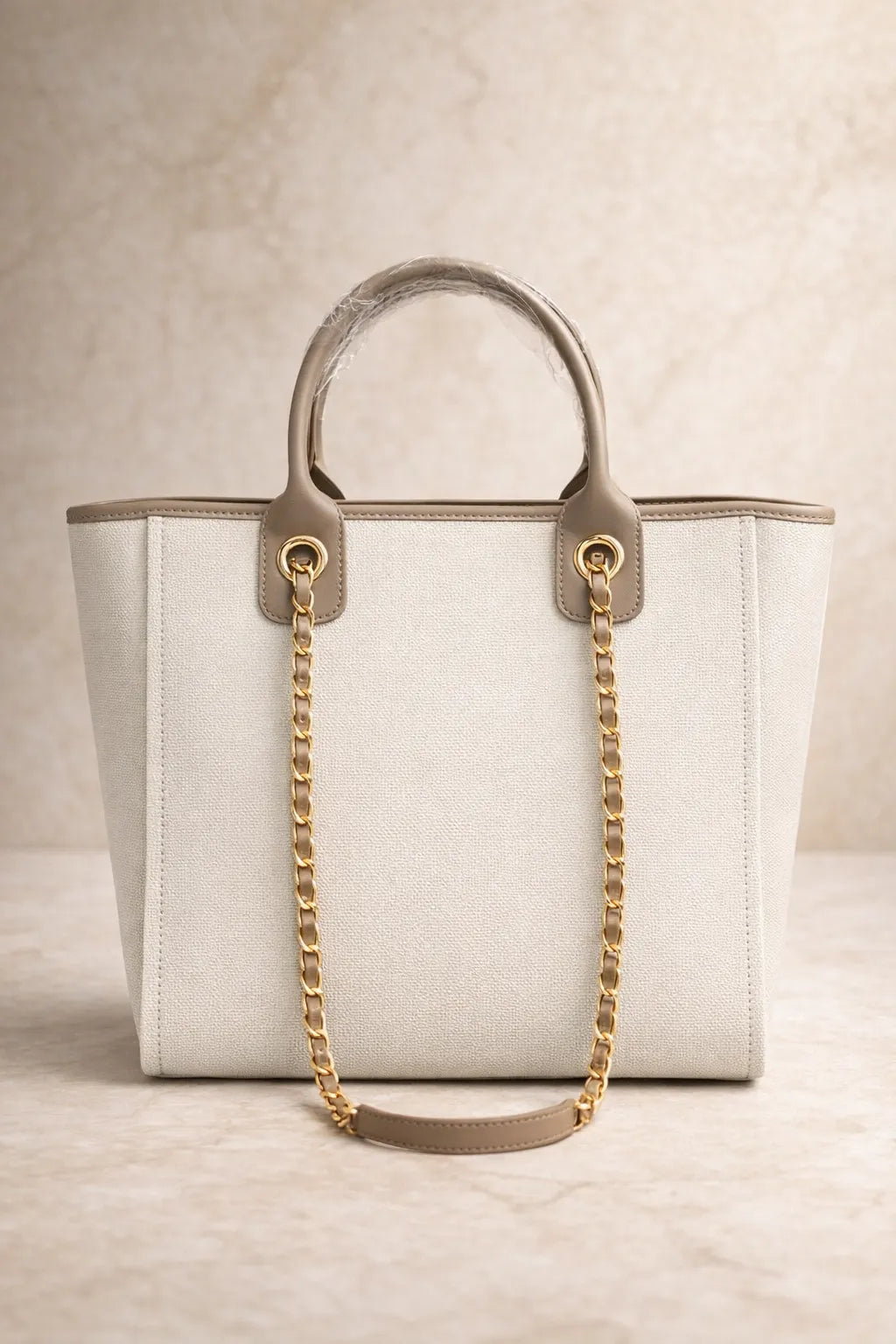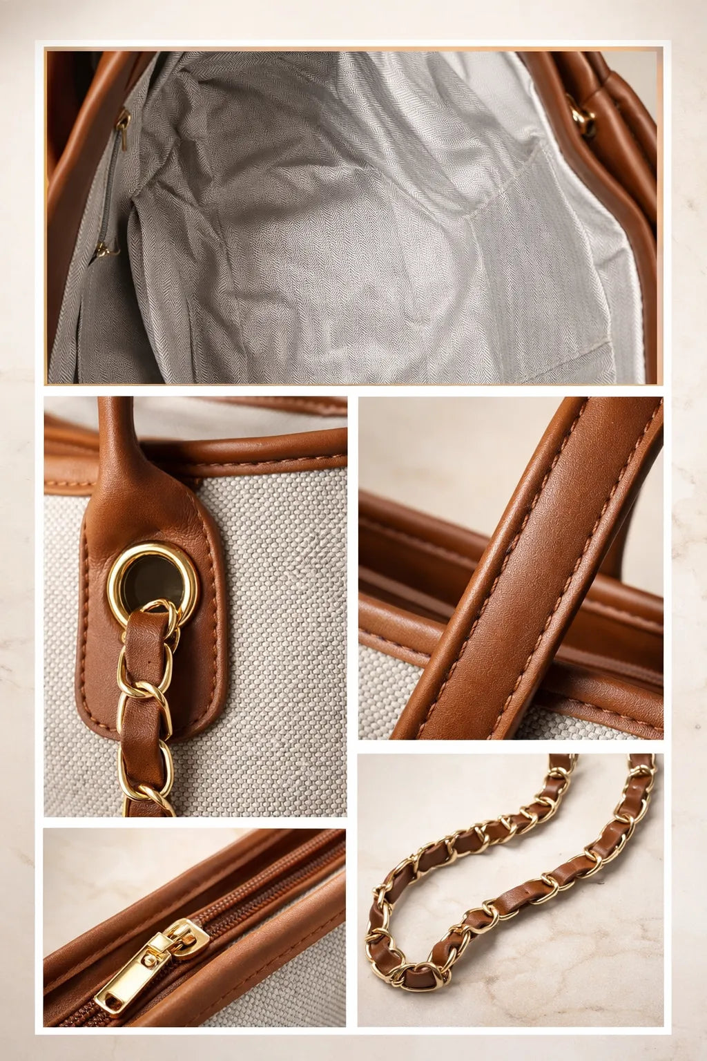 Upgrade your everyday style with this luxury canvas tote bag with tan leather-look trim and gold chain strap. Designed for women who need both style and space, this elegant handbag is perfect for holidays, shopping, work, or daily use.