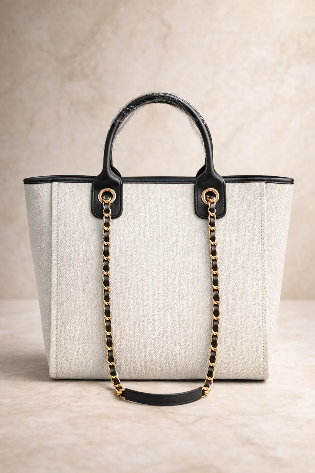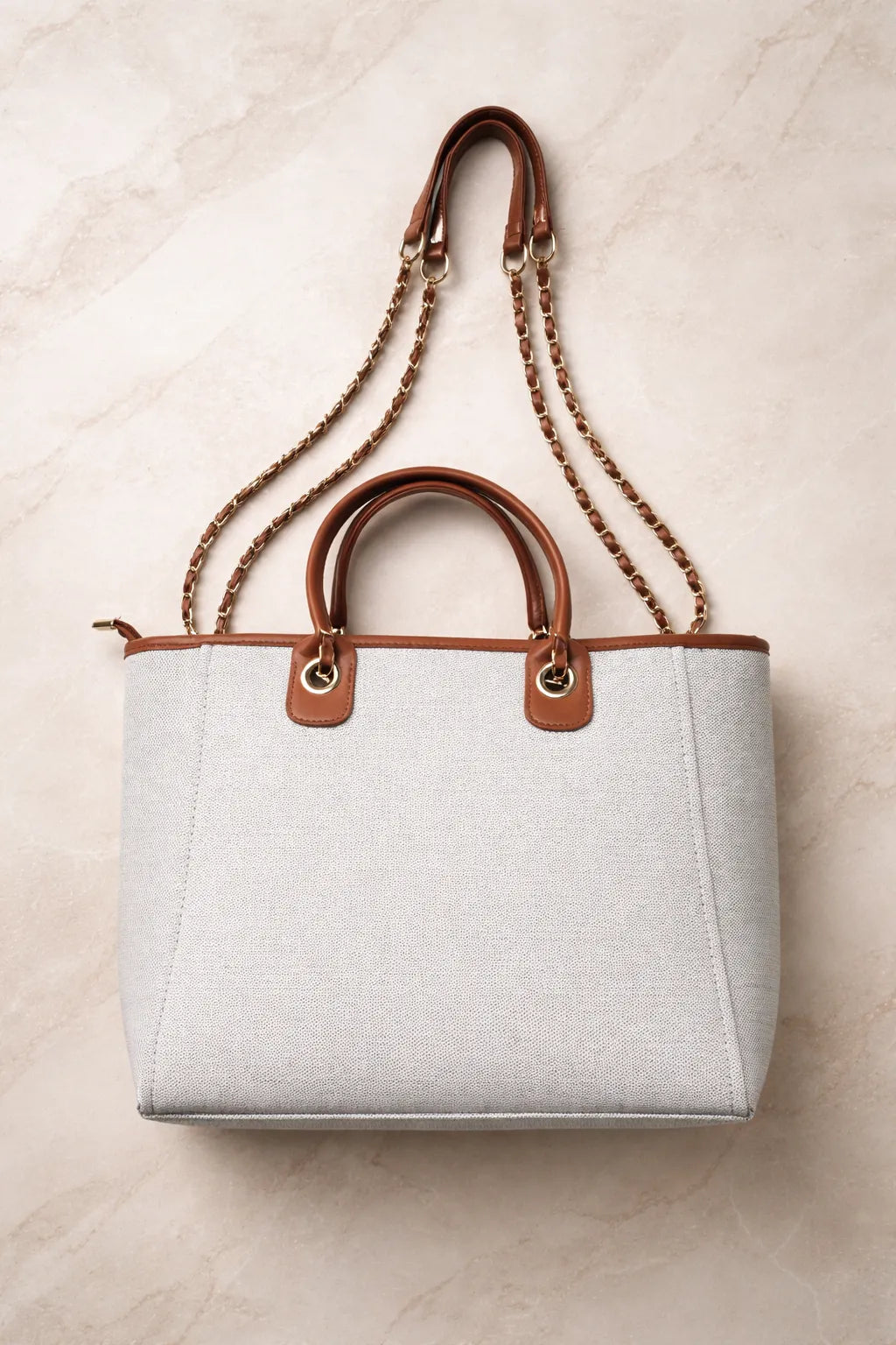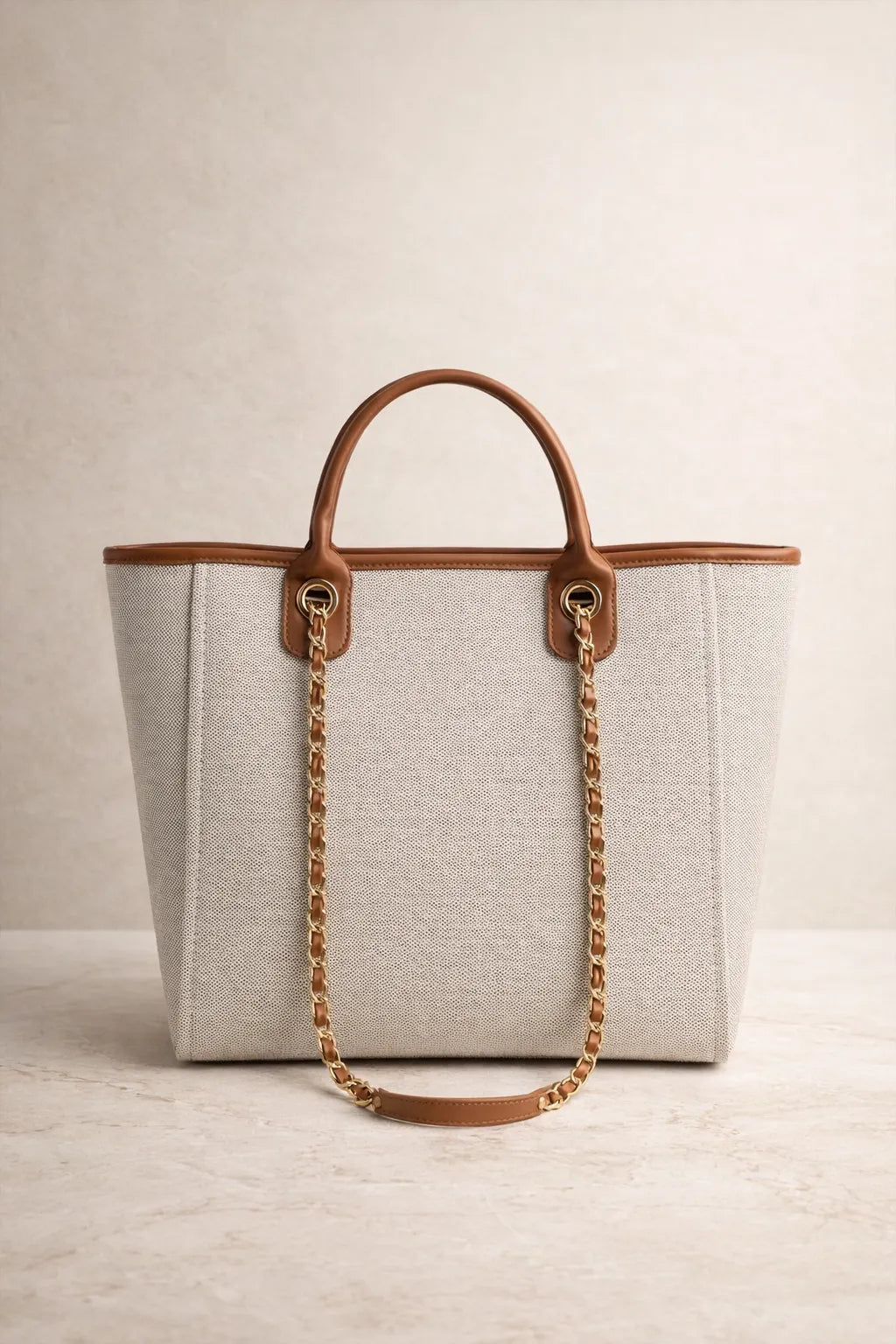 The structured canvas body combined with premium tan handles and chain shoulder strap creates a sophisticated look that pairs effortlessly with casual and smart outfits.