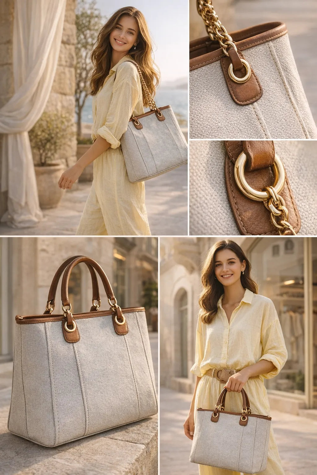 ✔ Detachable gold chain shoulder strap for versatile styling ✔ Premium canvas fabric body ✔ Elegant tan leather-look handles and trim ✔ Spacious interior for daily essentials ✔ Perfect handbag for holidays, shopping, and everyday use