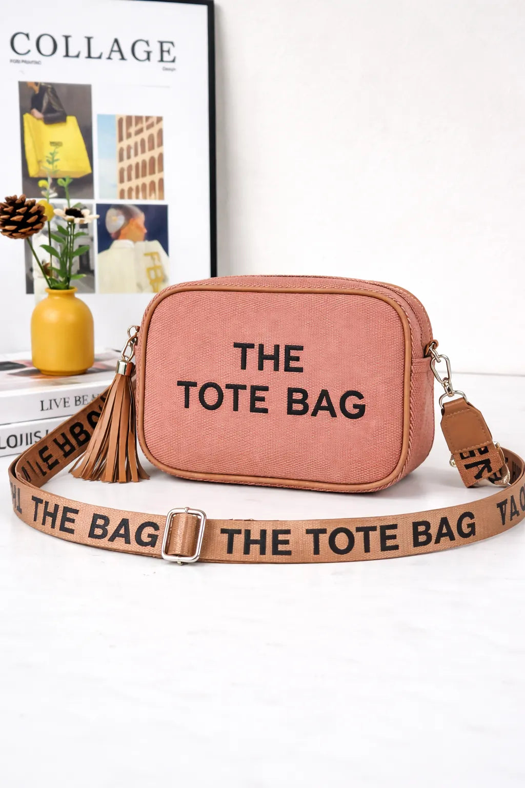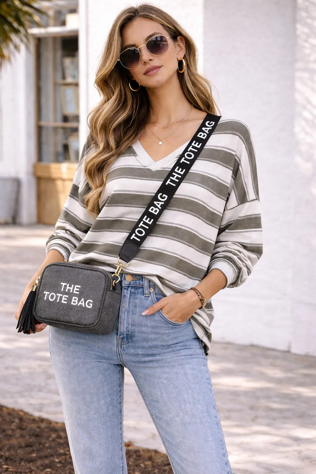 The compact rectangular silhouette is finished with bold “THE TOTE BAG” text, a wide adjustable branded crossbody strap, and a decorative fringe tassel on one side, adding subtle movement and character. Styled with our Italian V-Neck Soft Knit High-Low Top, this handbag pairs seamlessly with relaxed and contemporary outfits.