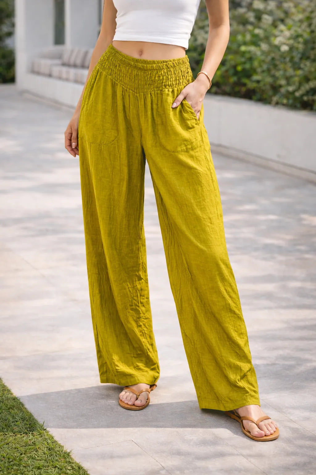 Lime  Smocked Elasticated Waist Flap Pocket Wide Leg Trousers