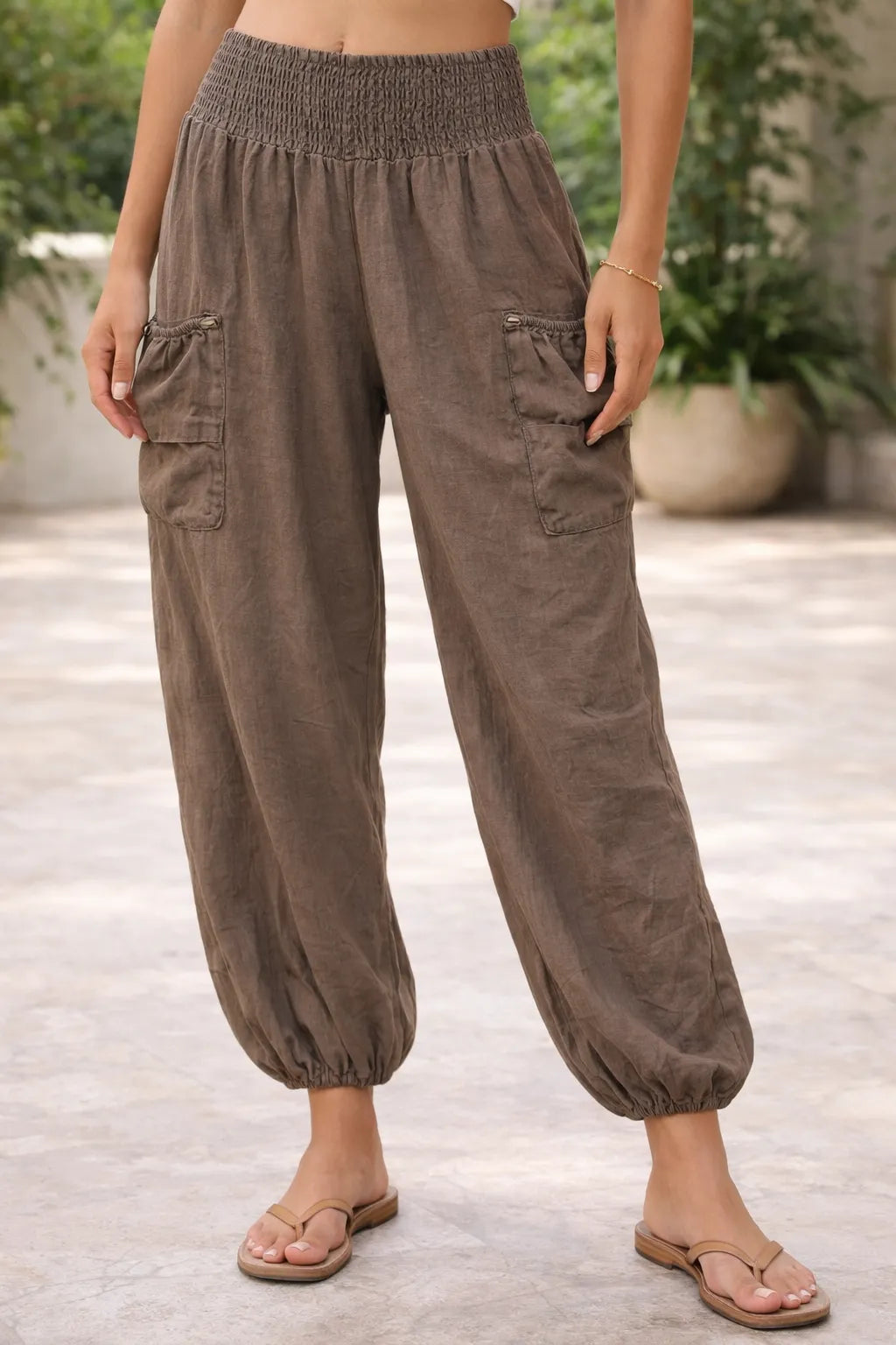 These Italian shirred elasticated waist trousers are crafted from 100% lightweight viscose, offering breathable comfort with a relaxed yet structured fit. Designed with front pockets, elasticated hem pockets, and cuffed ankles, they deliver a modern utility look that is both practical and fashion-forward.