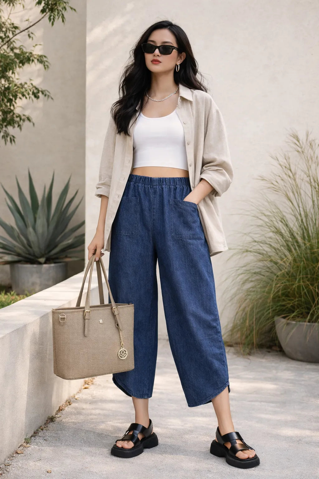 Our model pairs these oversized denim trousers with items from our handbag collections, including the Womens Structured Tote Bag – Modern Everyday Shoulder Bag.