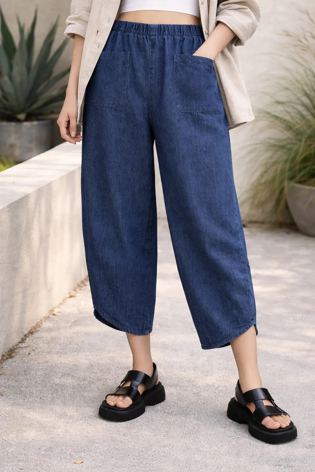 Italian Womens Elasticated Waist Oversized Tapered Denim Trousers