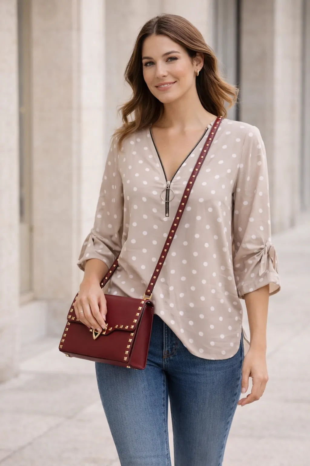 Our model styles this studded crossbody bag with the Italian Women’s Polka Dot Tunic featuring a functional zip-up and down neckline, creating an effortlessly chic look that transitions from day to evening. Pair it with pieces from our top collections to complete a confident, fashion-forward outfit.