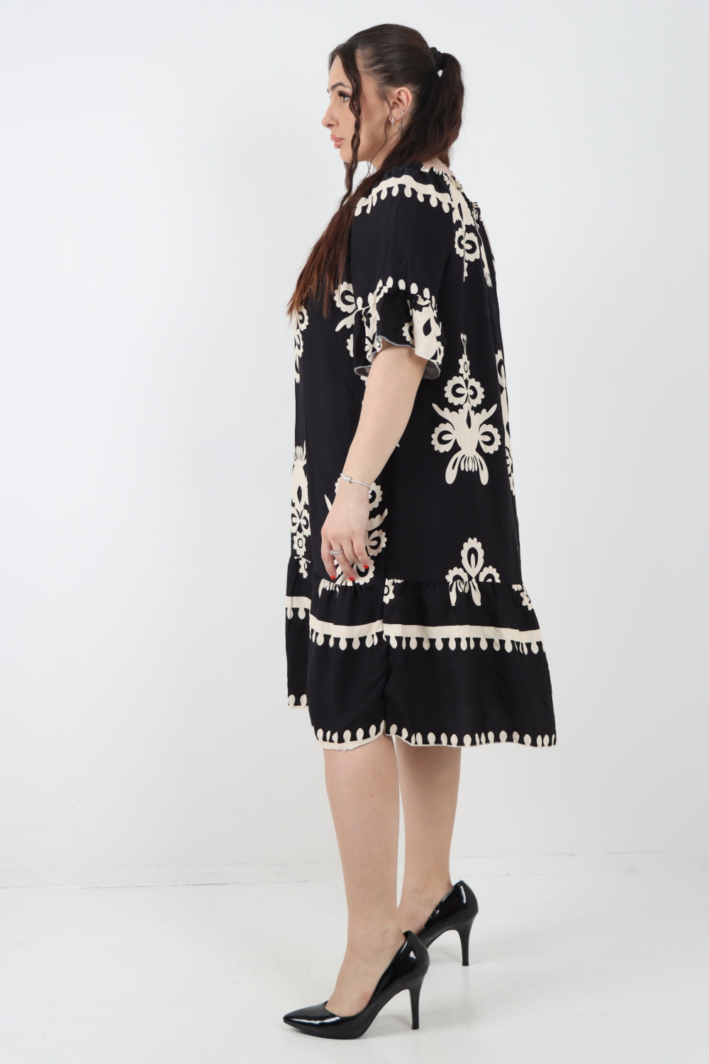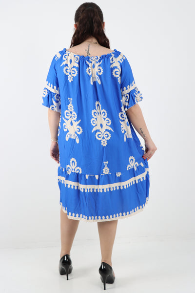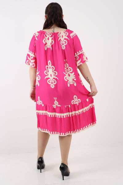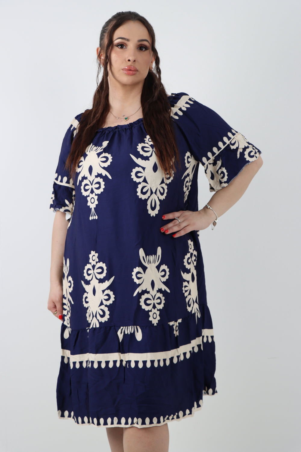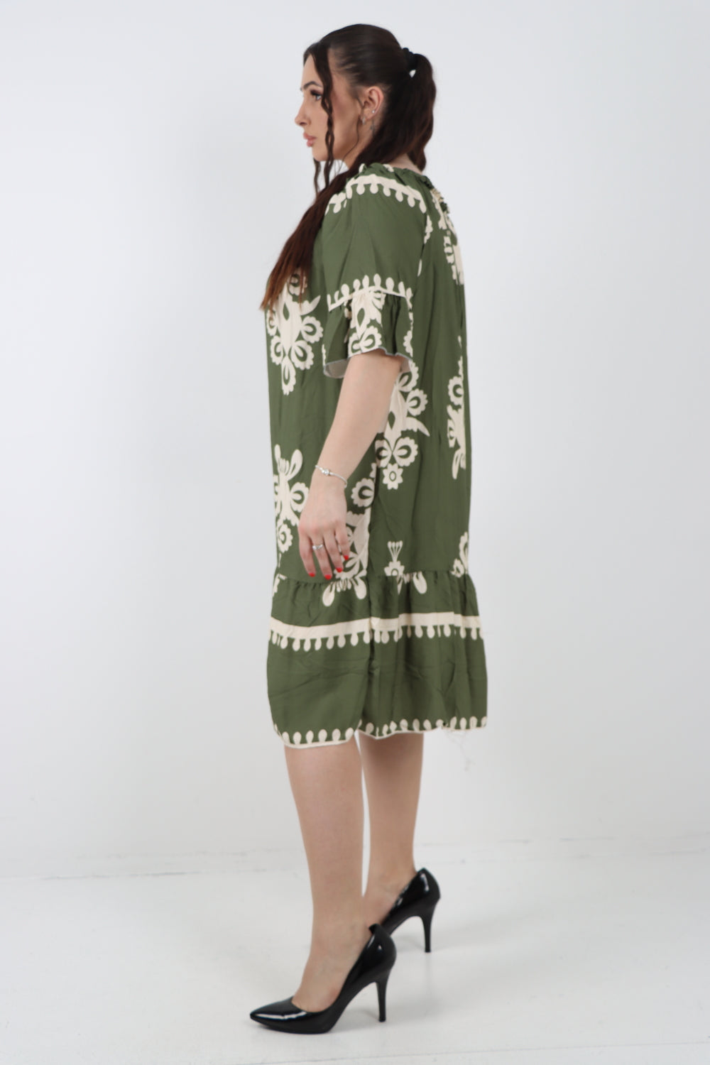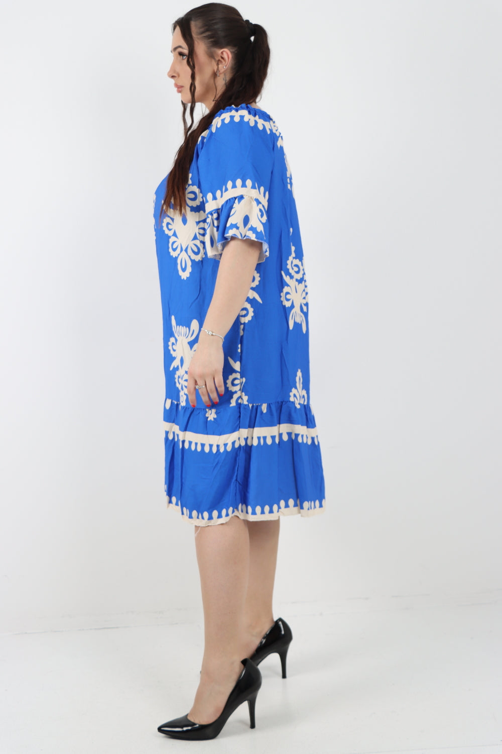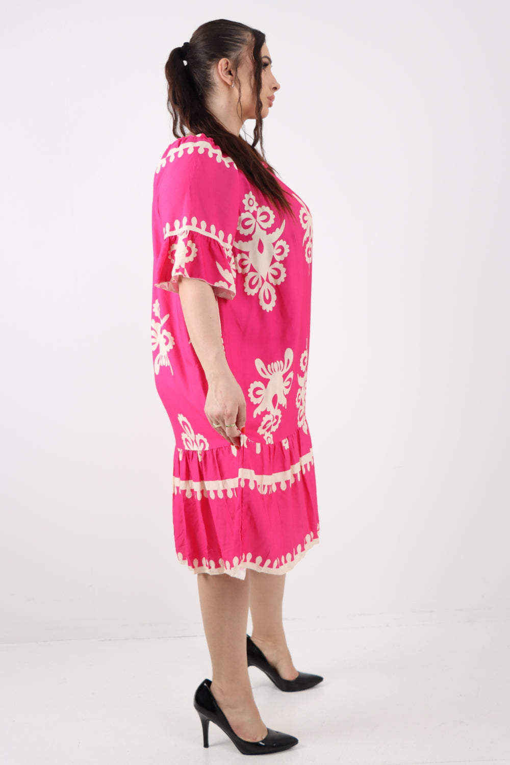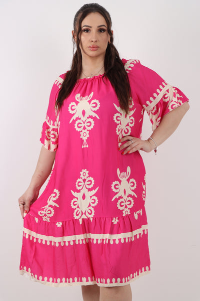 Easy to wear and easy to sell, this printed midi smock dress works well for UK fashion brands stocking light, everyday dresses. The loose fit makes it comfy for all-day wear, and the all-over print adds colour to your summer rails. Its frill hem gives it a fun edge, and the half sleeves give just enough arm cover for women across age groups.