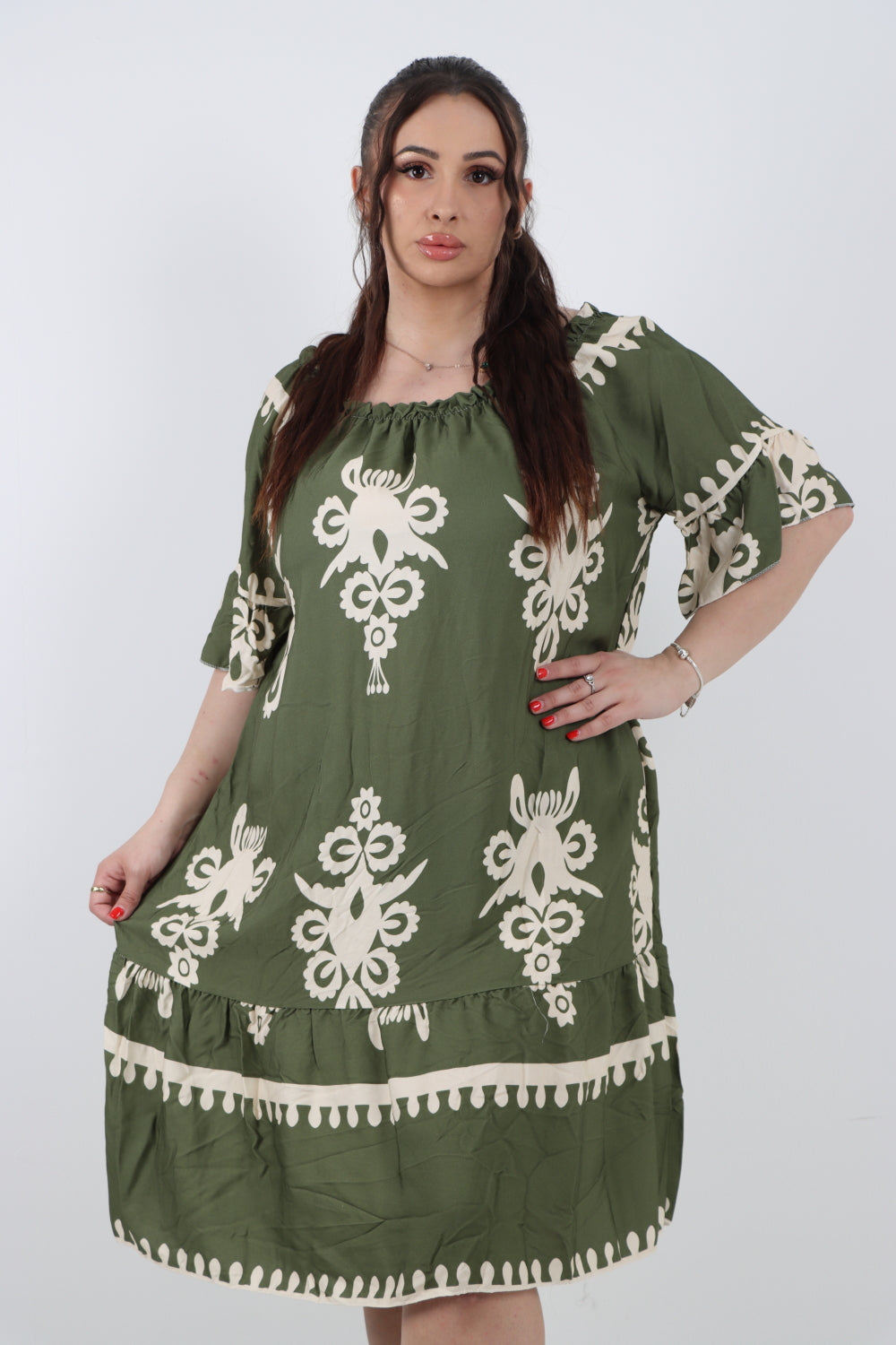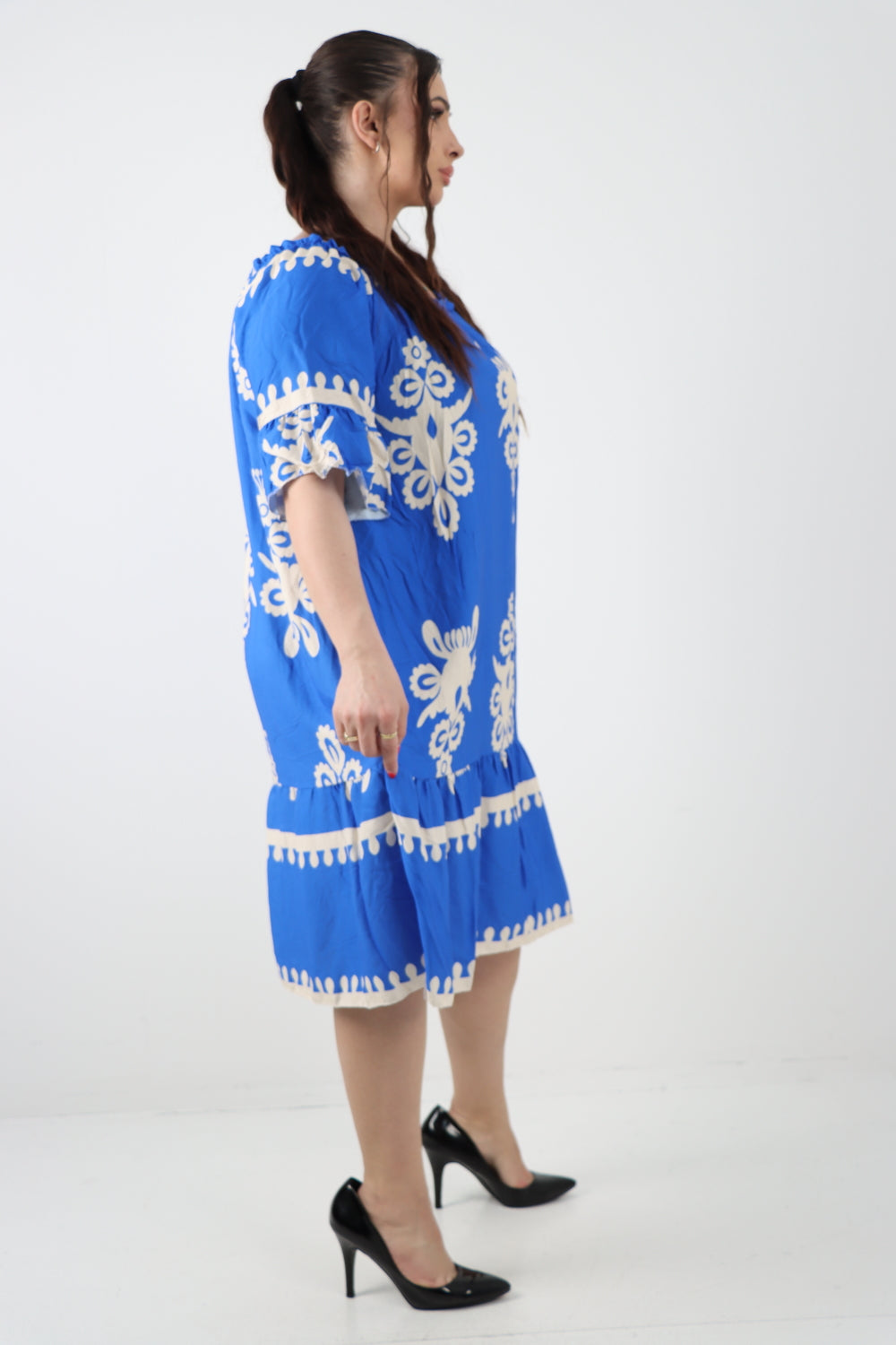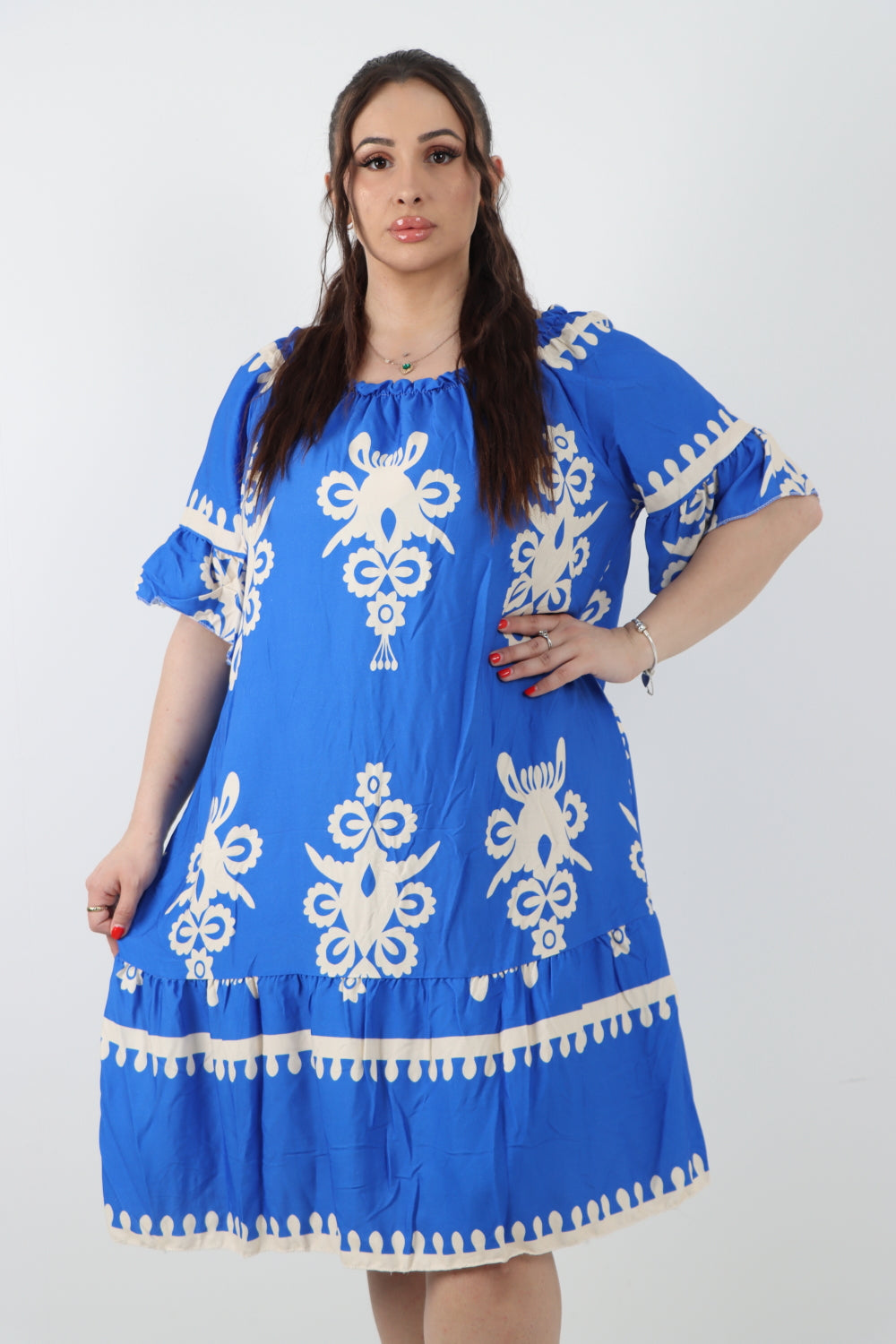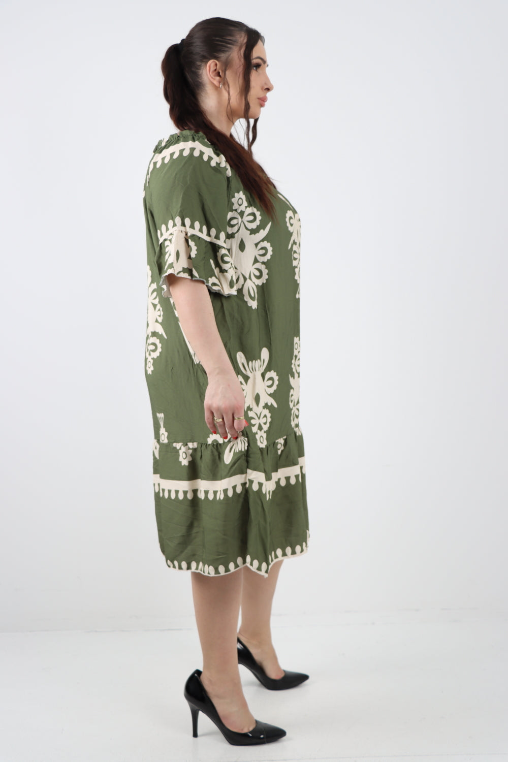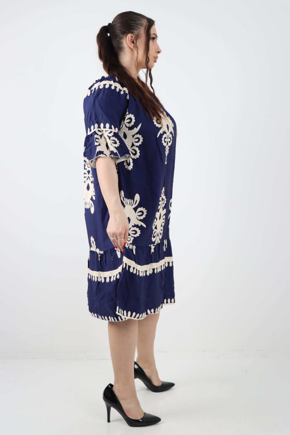 Easy to wear and easy to sell, this printed midi smock dress works well for UK fashion brands stocking light, everyday dresses. The loose fit makes it comfy for all-day wear, and the all-over print adds colour to your summer rails. Its frill hem gives it a fun edge, and the half sleeves give just enough arm cover for women across age groups.