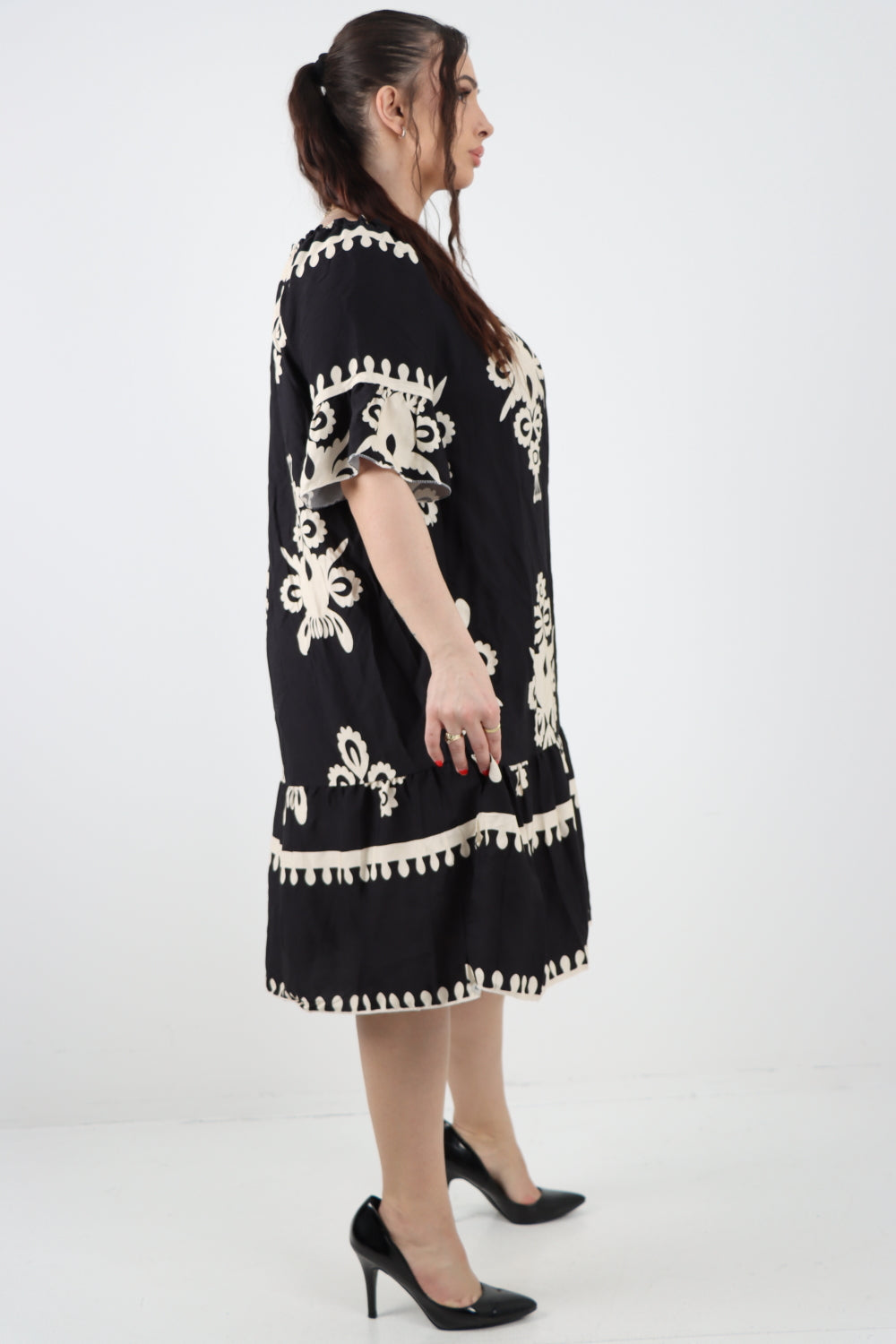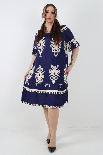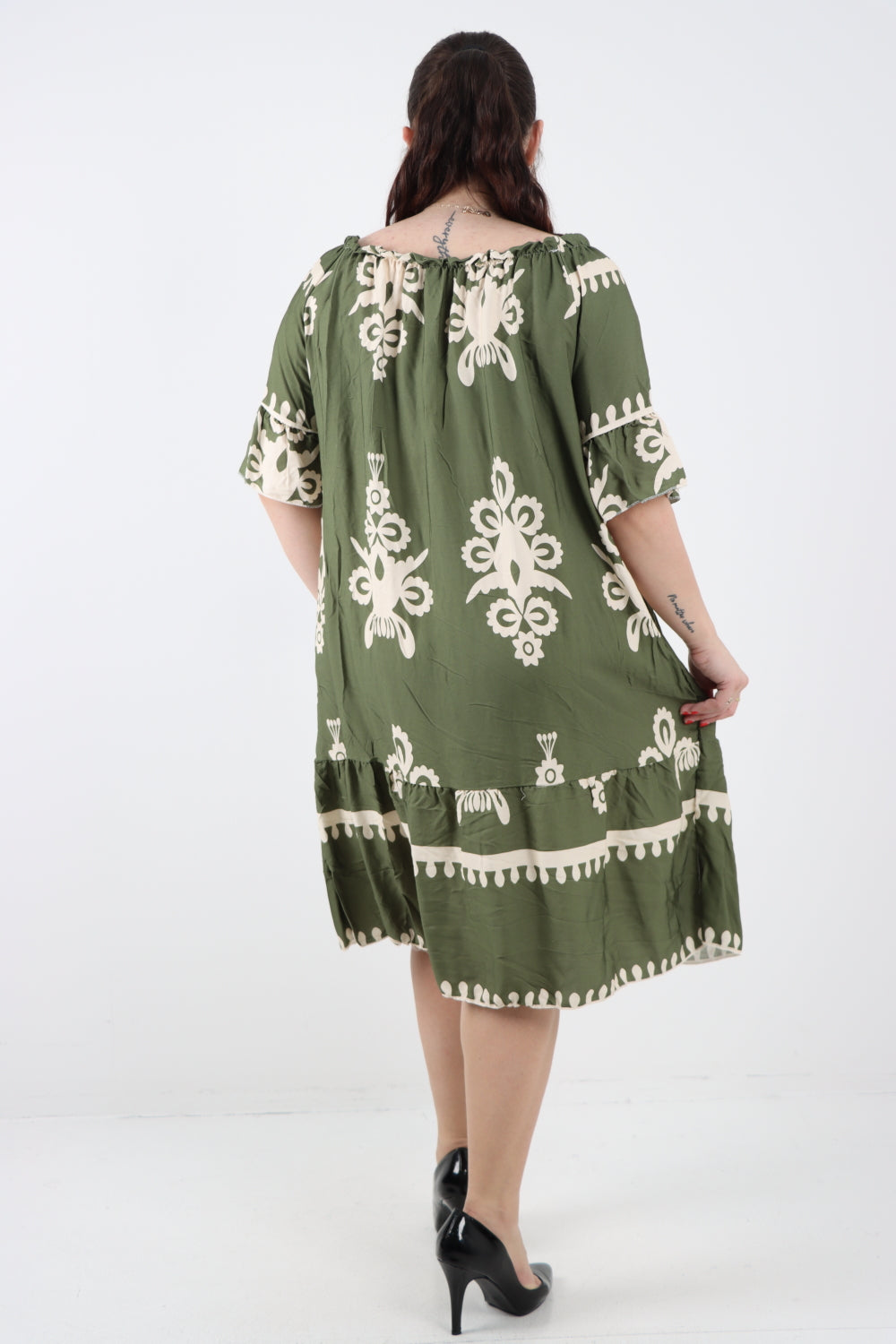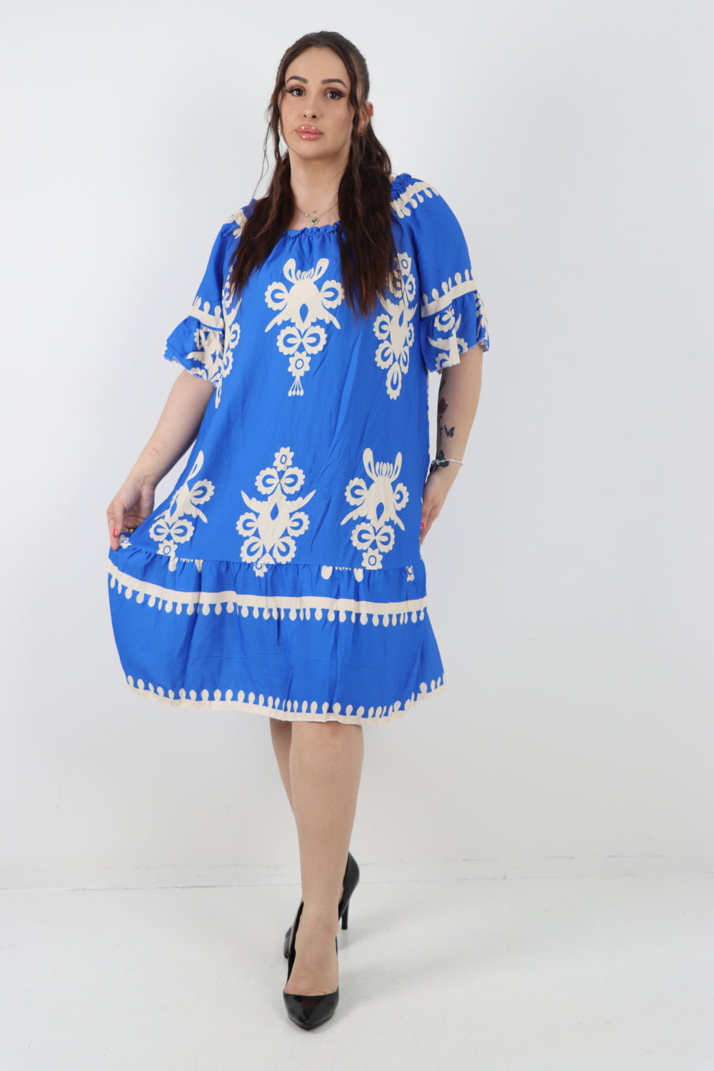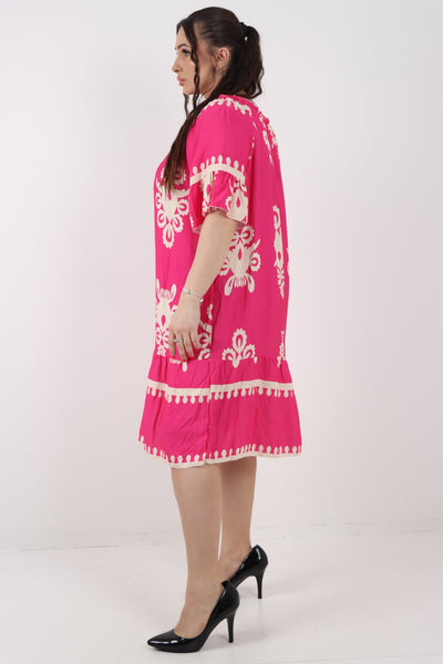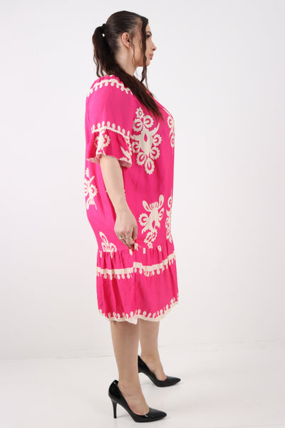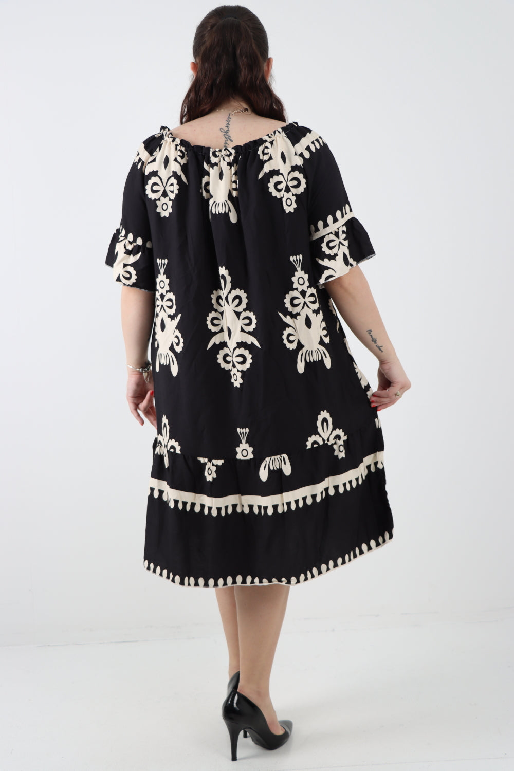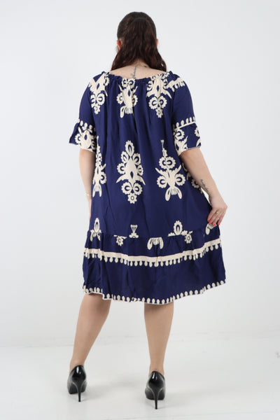 Easy to wear and easy to sell, this printed midi smock dress works well for UK fashion brands stocking light, everyday dresses. The loose fit makes it comfy for all-day wear, and the all-over print adds colour to your summer rails. Its frill hem gives it a fun edge, and the half sleeves give just enough arm cover for women across age groups.