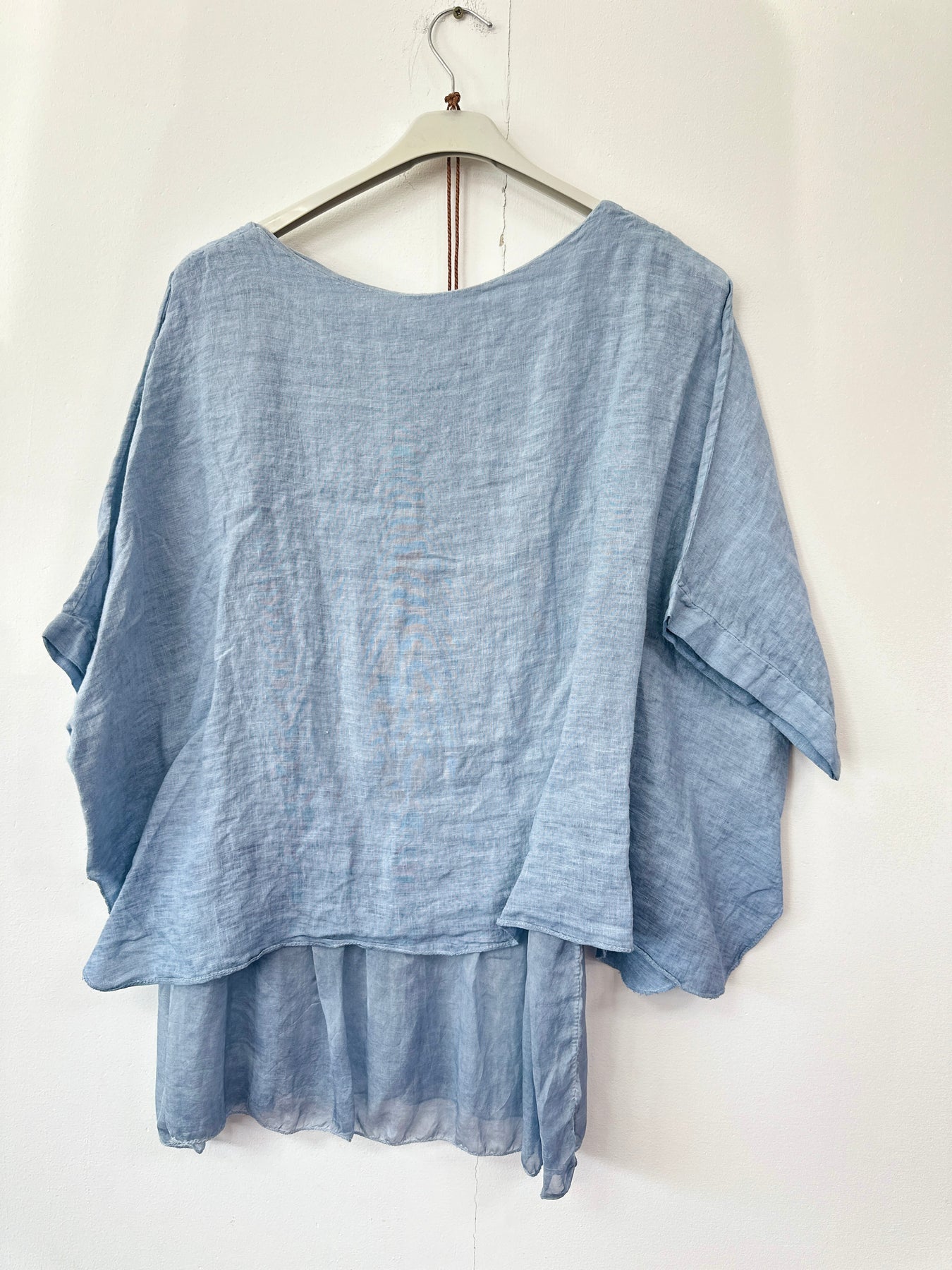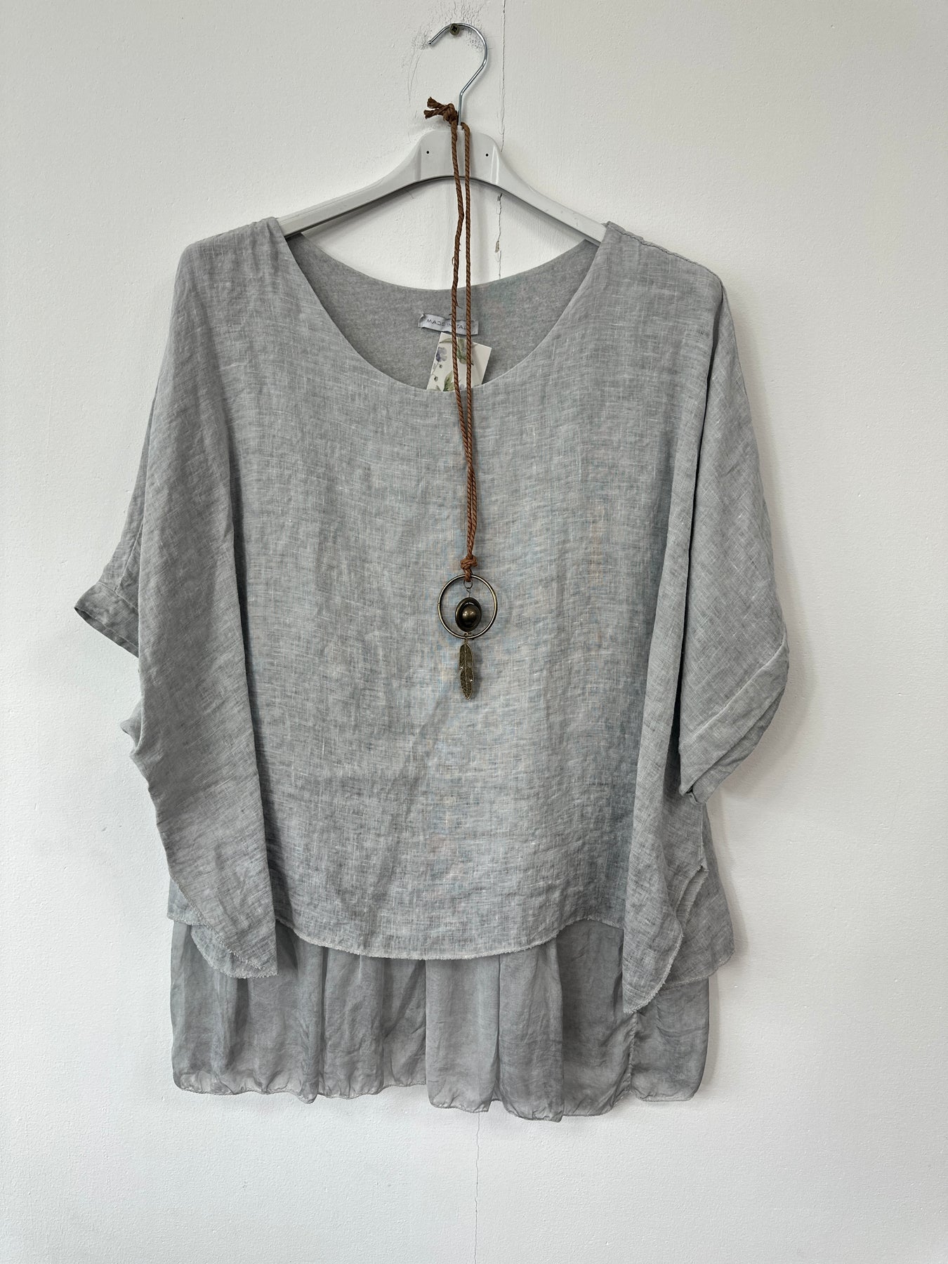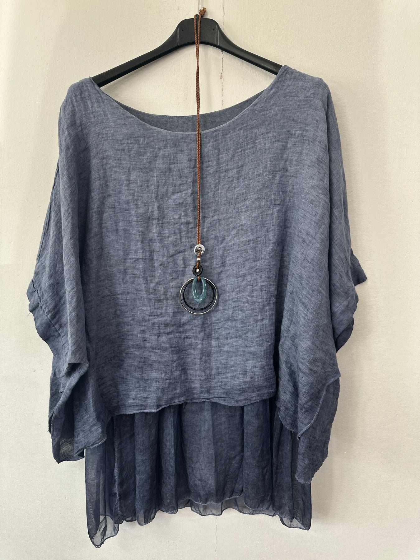 Soft layers bring something special to boutique rails. This Italian linen top gives a fresh, floaty look that feels light for warmer weather. The layered hem creates an easy shape that works well for all ages. The matching necklace adds an extra touch that makes the piece stand out.