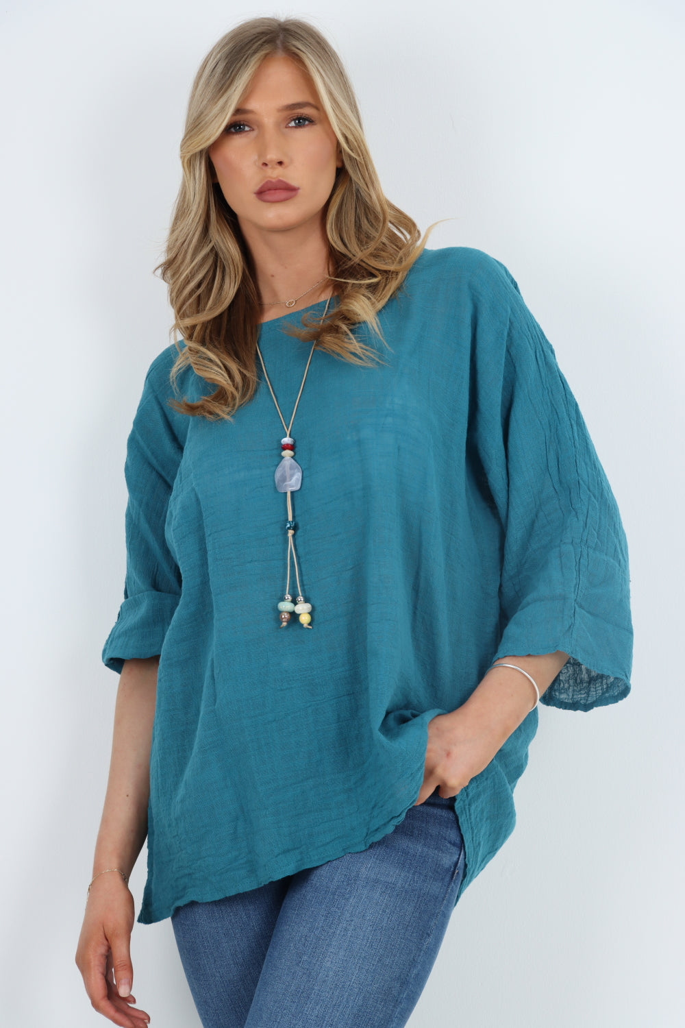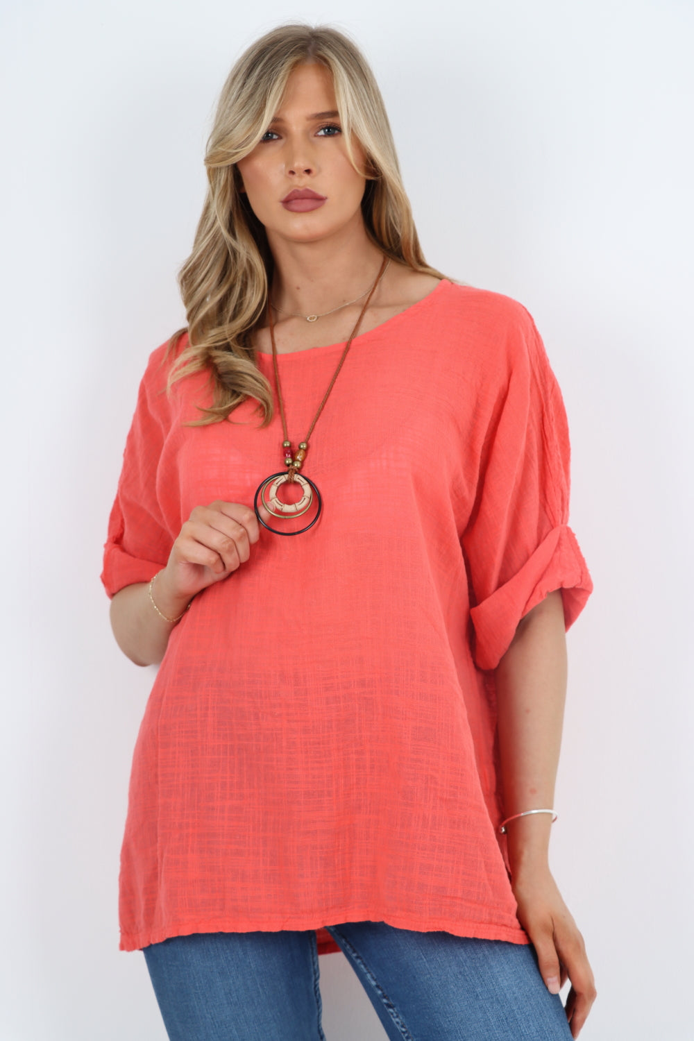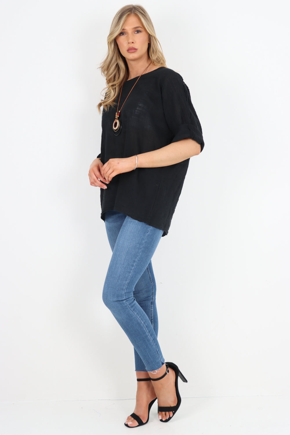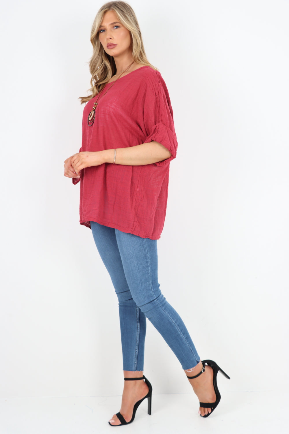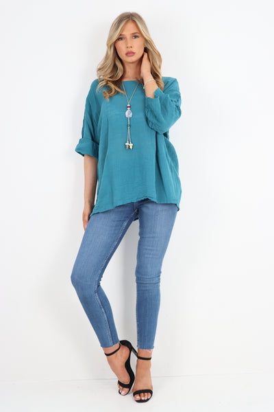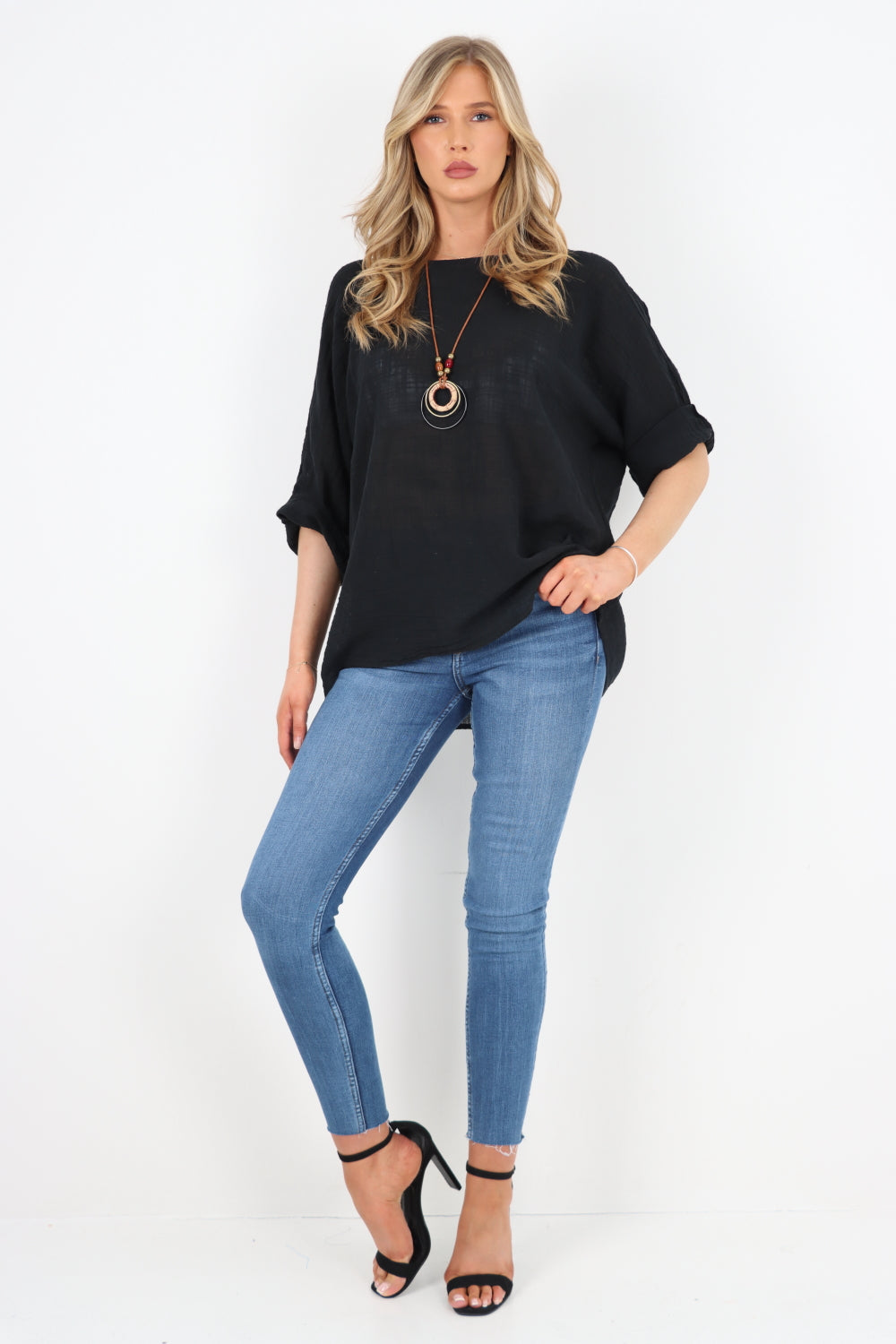 Made In Italy Lagenlook Plain Necklace Cotton Turn Up Sleeve Top