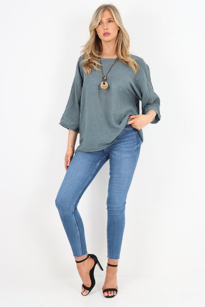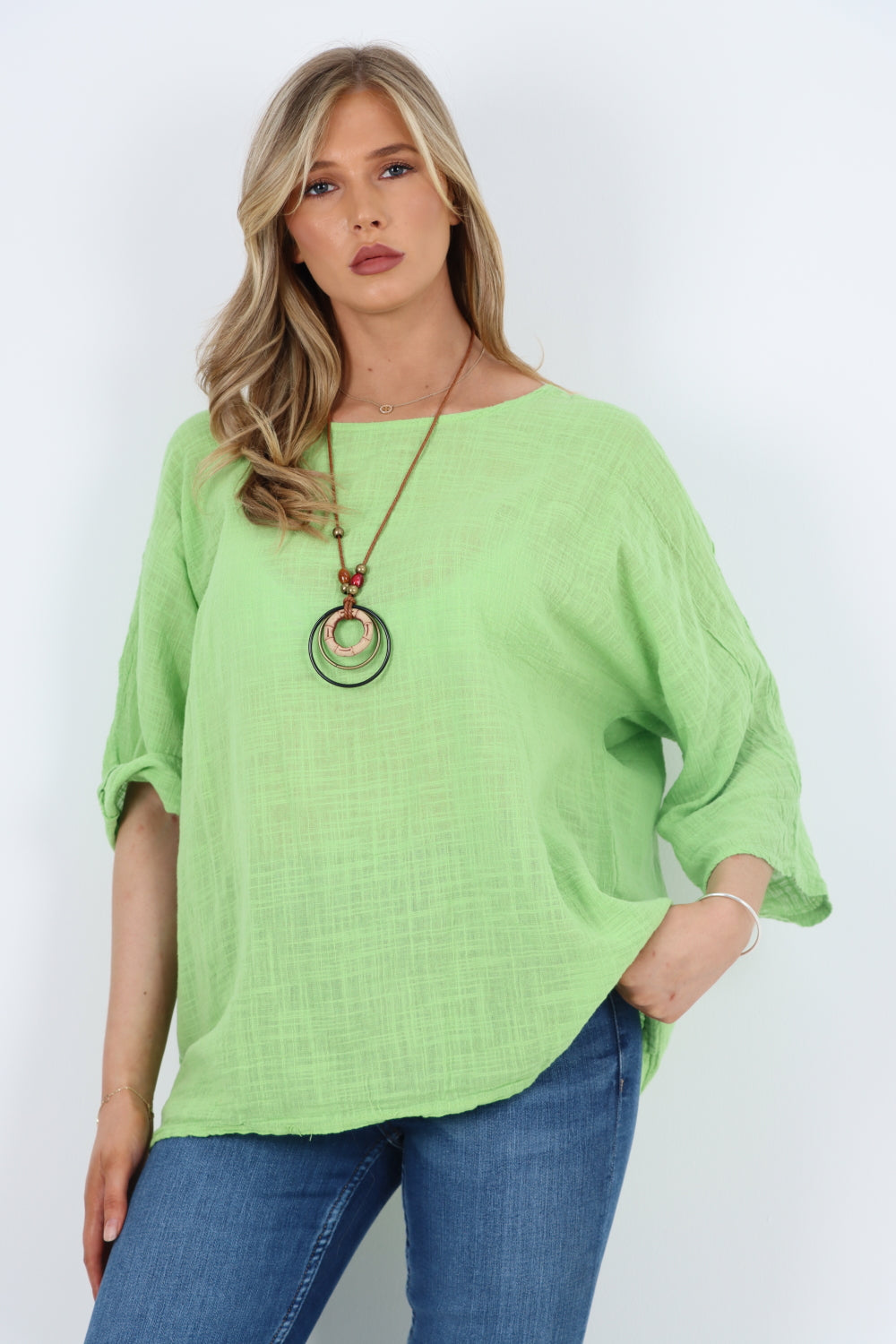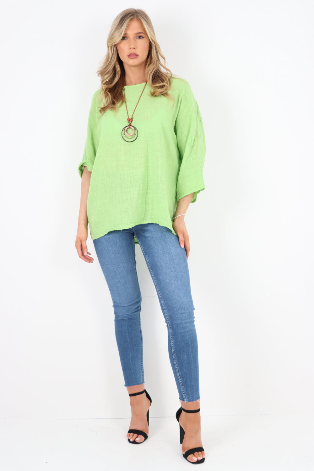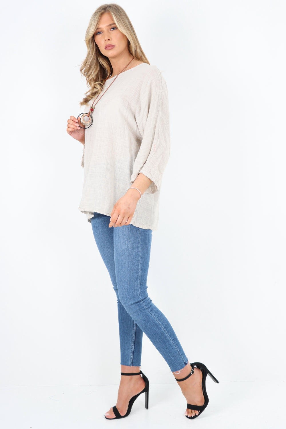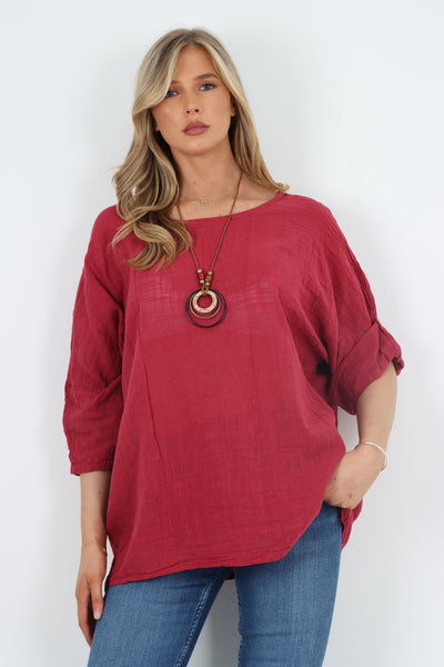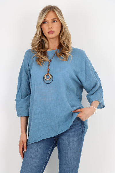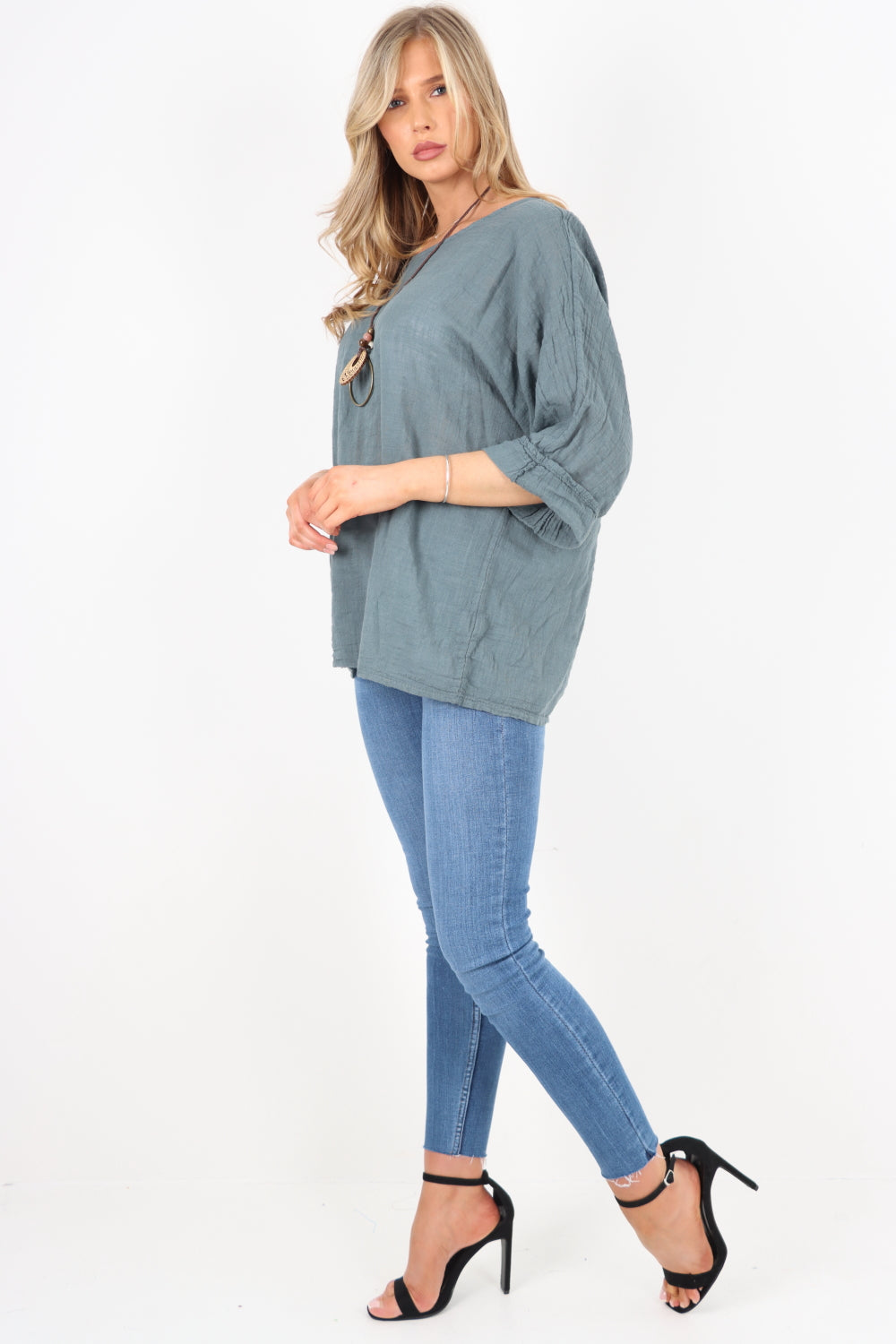 Made In Italy Lagenlook Plain Necklace Cotton Turn Up Sleeve Top
