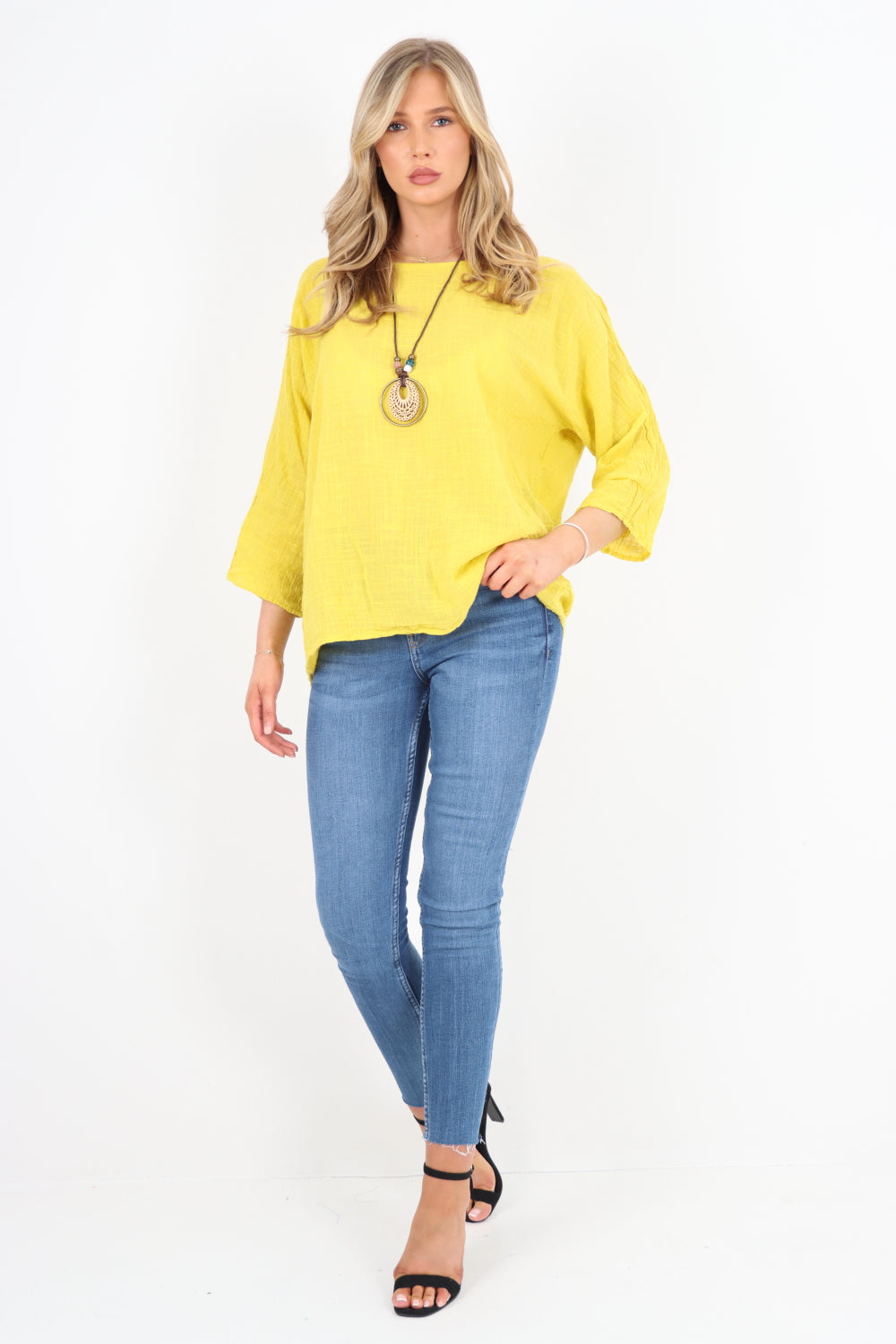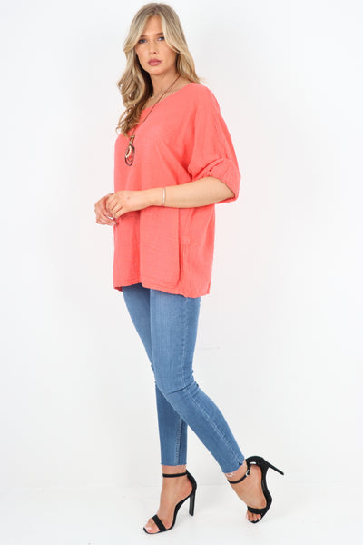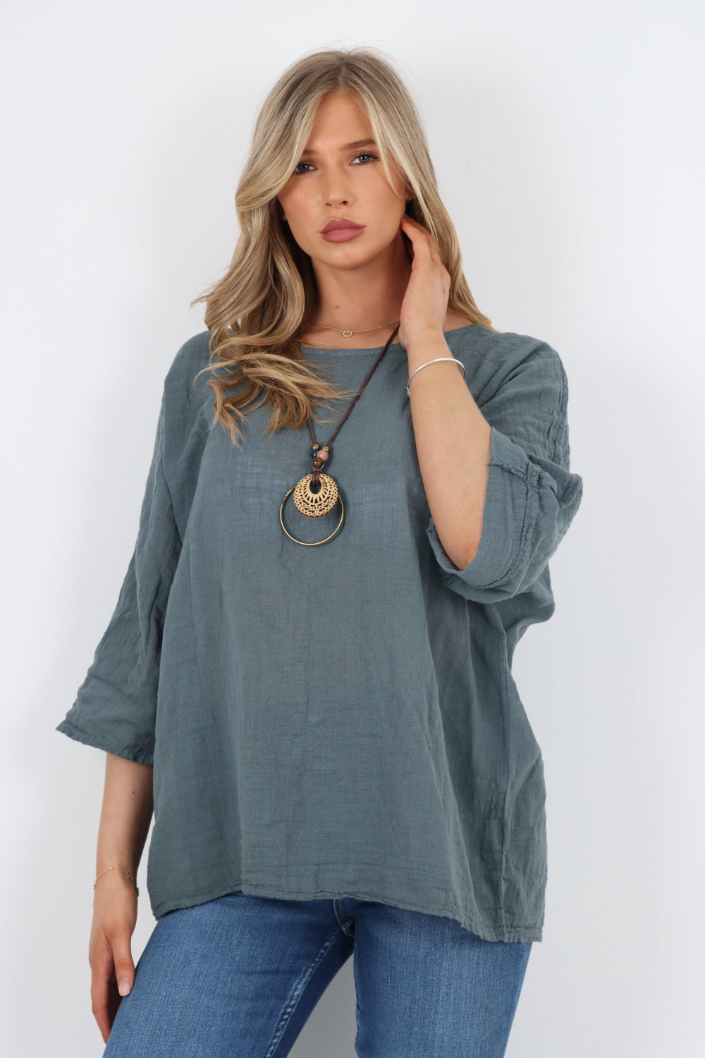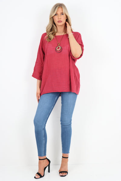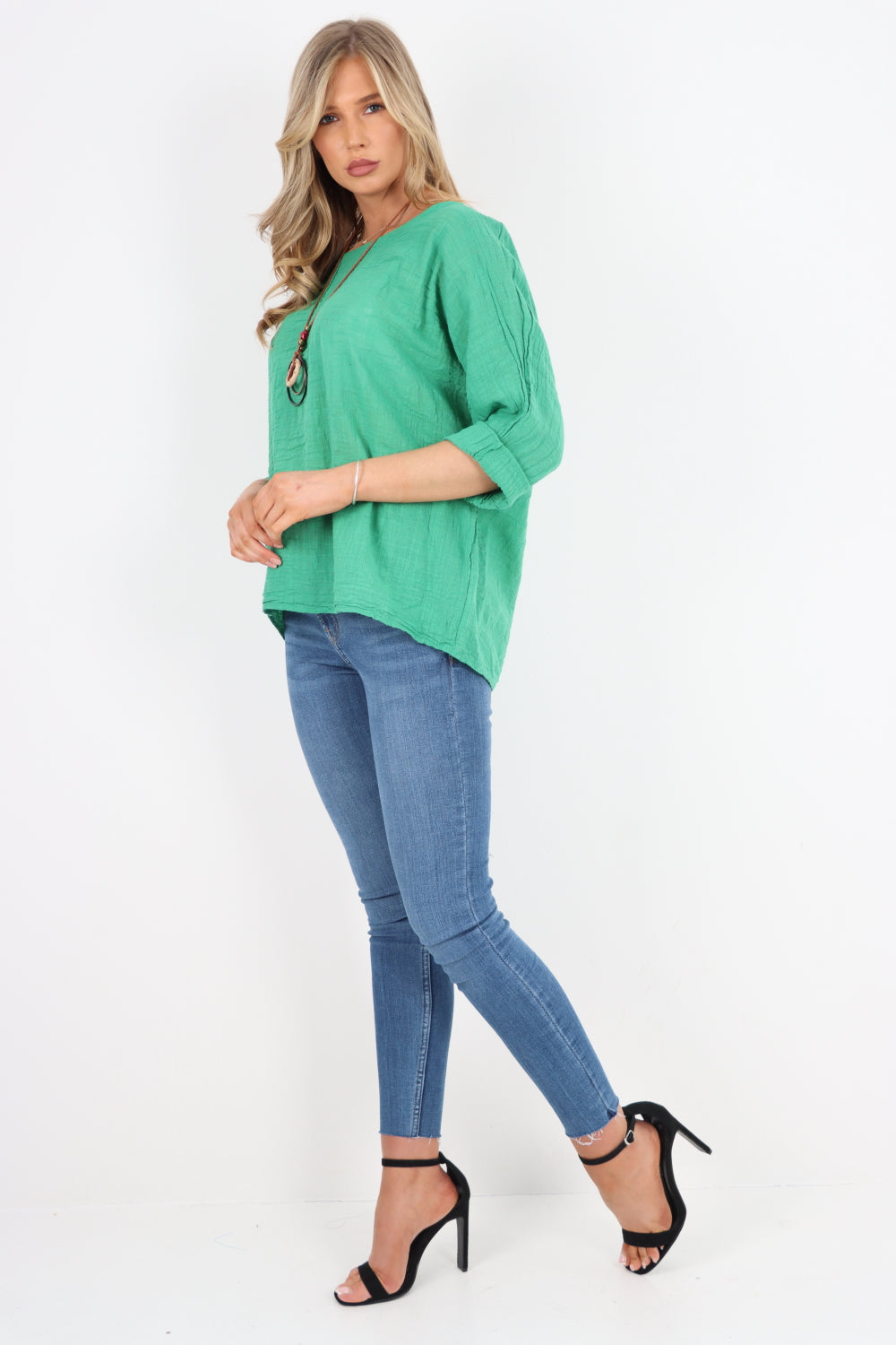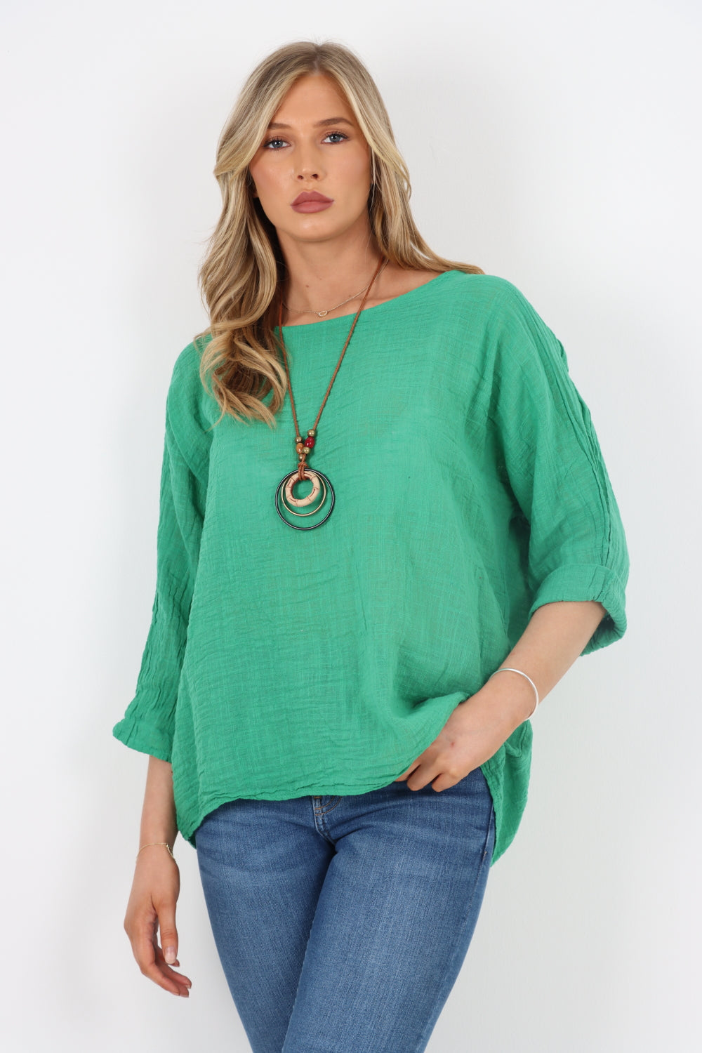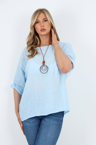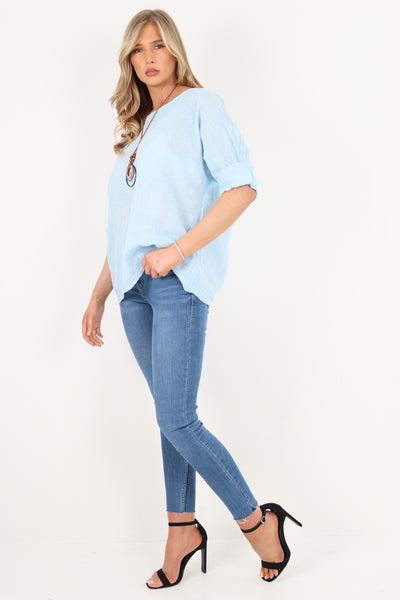 Made In Italy Lagenlook Plain Necklace Cotton Turn Up Sleeve Top