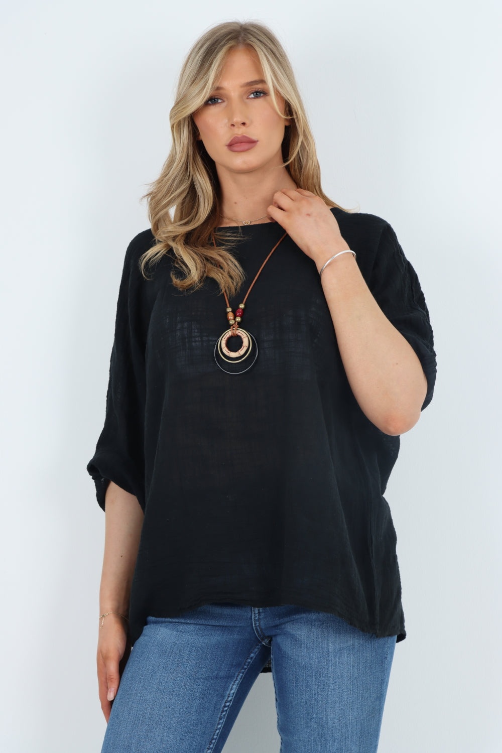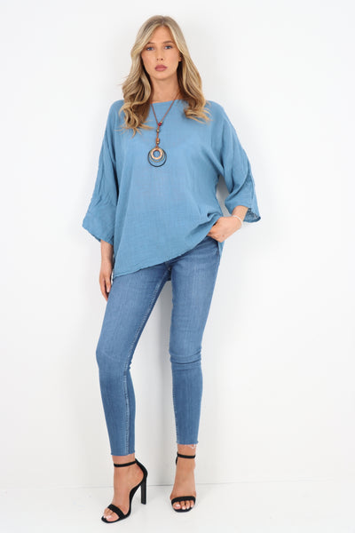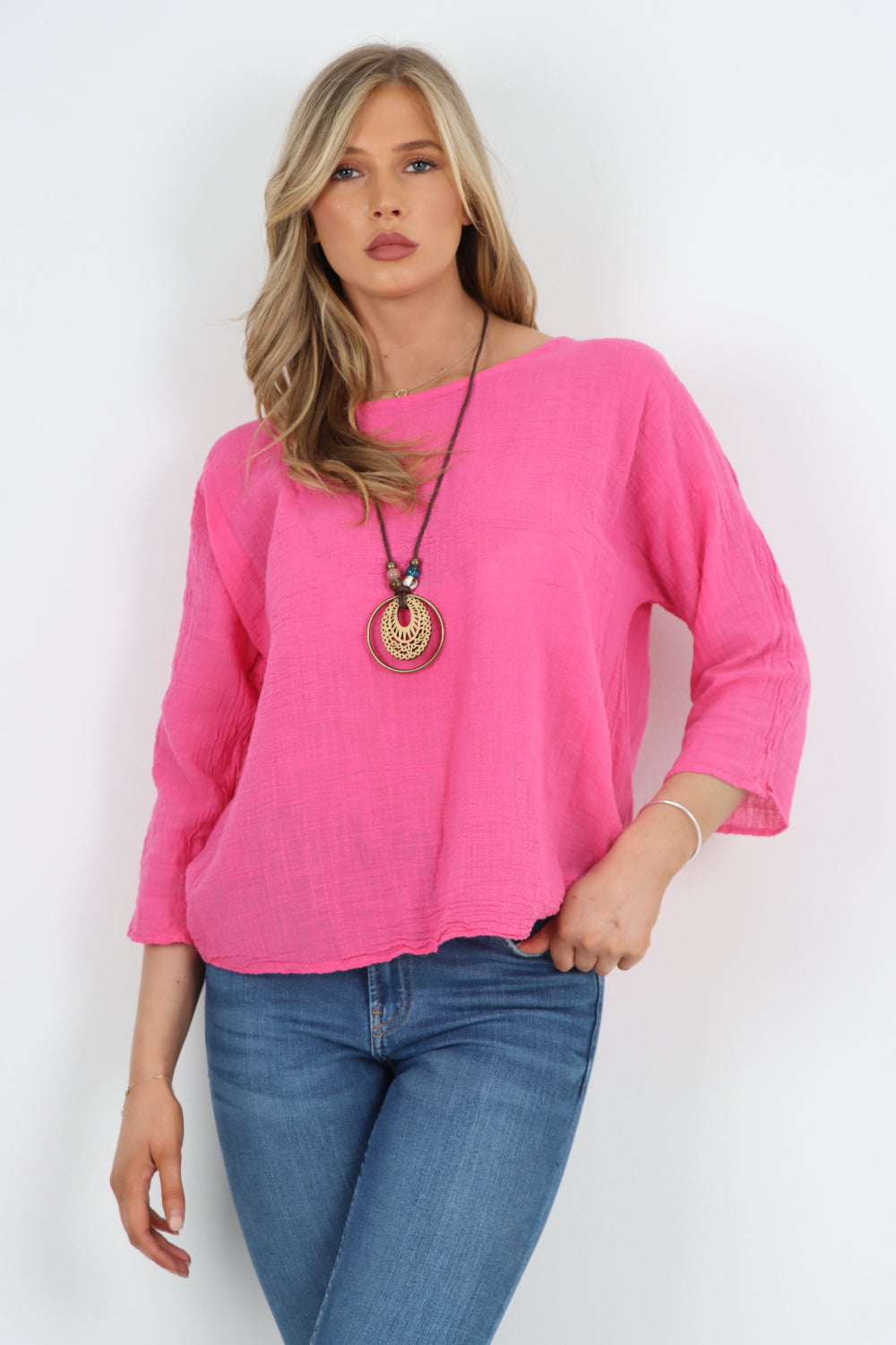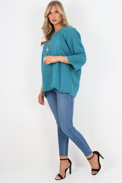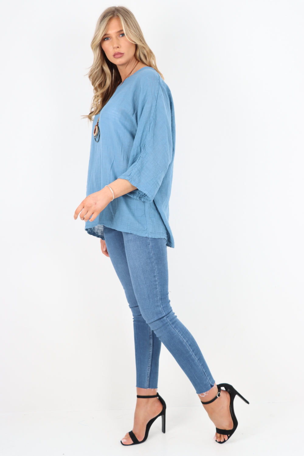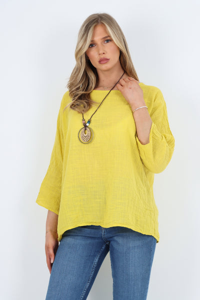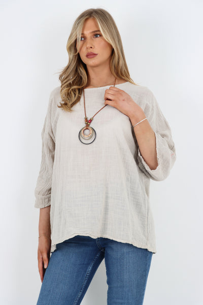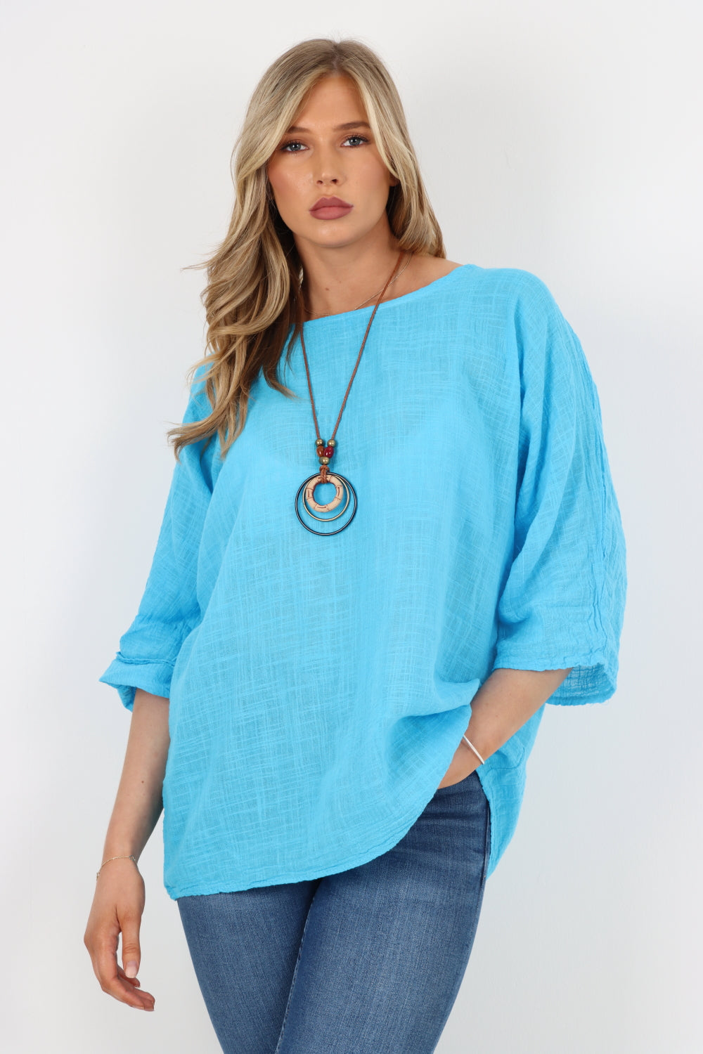 Made In Italy Lagenlook Plain Necklace Cotton Turn Up Sleeve Top
