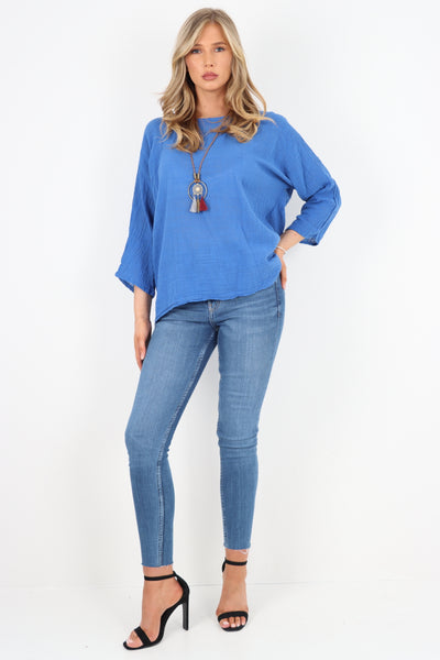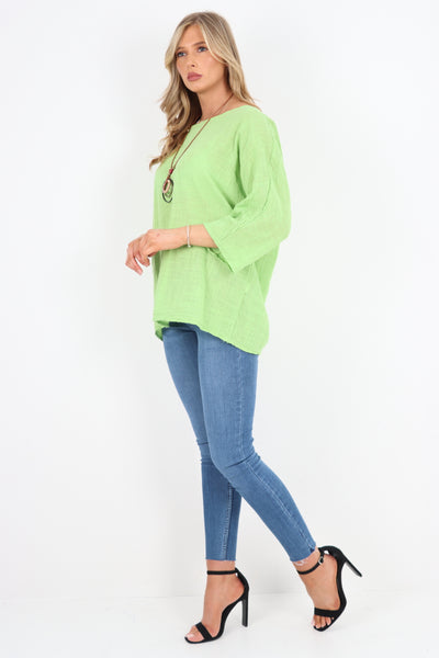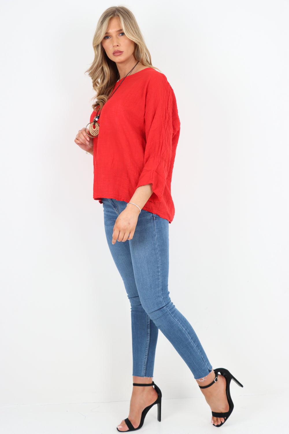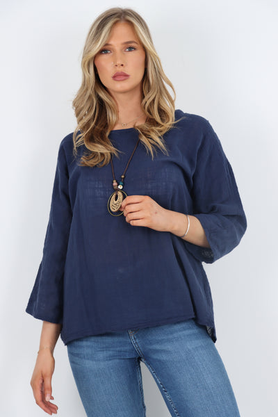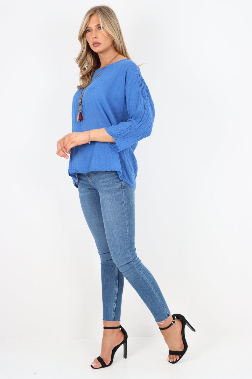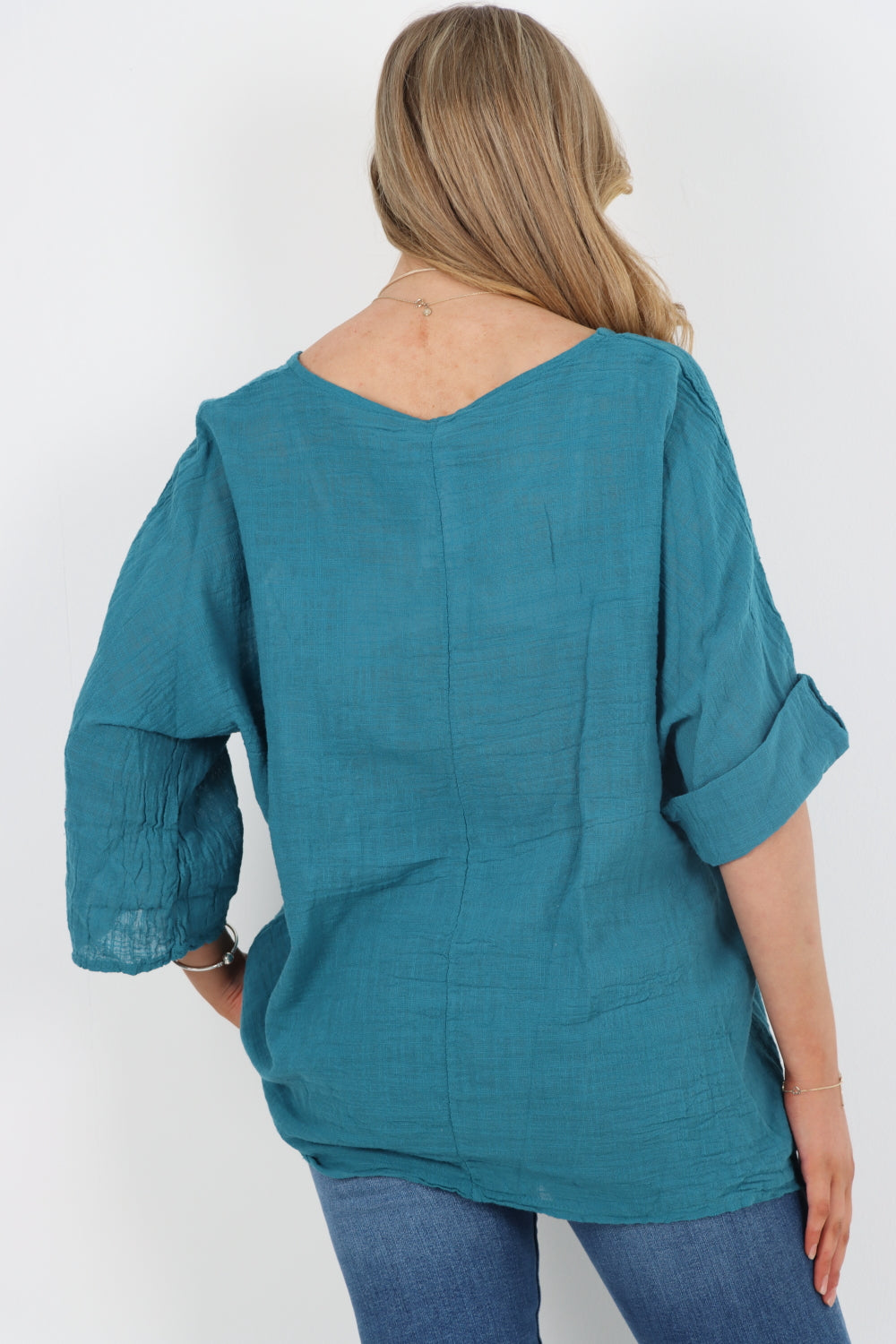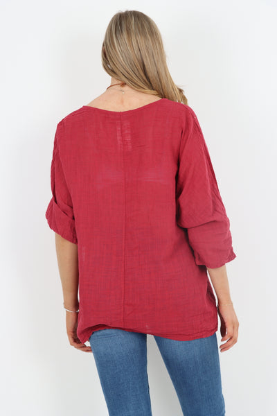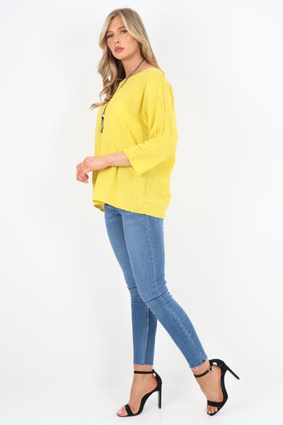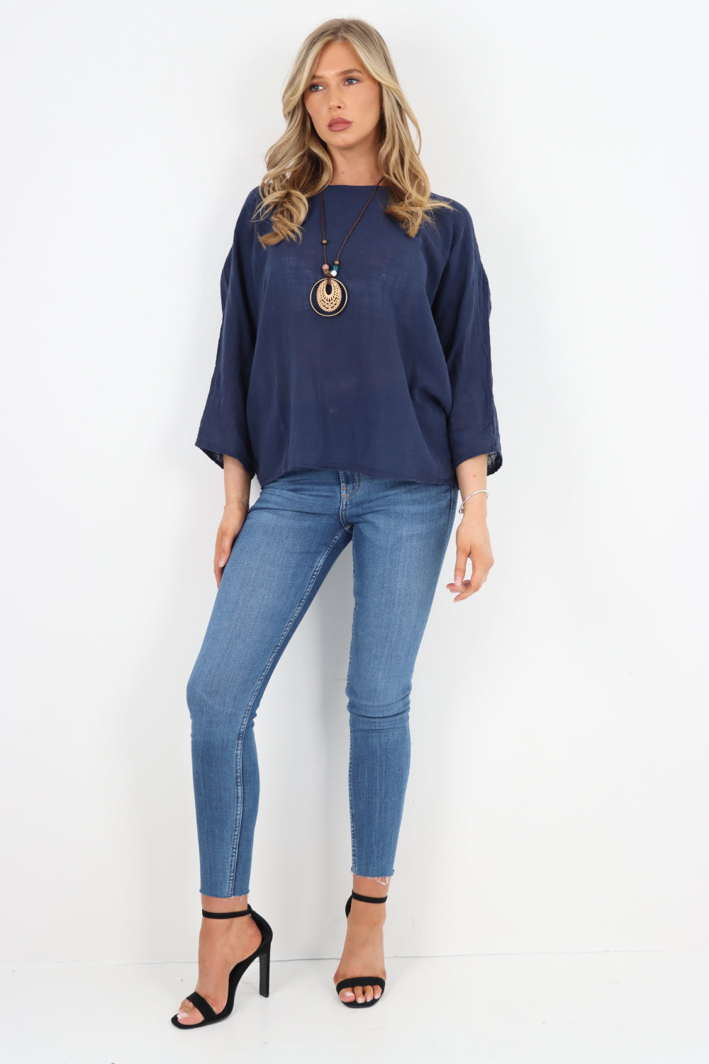 Made In Italy Lagenlook Plain Necklace Cotton Turn Up Sleeve Top