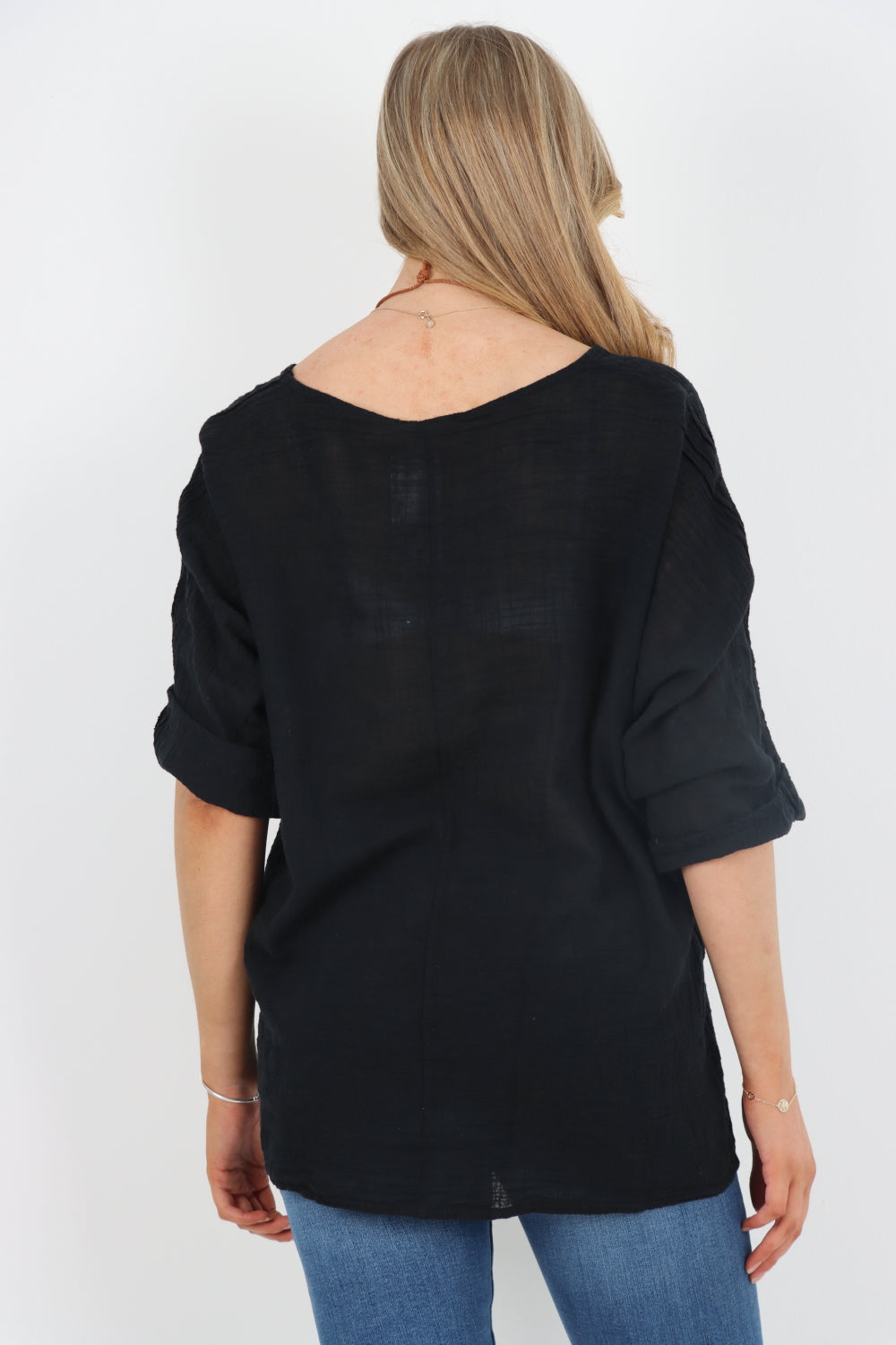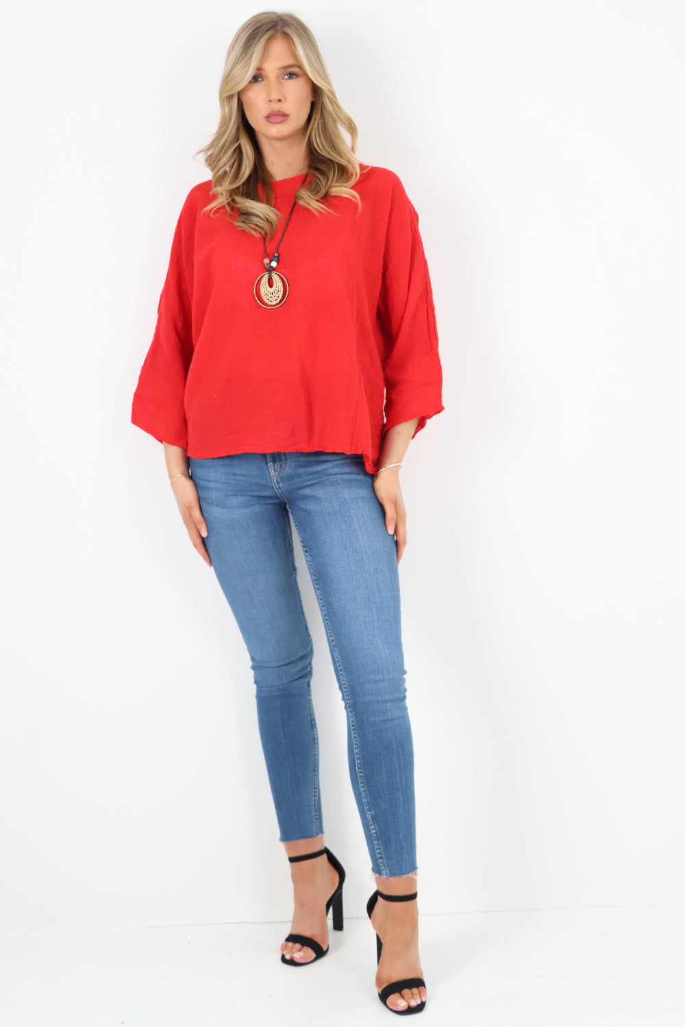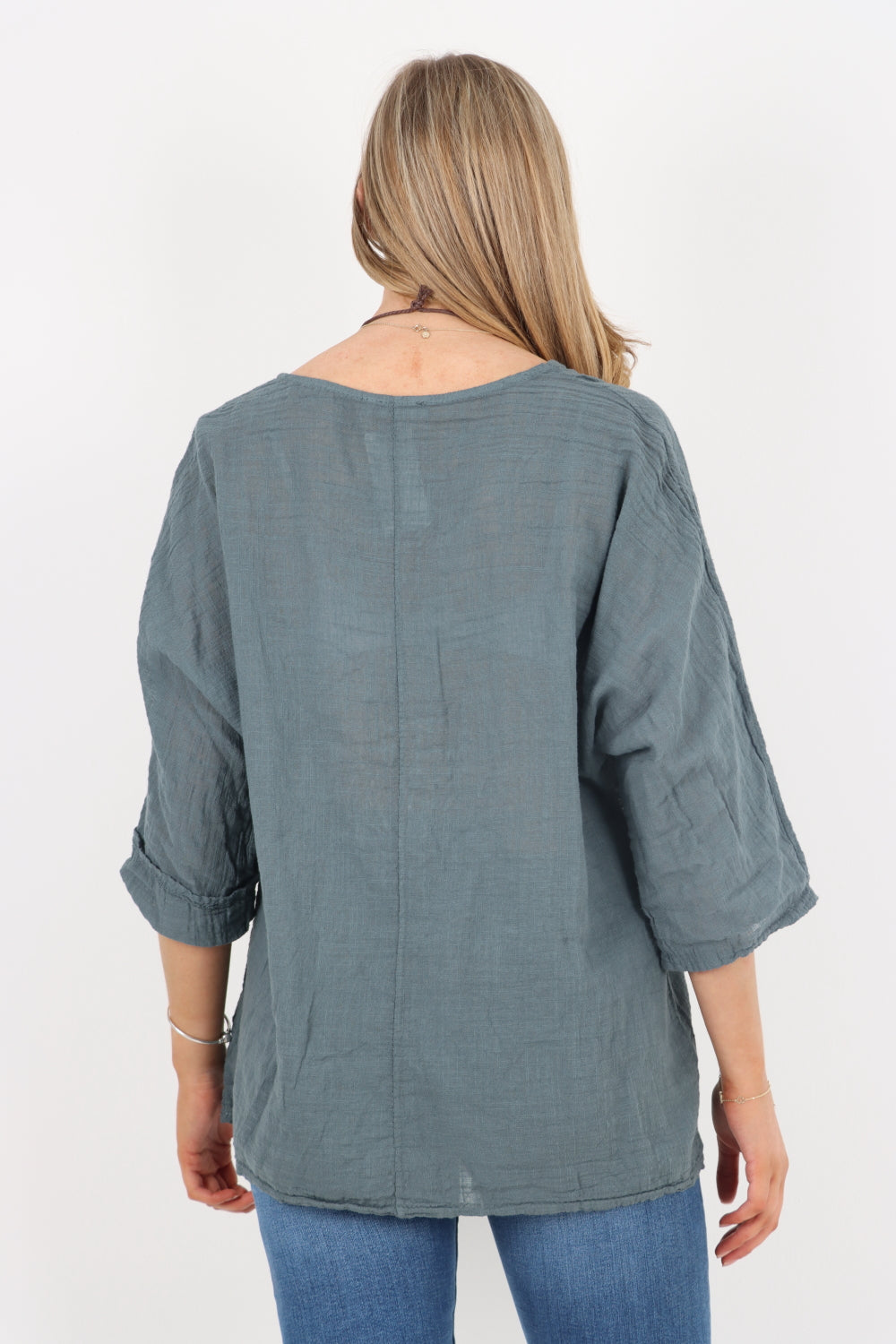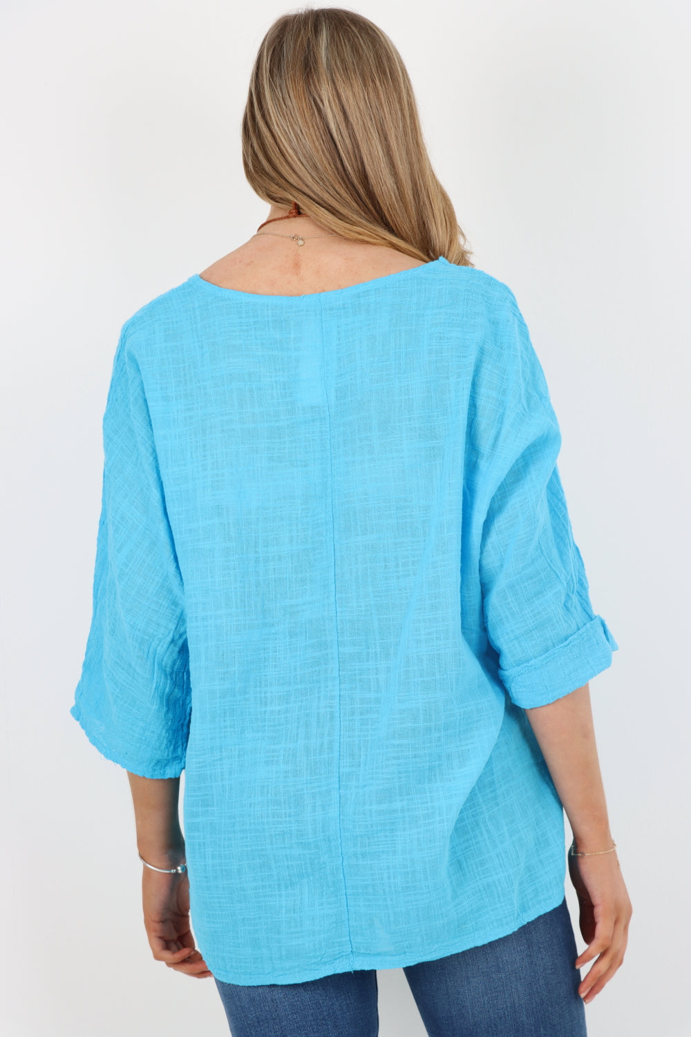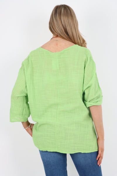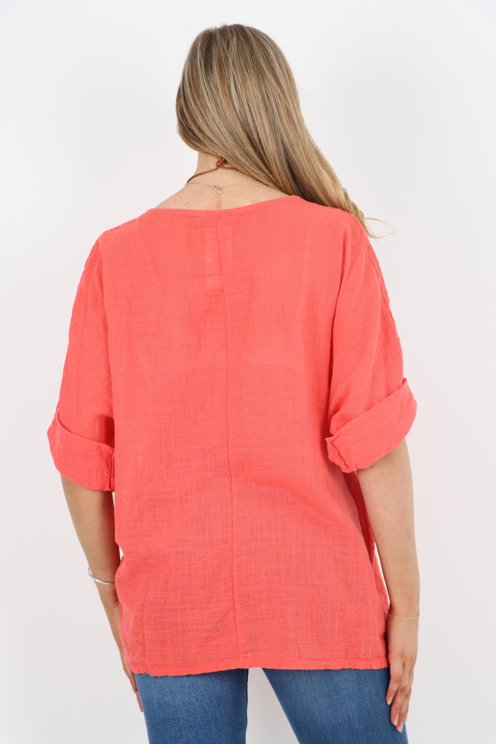 Made In Italy Lagenlook Plain Necklace Cotton Turn Up Sleeve Top