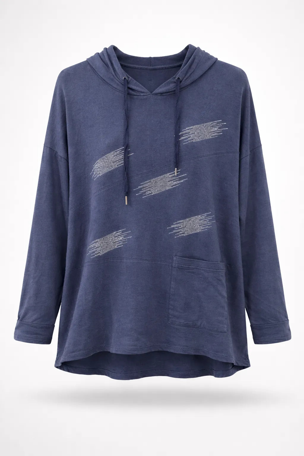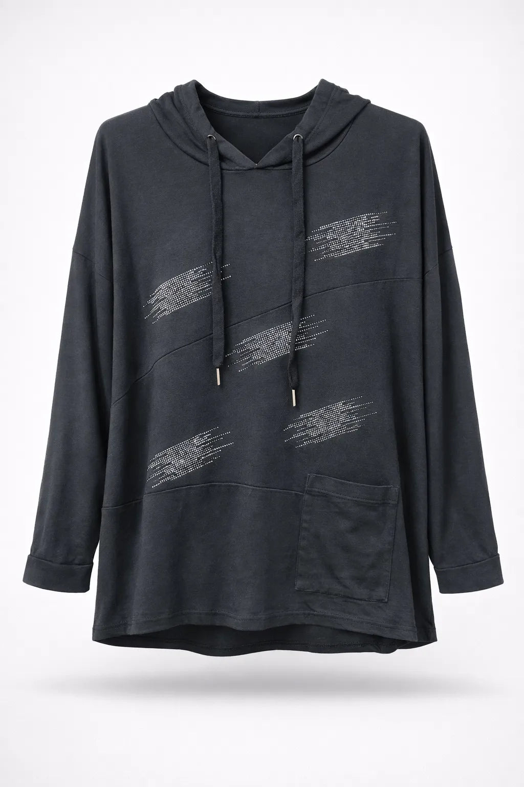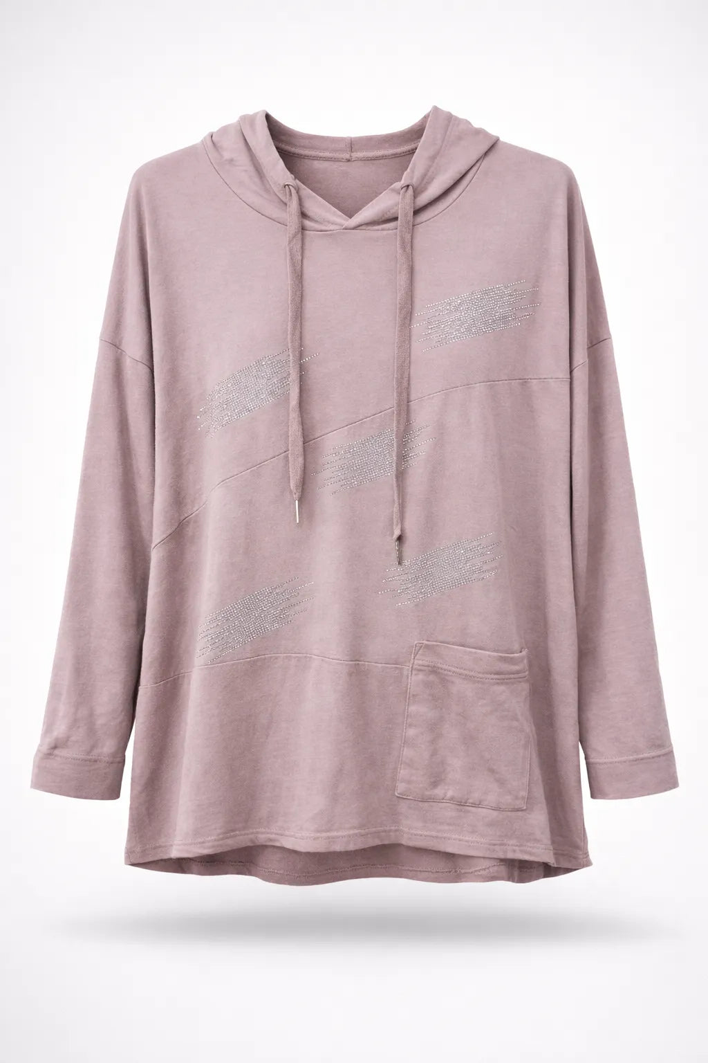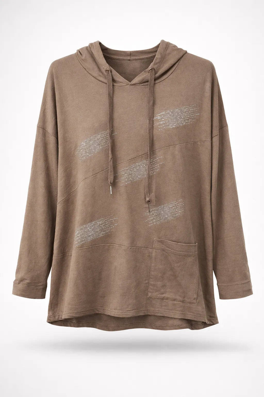 Refresh your casual wardrobe with this Italian oversized cotton hooded top featuring elegant rhinestone detailing and a relaxed silhouette. Made from breathable 100% cotton, this ladies hooded top delivers comfort, style and everyday versatility.
