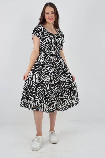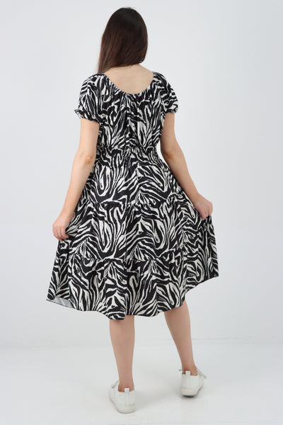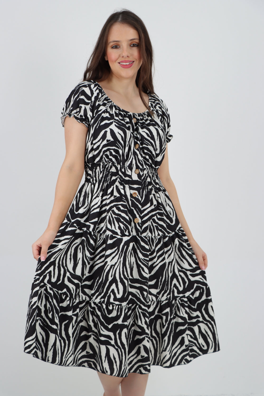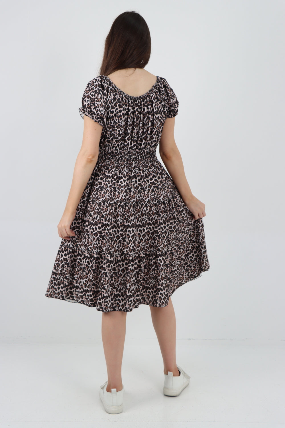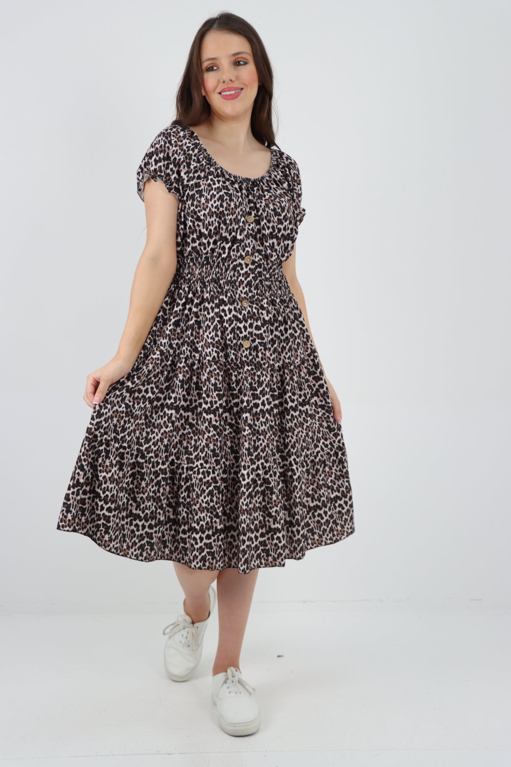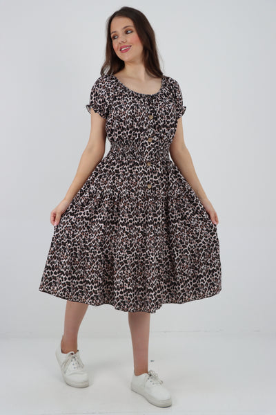 The animal print is printed with care, giving the dress a bold pattern that is trendy yet classy. Each seam is stitched finely for quality and durability that lasts long. The midi length falls just below the knee, suitable for both casual and dressier looks. It pairs well with sandals, heels, or trainers for styling flexibility and with our wholesale women leggings.