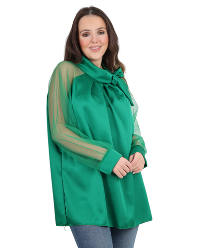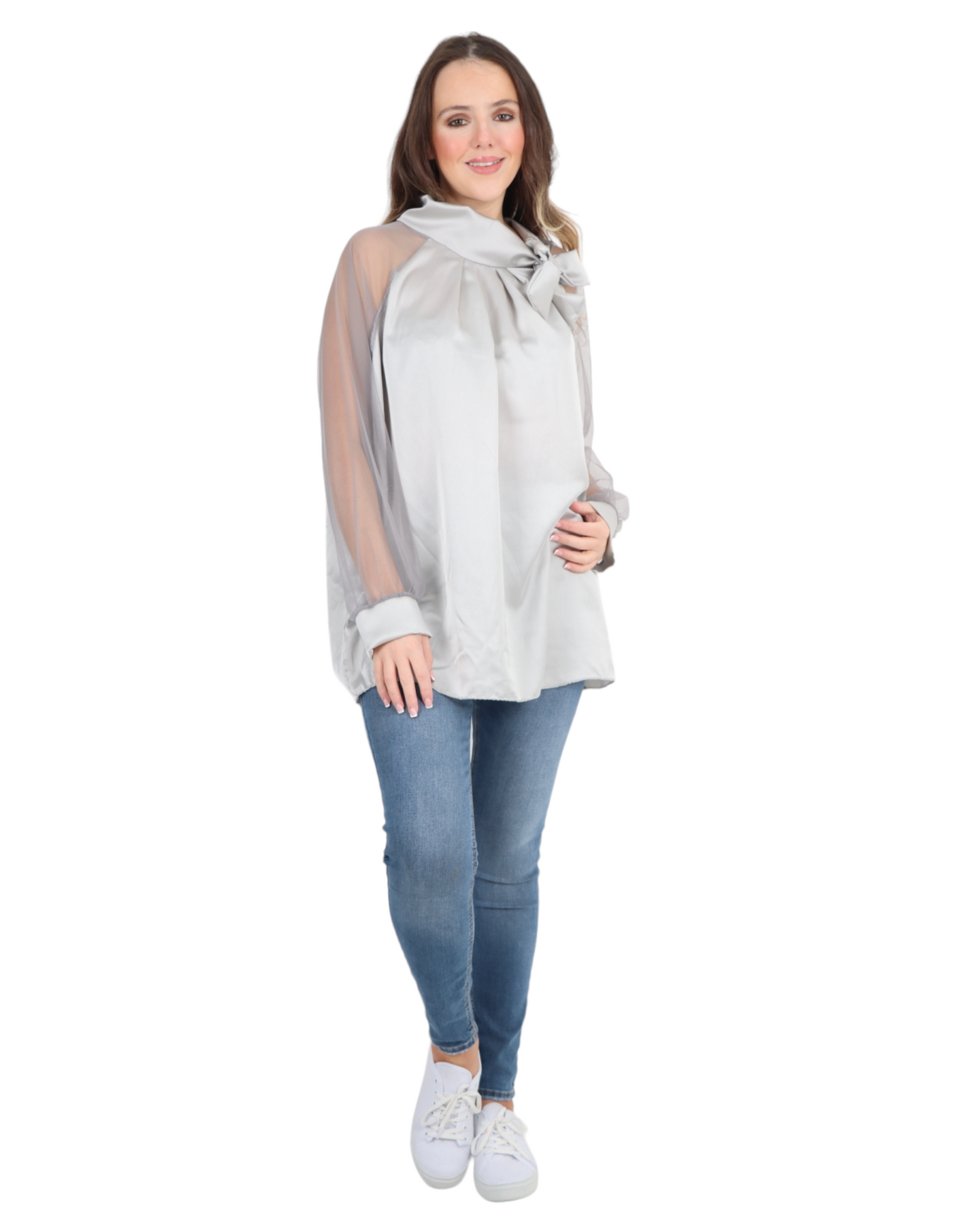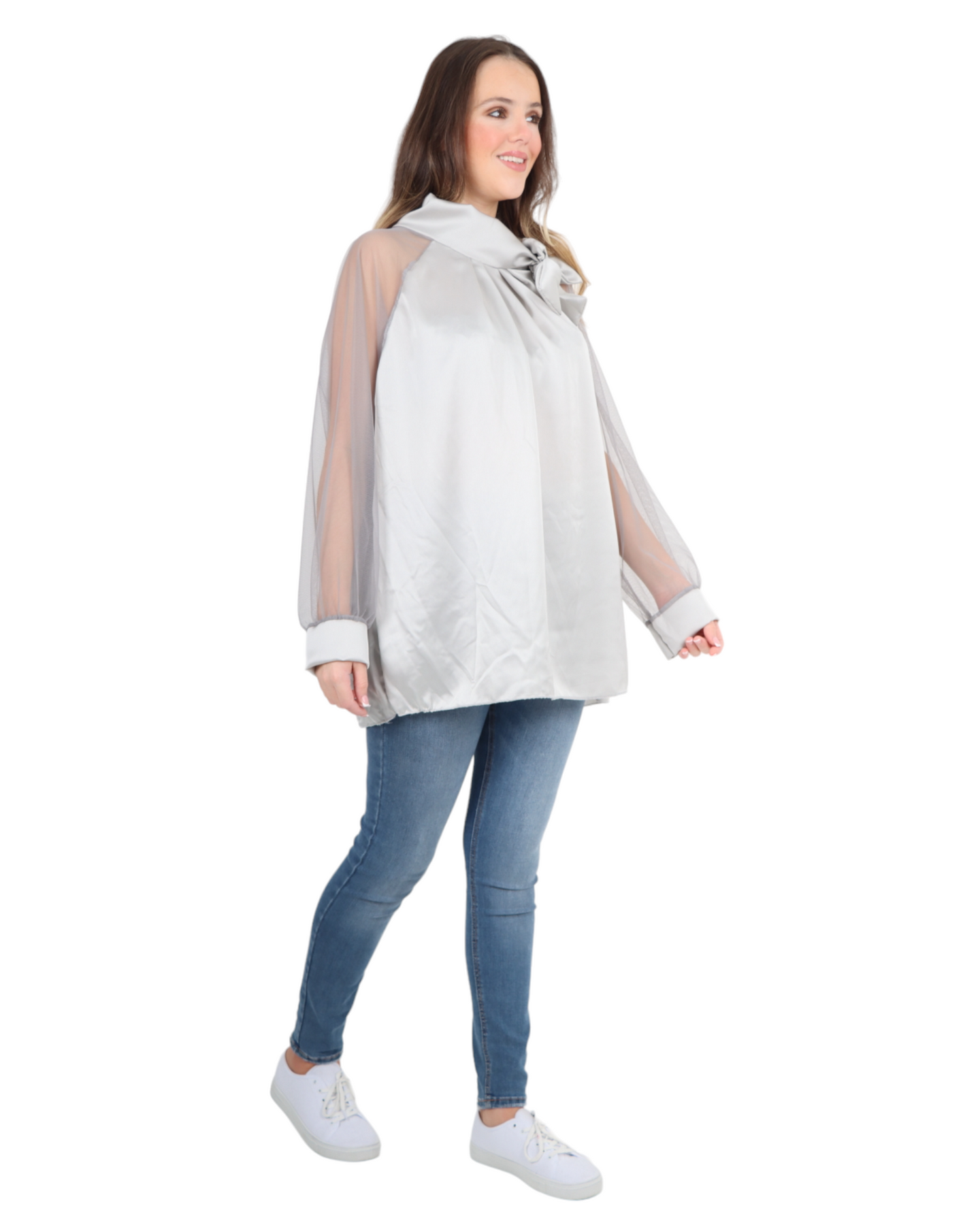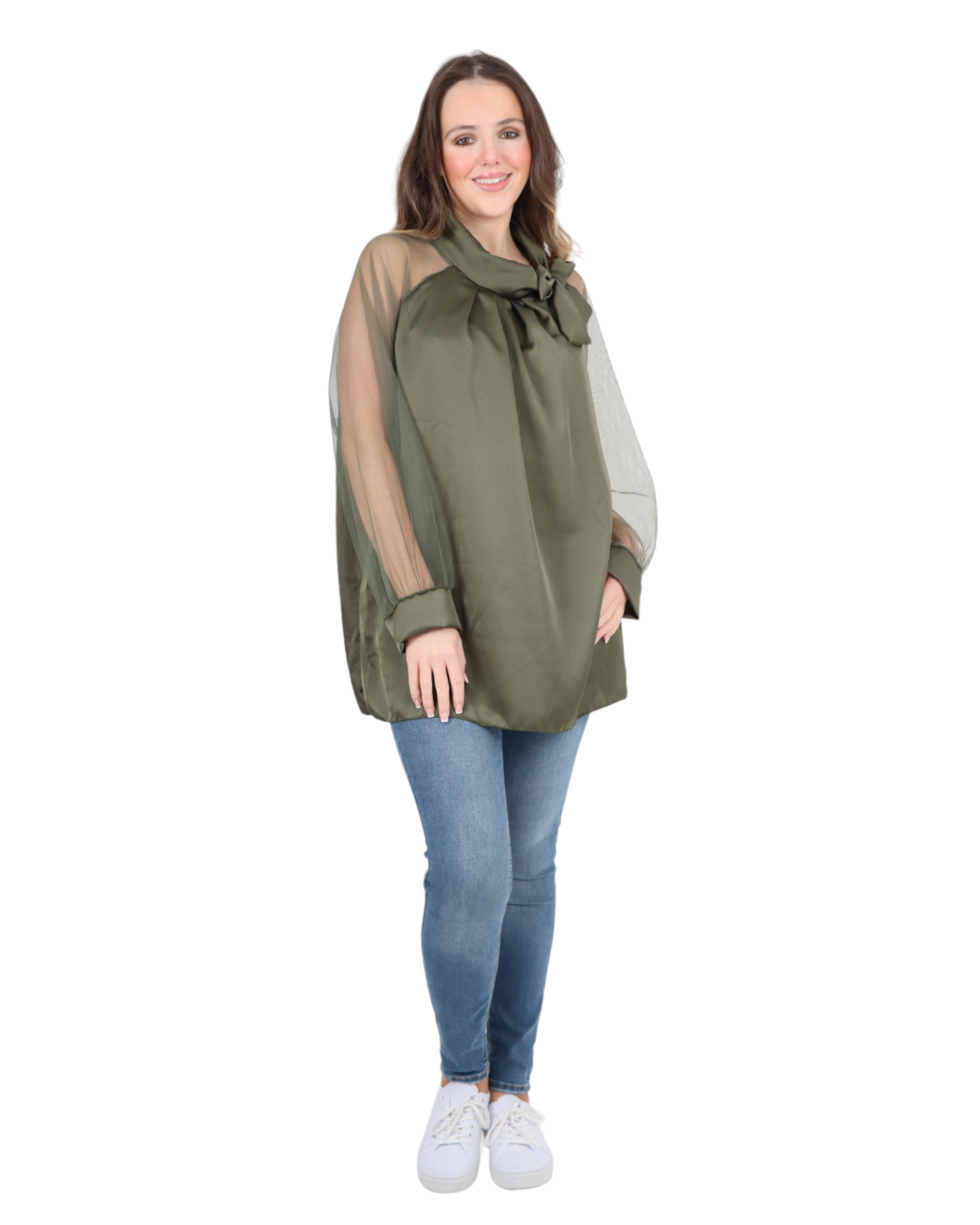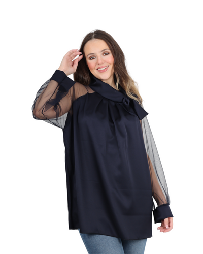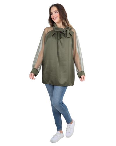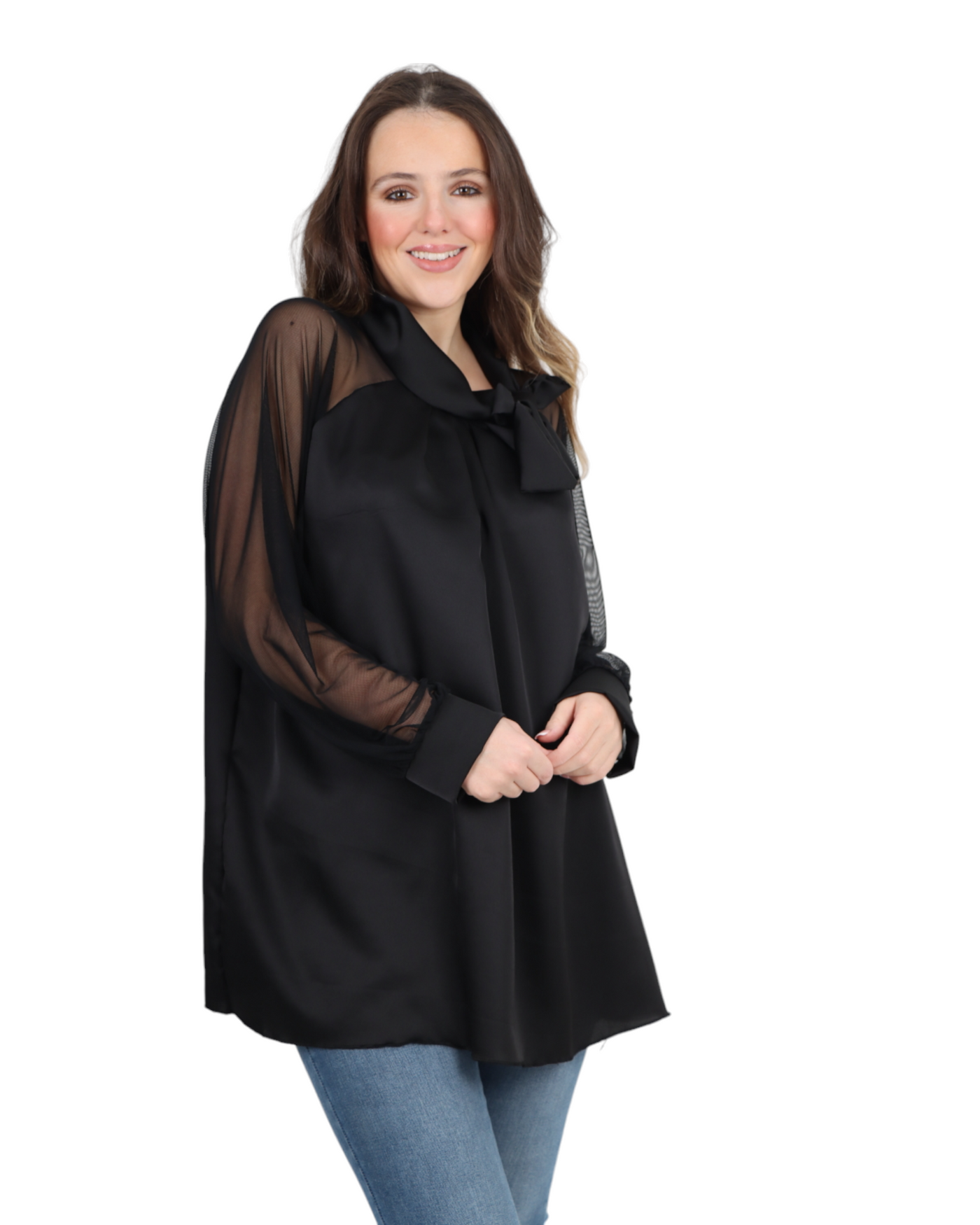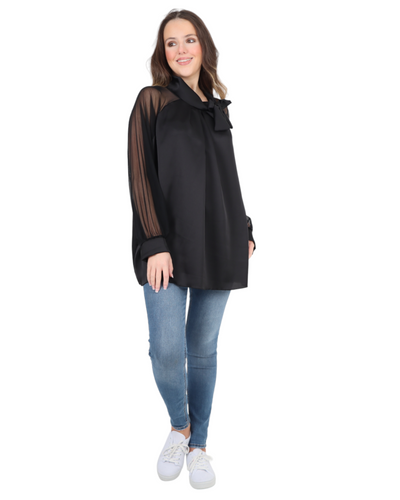 Made in Italy Mesh Net Sleeve Satin Tie Neck Top