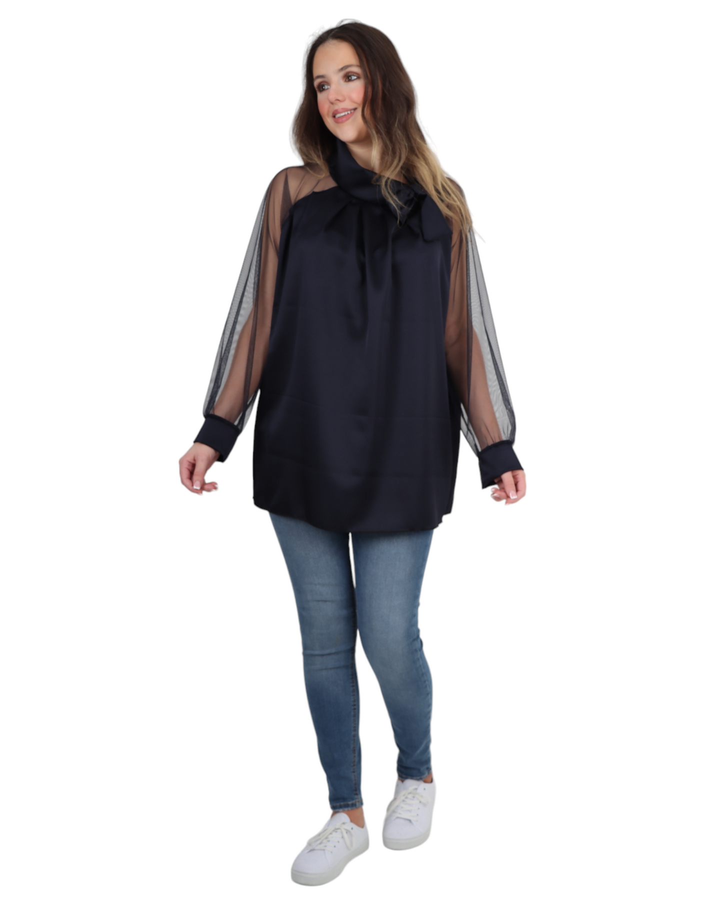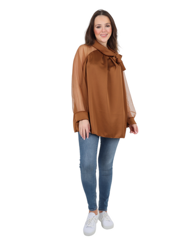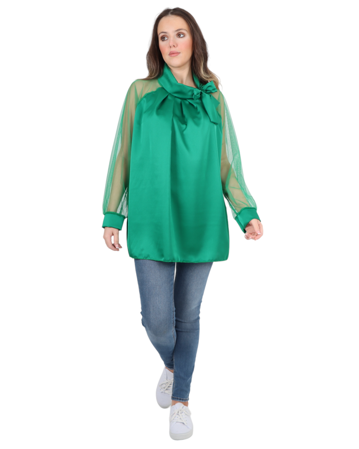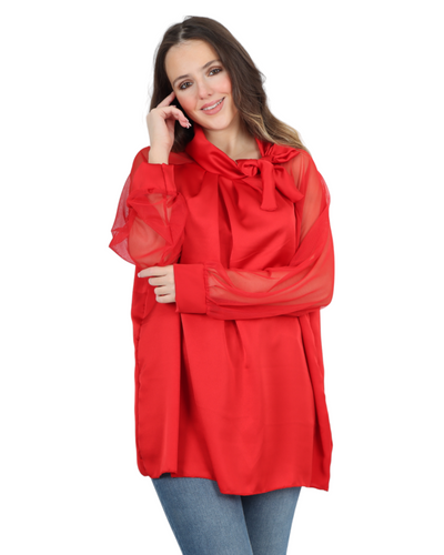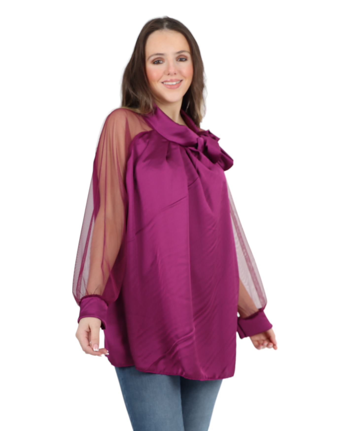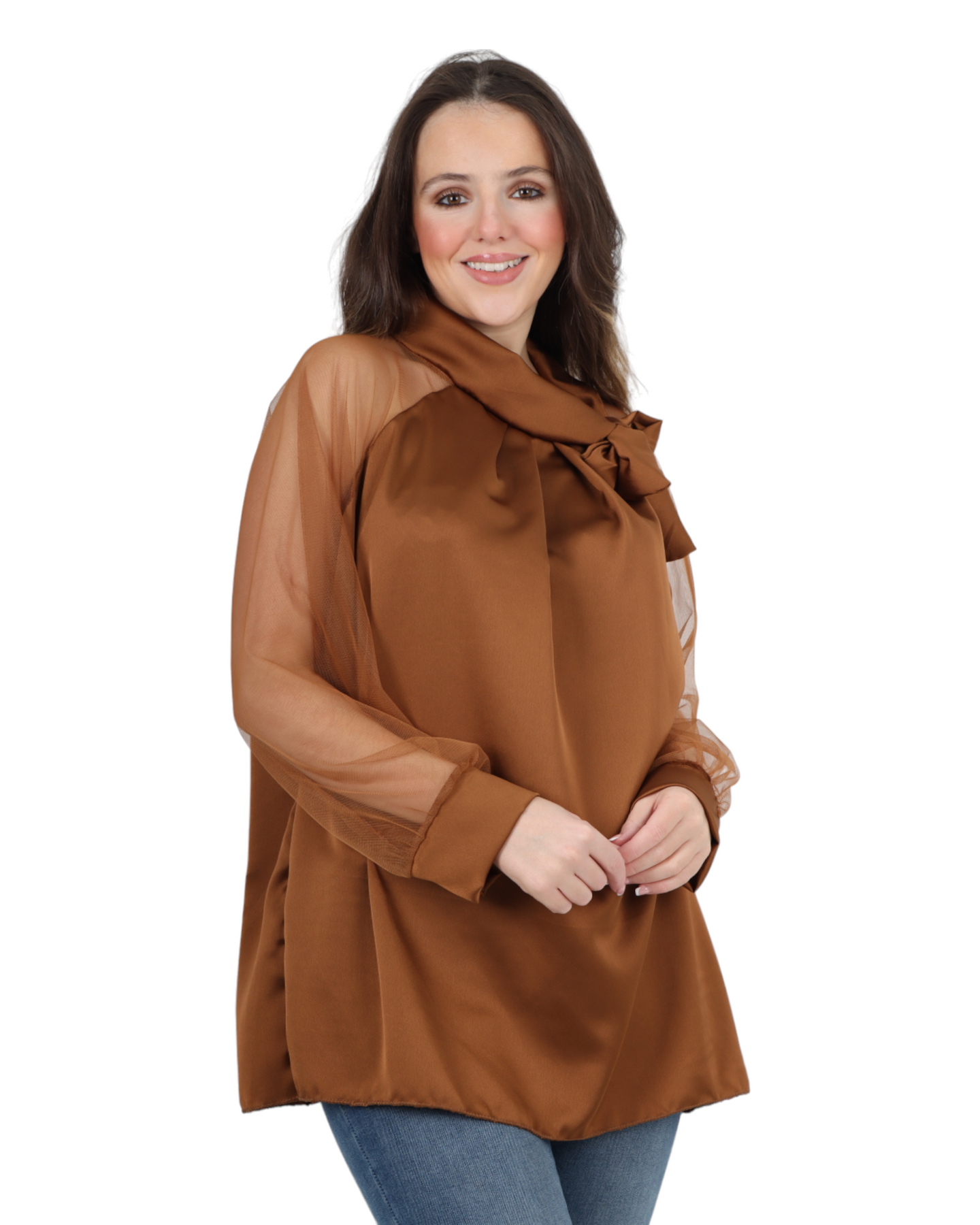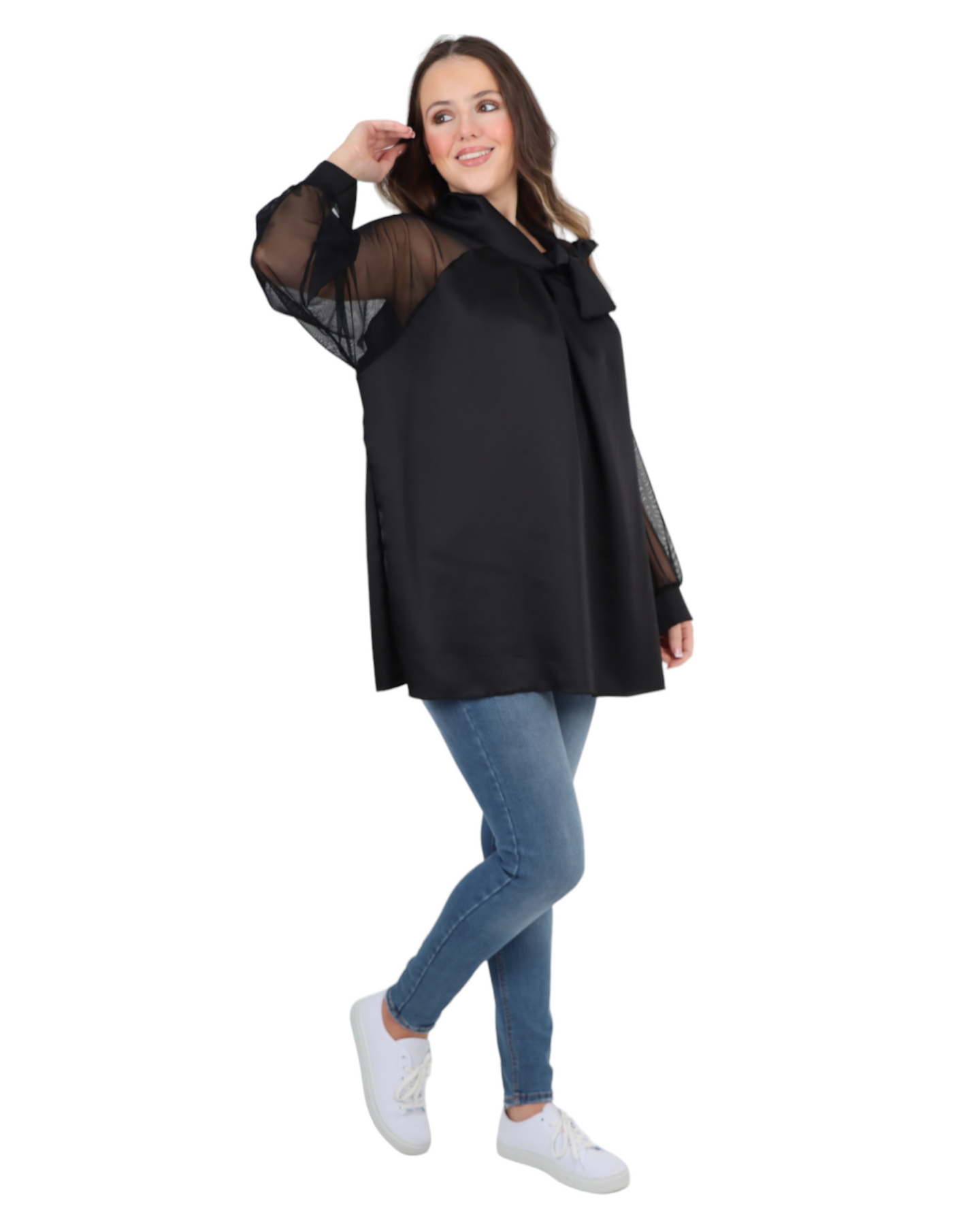 Made in Italy Mesh Net Sleeve Satin Tie Neck Top