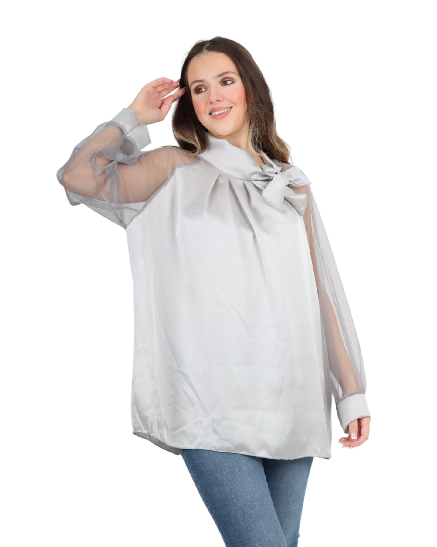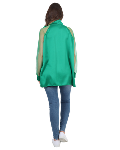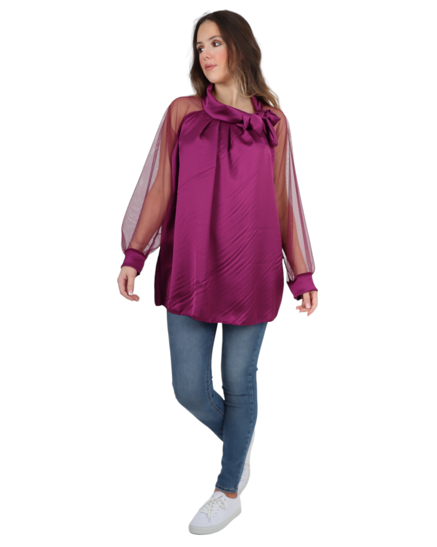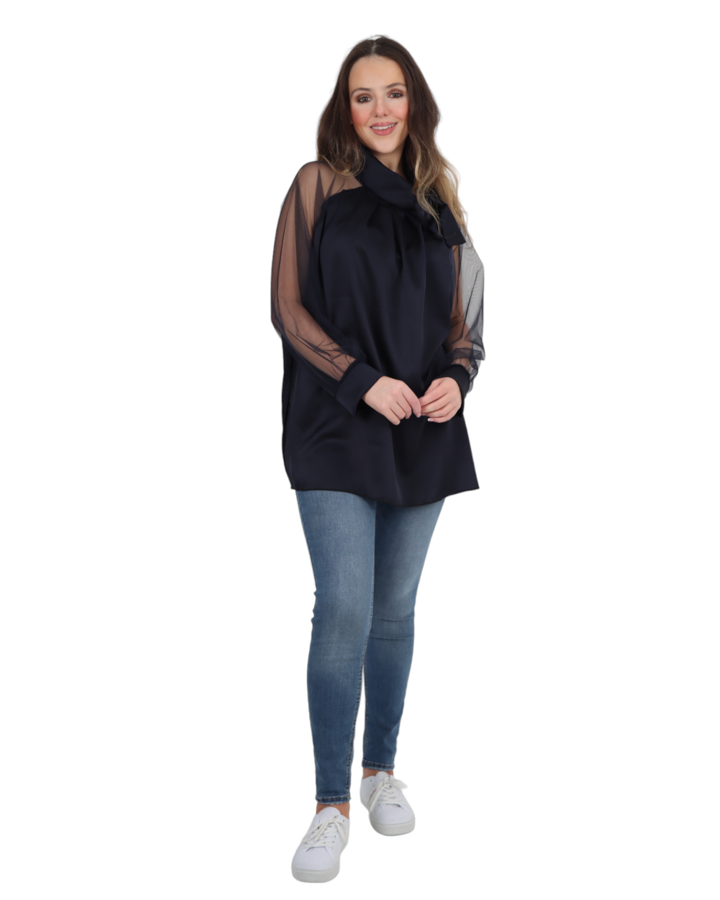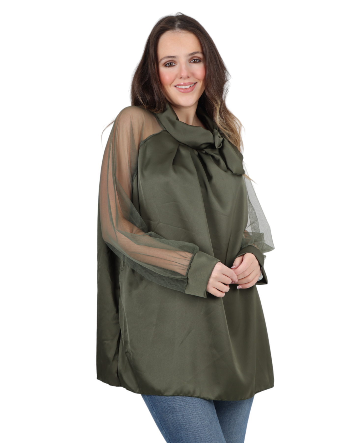 Made in Italy Mesh Net Sleeve Satin Tie Neck Top