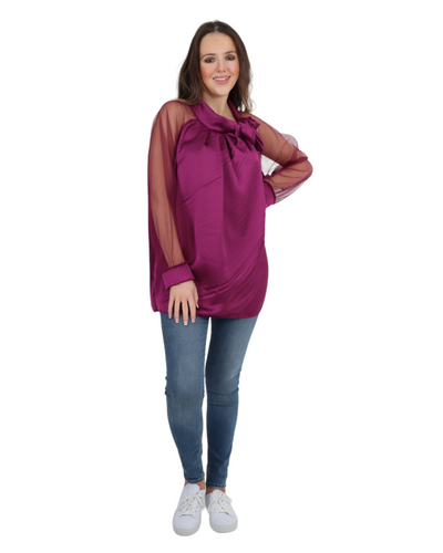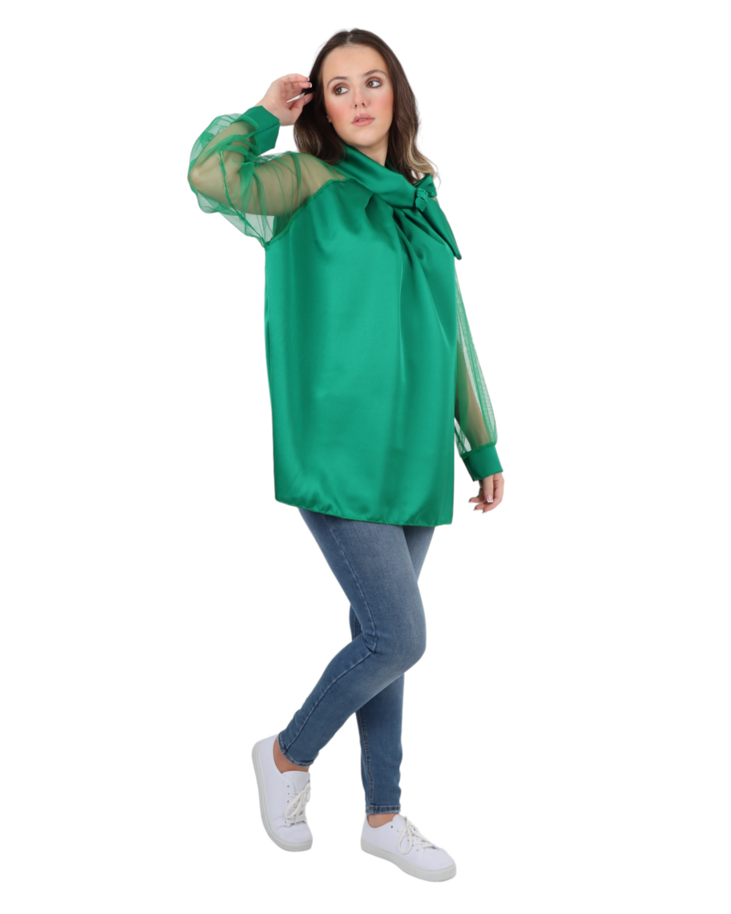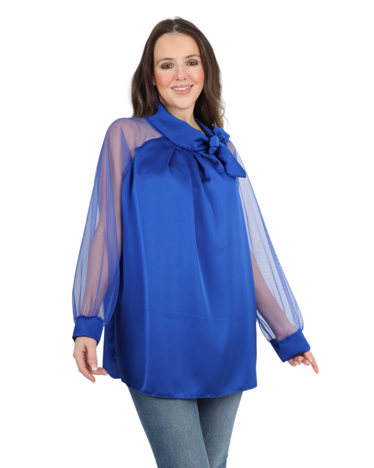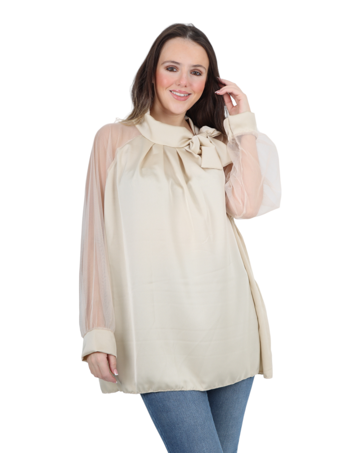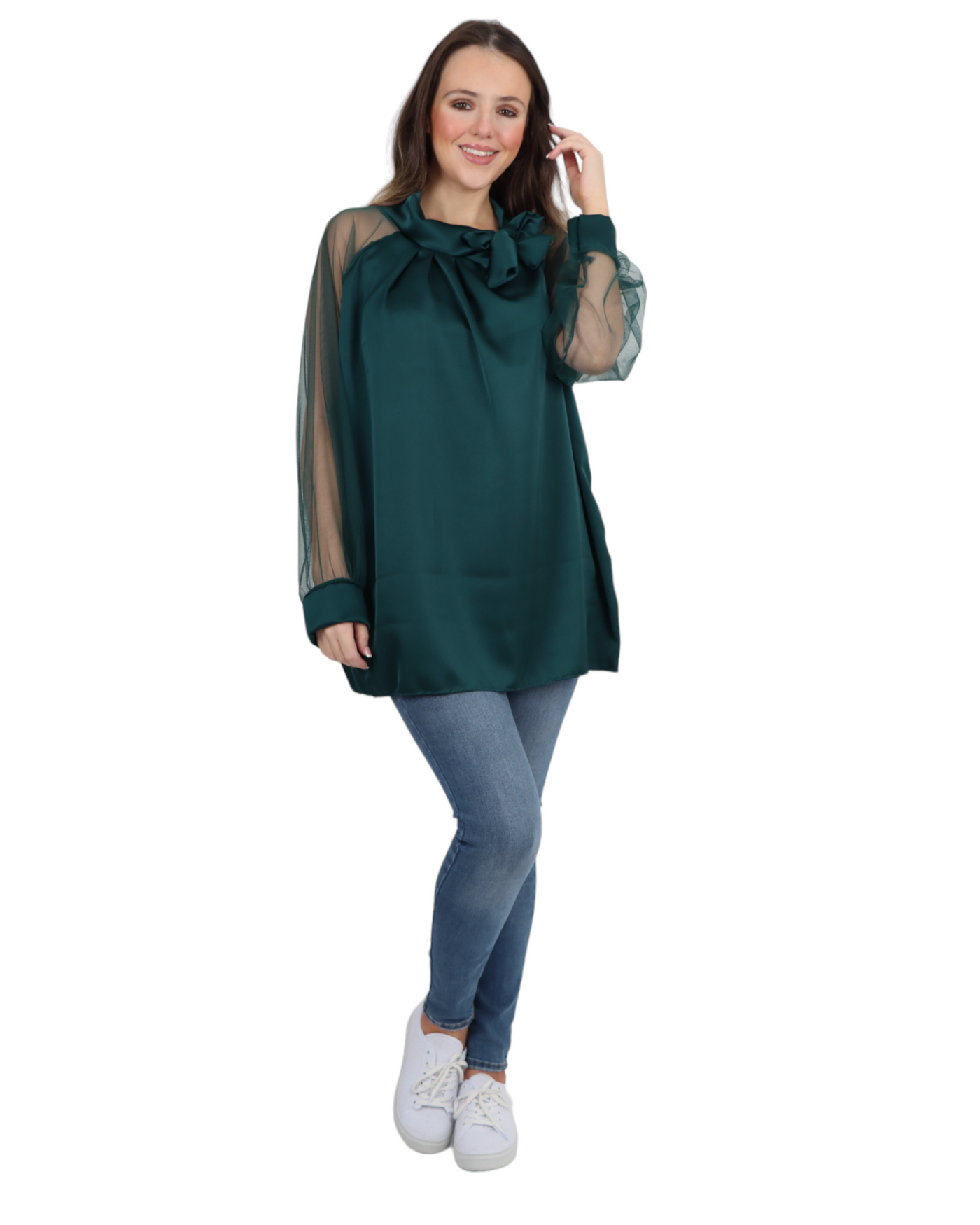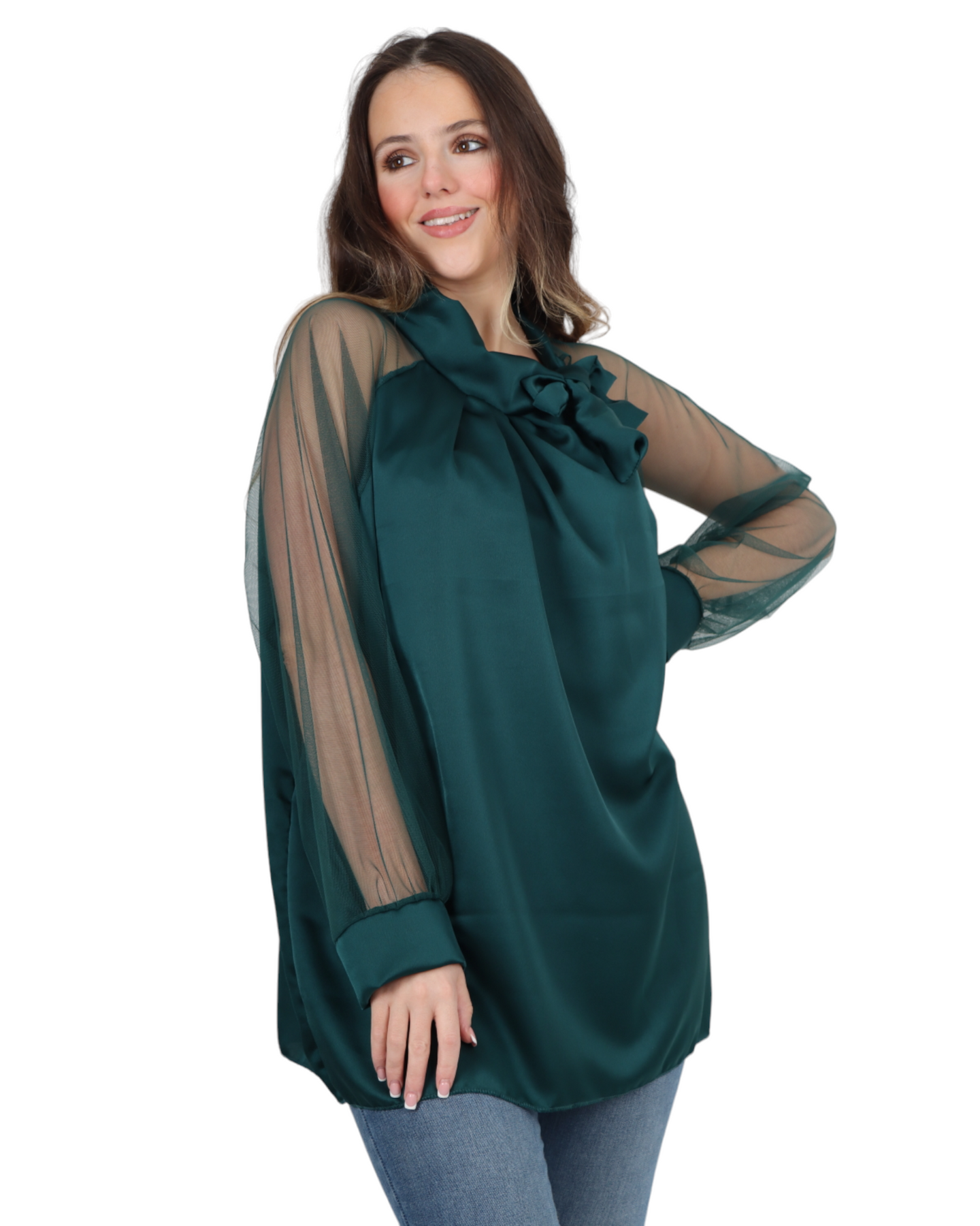 Made in Italy Mesh Net Sleeve Satin Tie Neck Top
