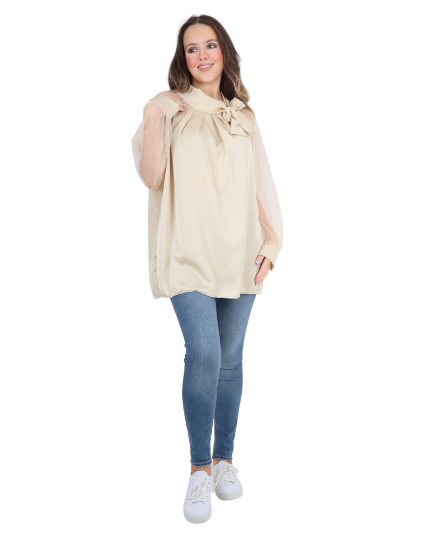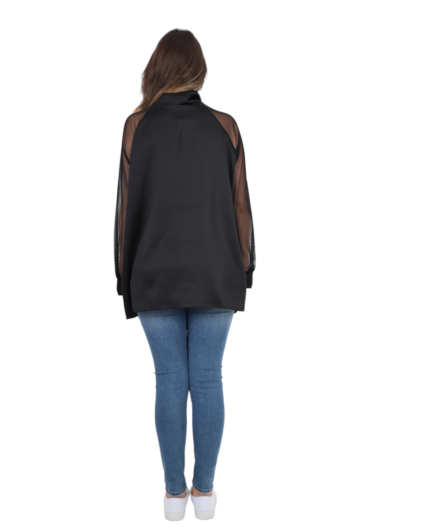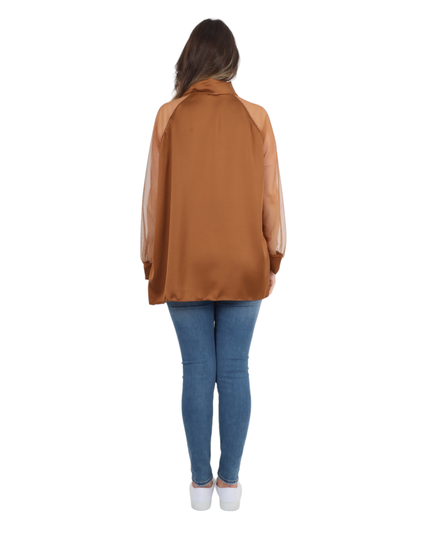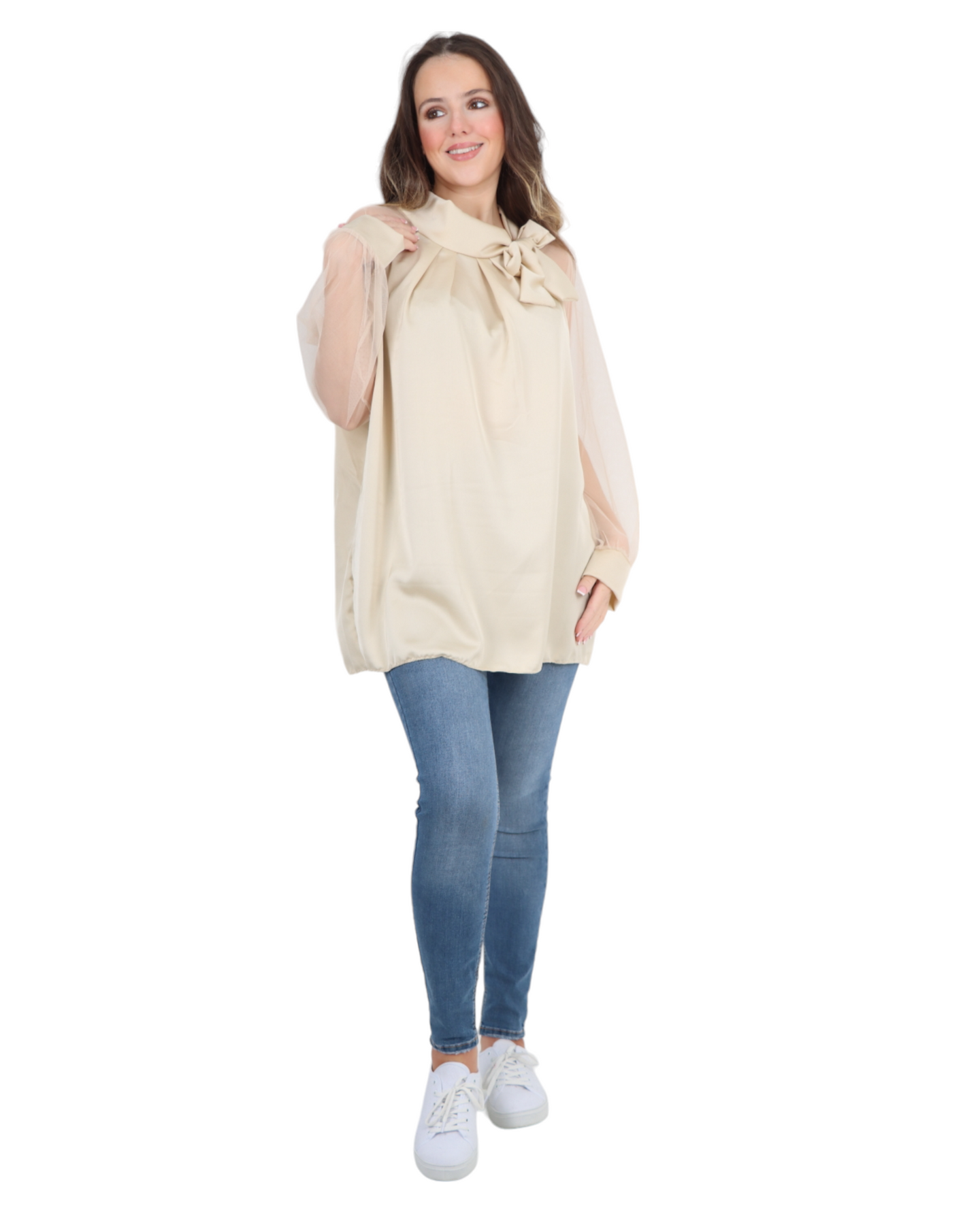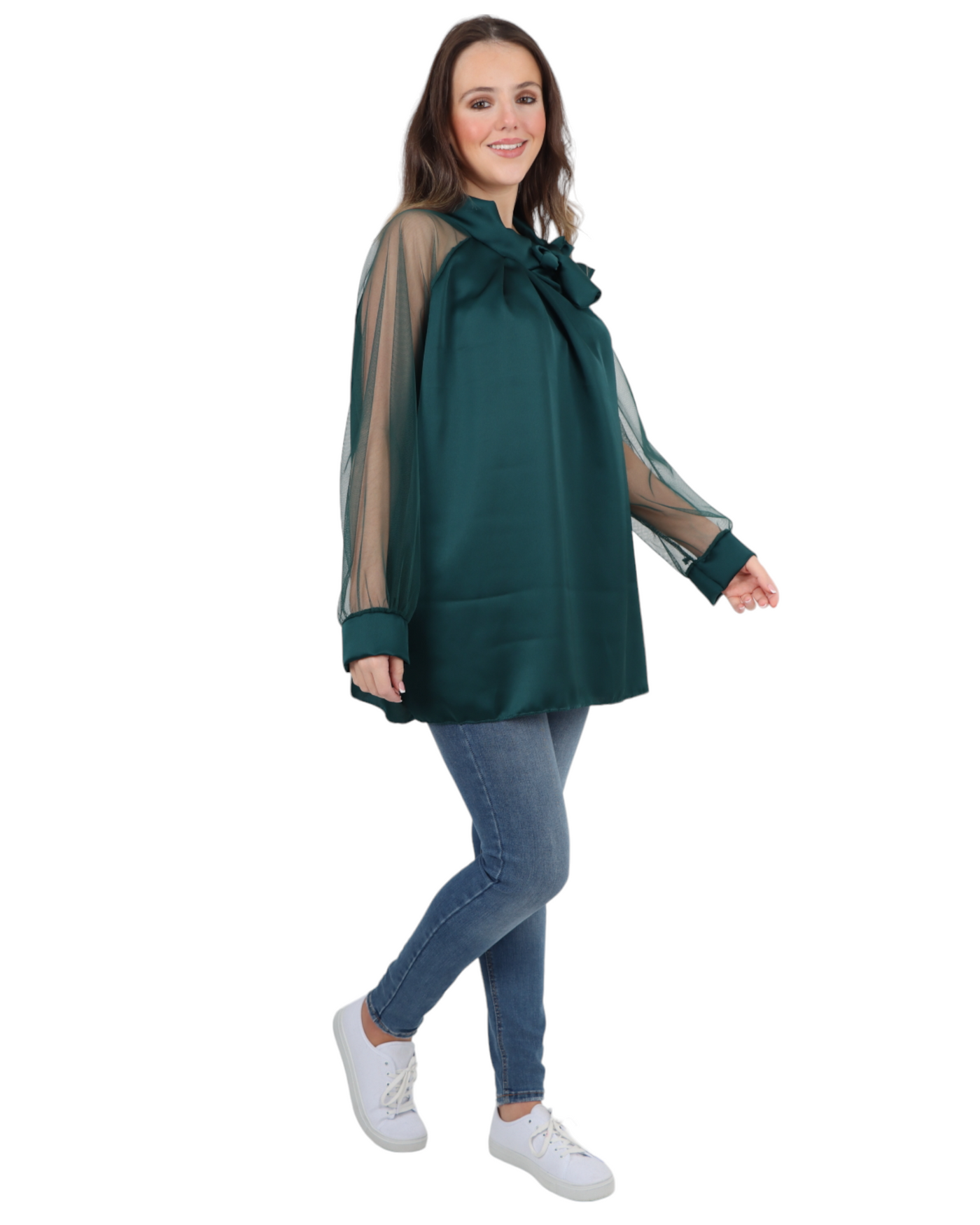 Made in Italy Mesh Net Sleeve Satin Tie Neck Top