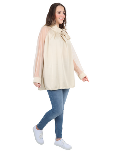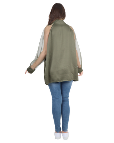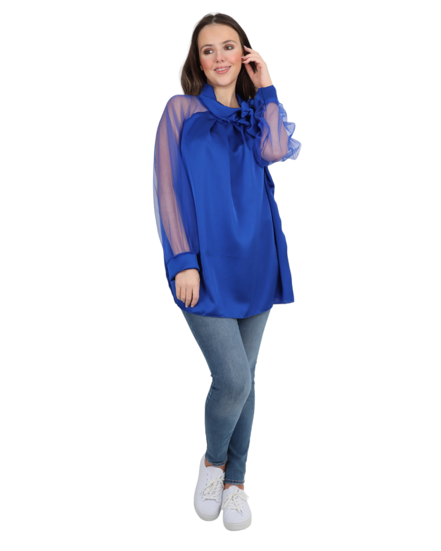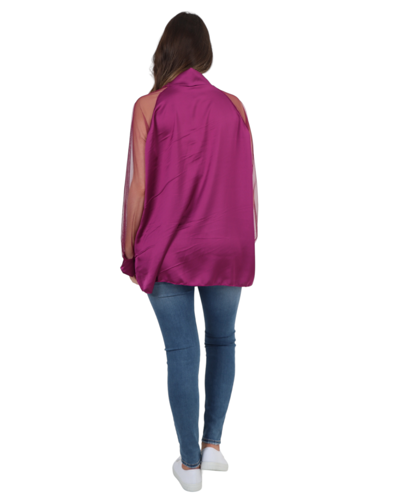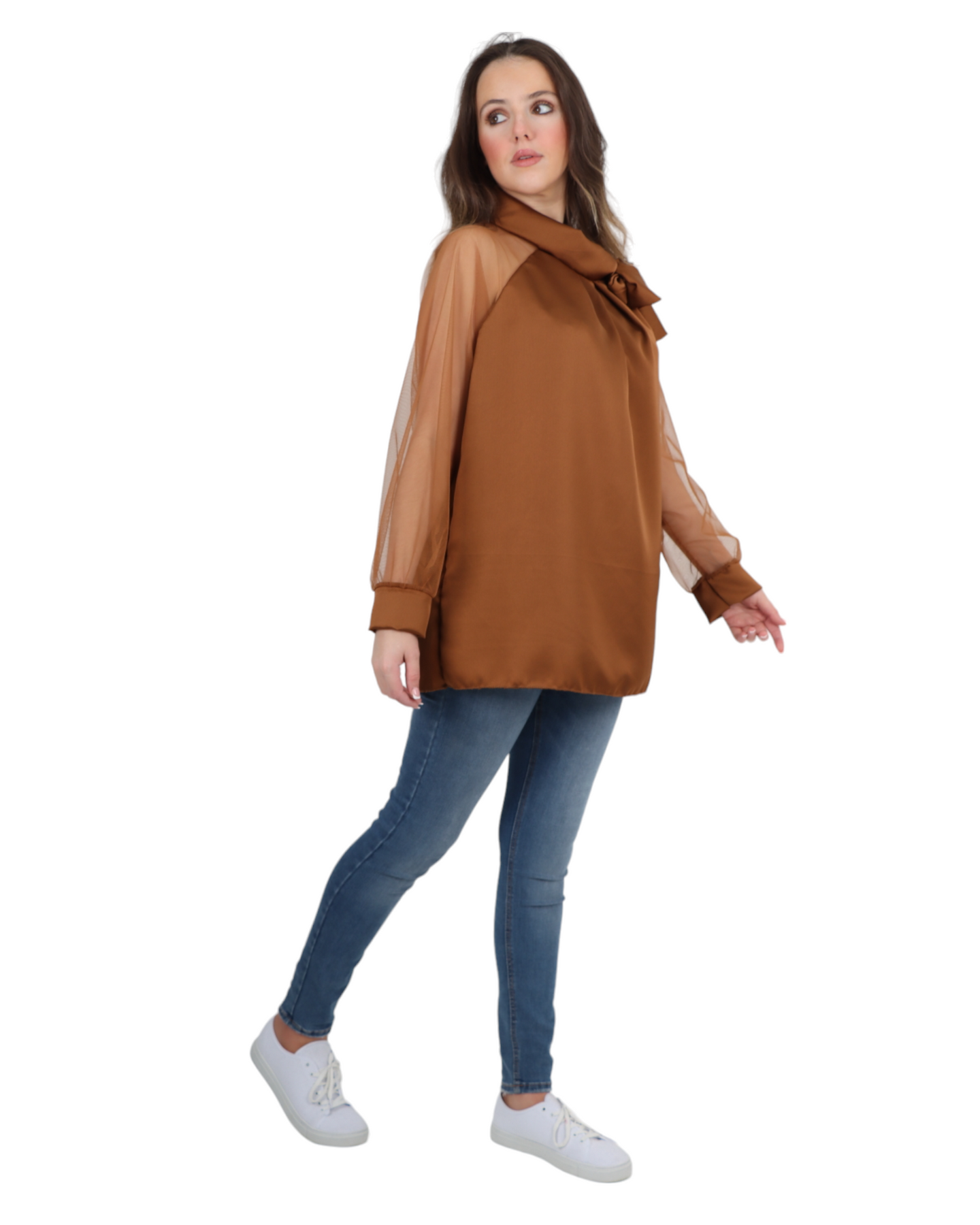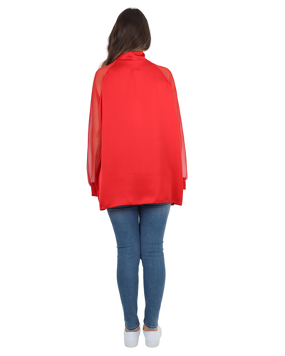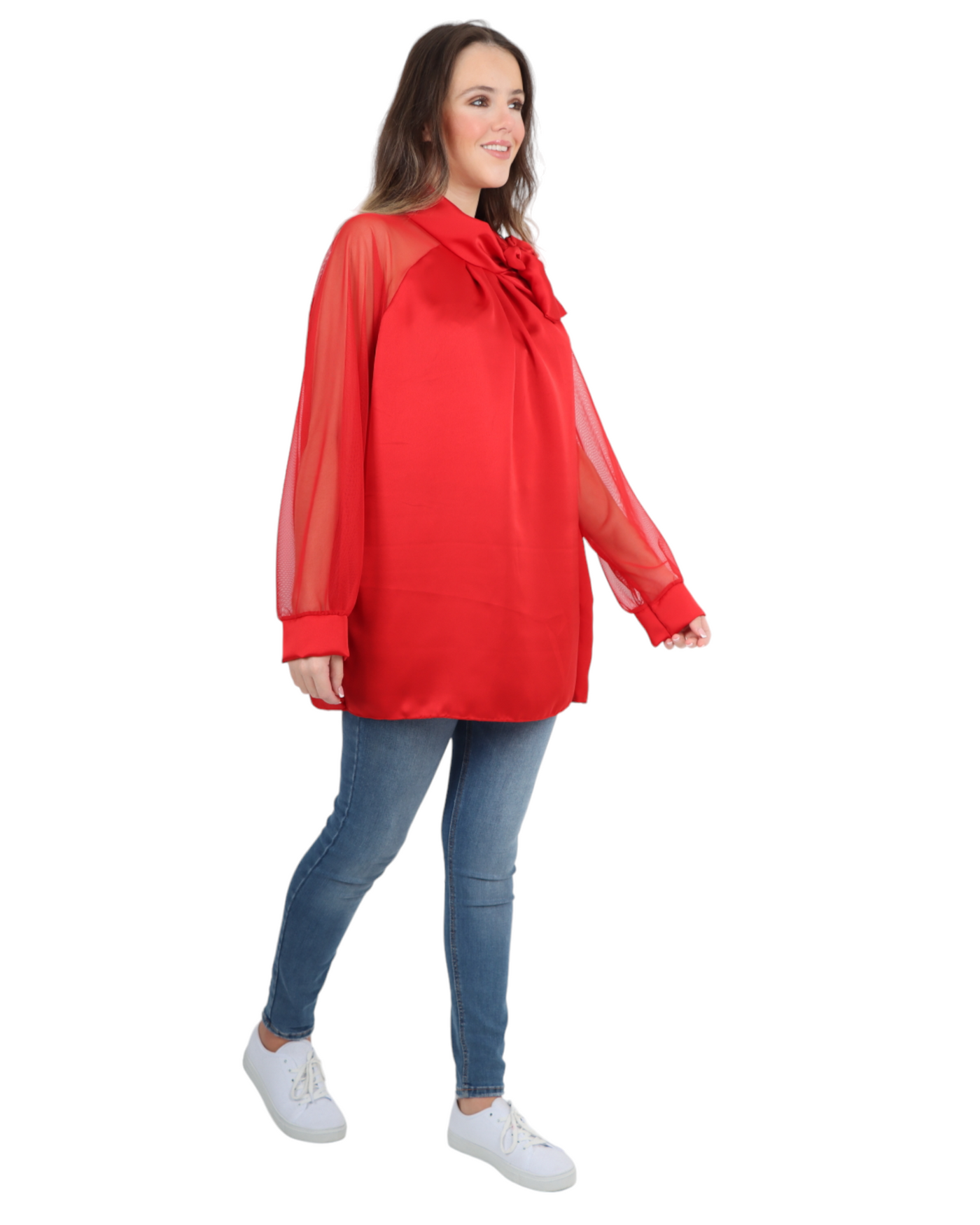 Made in Italy Mesh Net Sleeve Satin Tie Neck Top