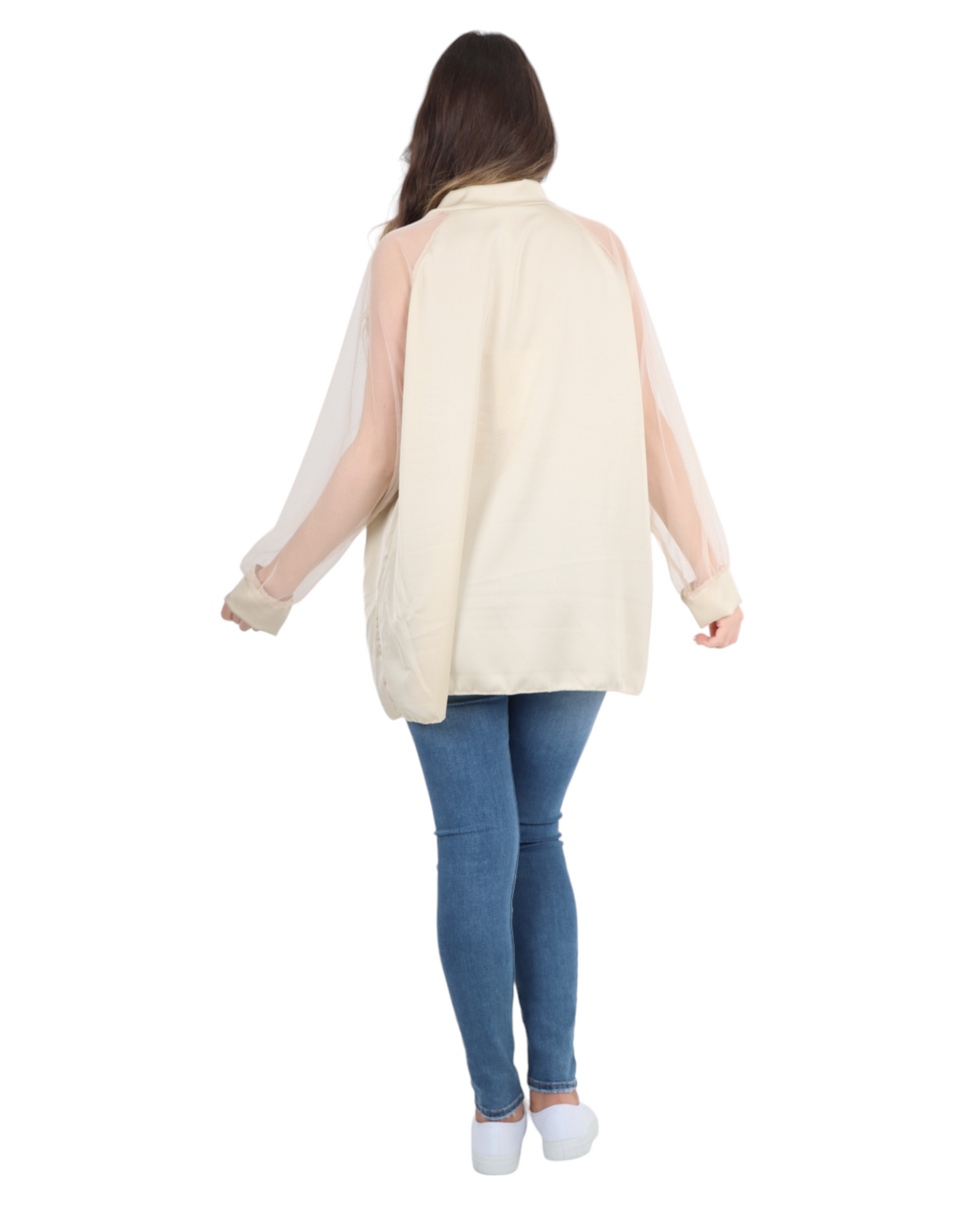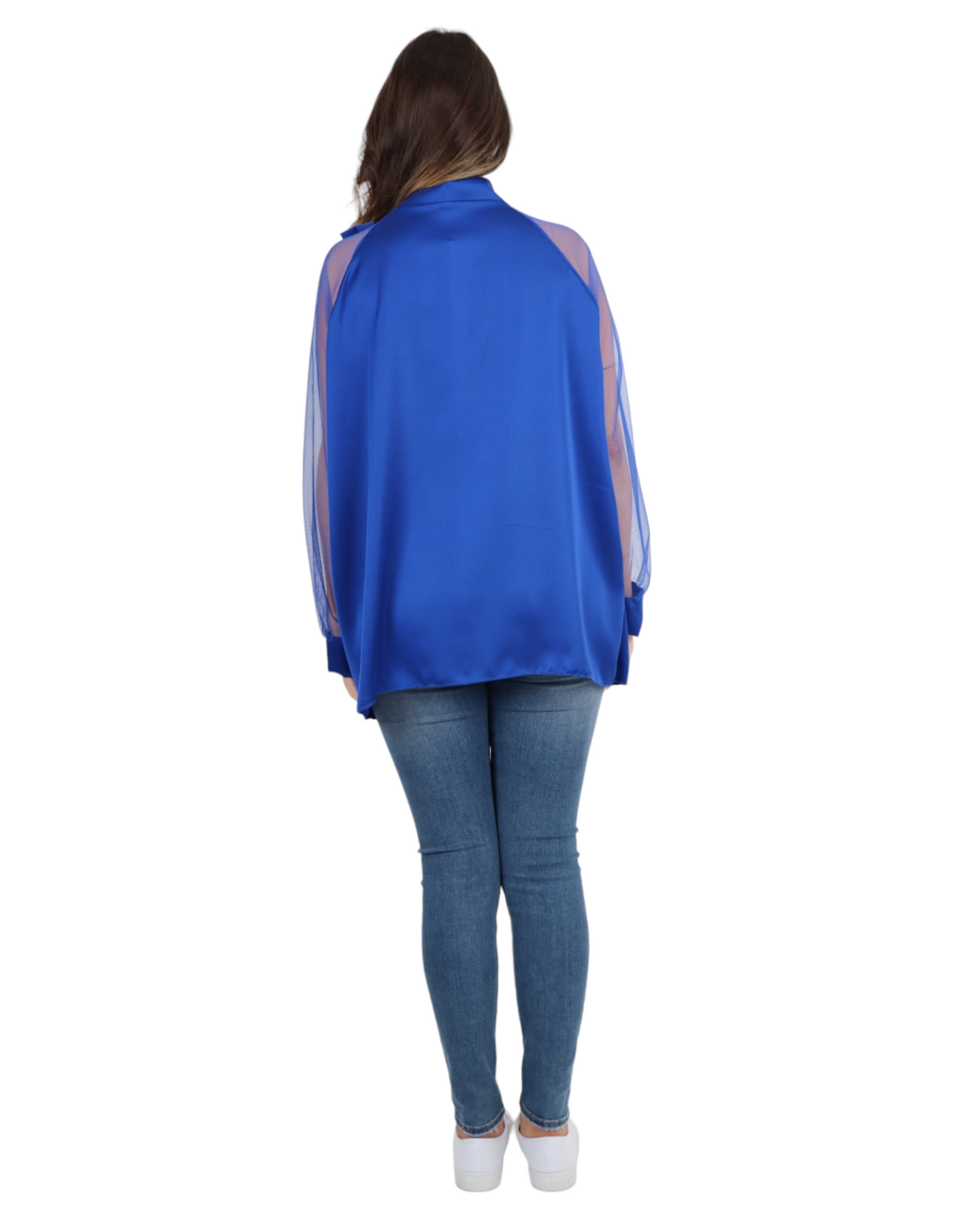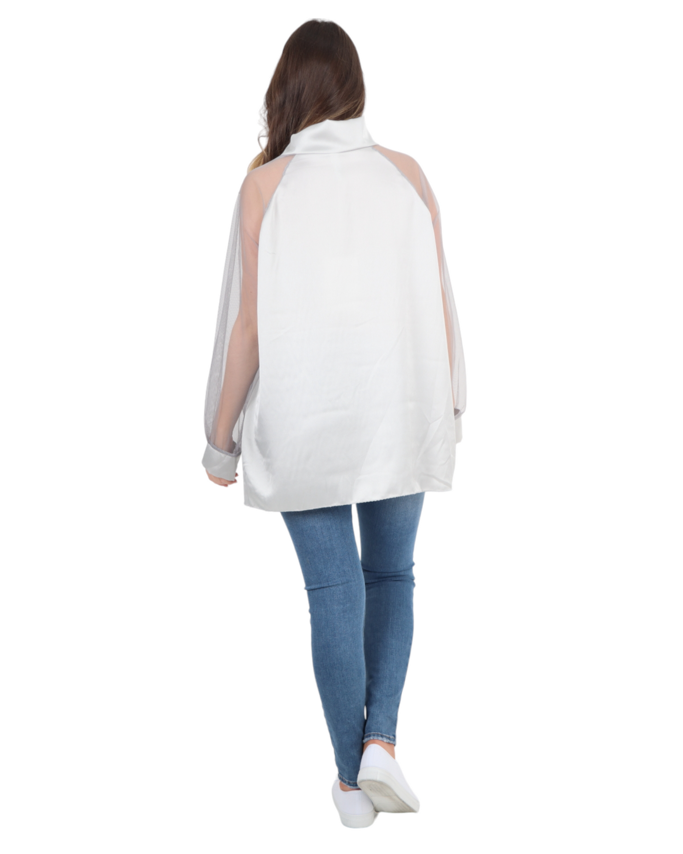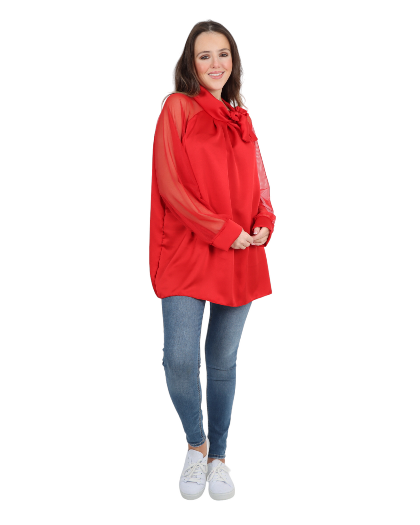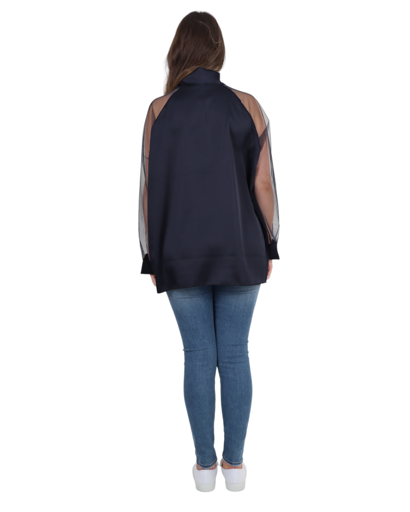 Made in Italy Mesh Net Sleeve Satin Tie Neck Top