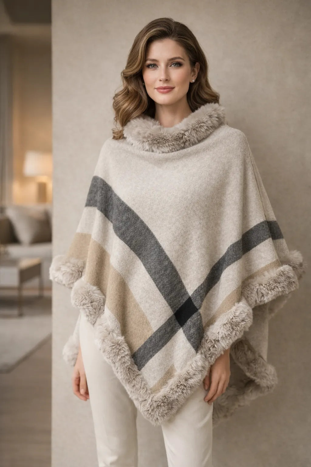 Stay cosy and stylish with this elegant Italian check print faux fur trim poncho knit top. Designed with a soft knit feel and luxurious faux fur edging, this poncho is perfect for autumn and winter layering. The classic check pattern adds a timeless boutique touch to your outfit.