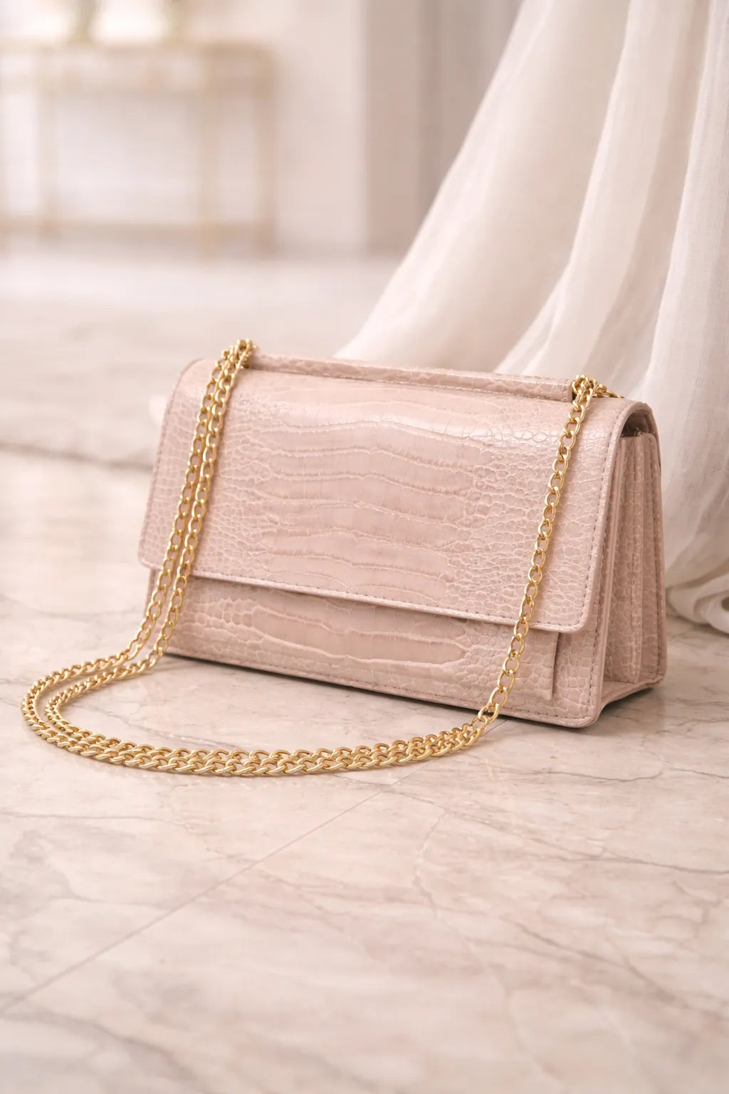 A stylish women’s croc-embossed crossbody bag featuring a structured shape, gold chain strap, and compact interior. Perfect for day-to-evening wear with a premium finish.